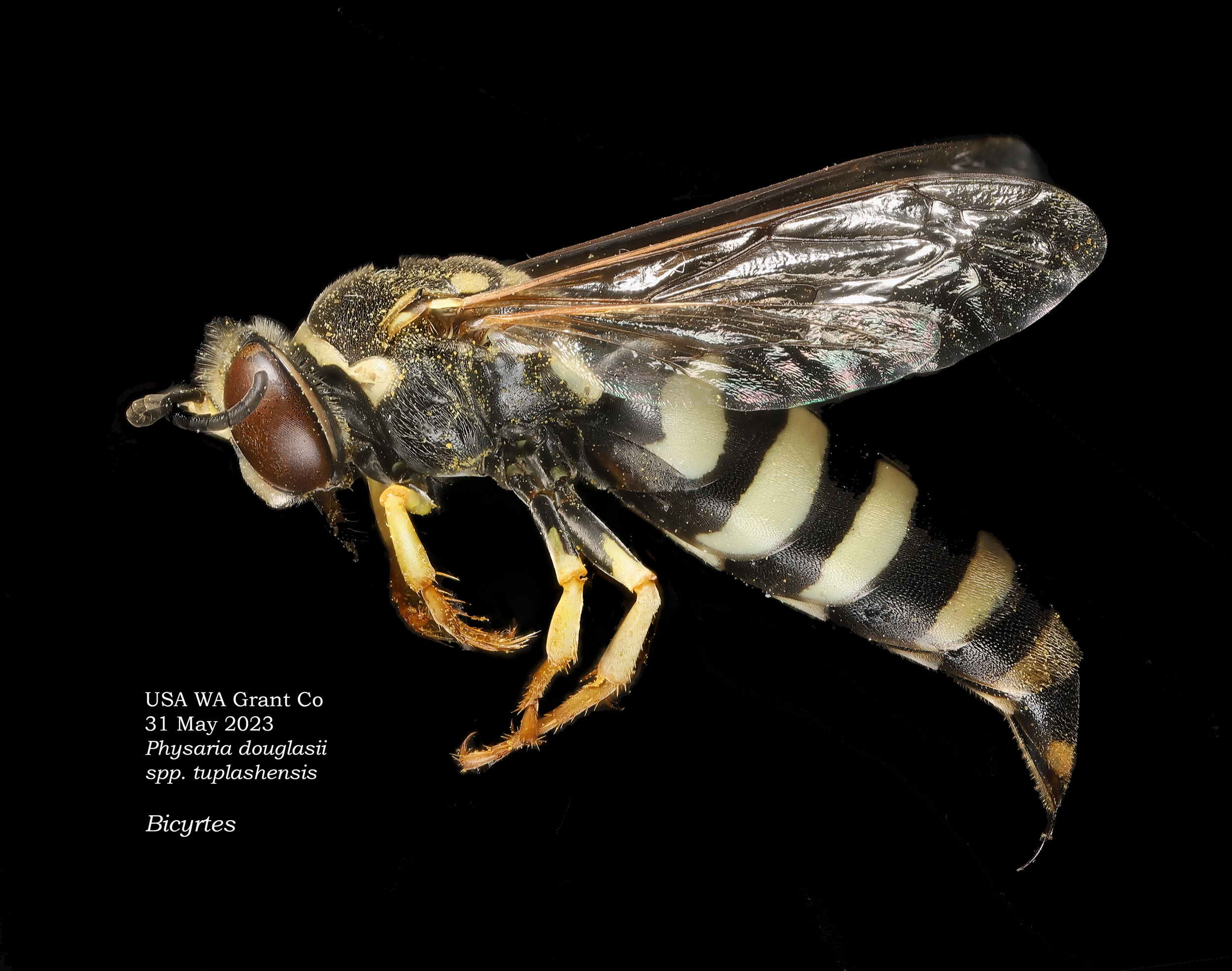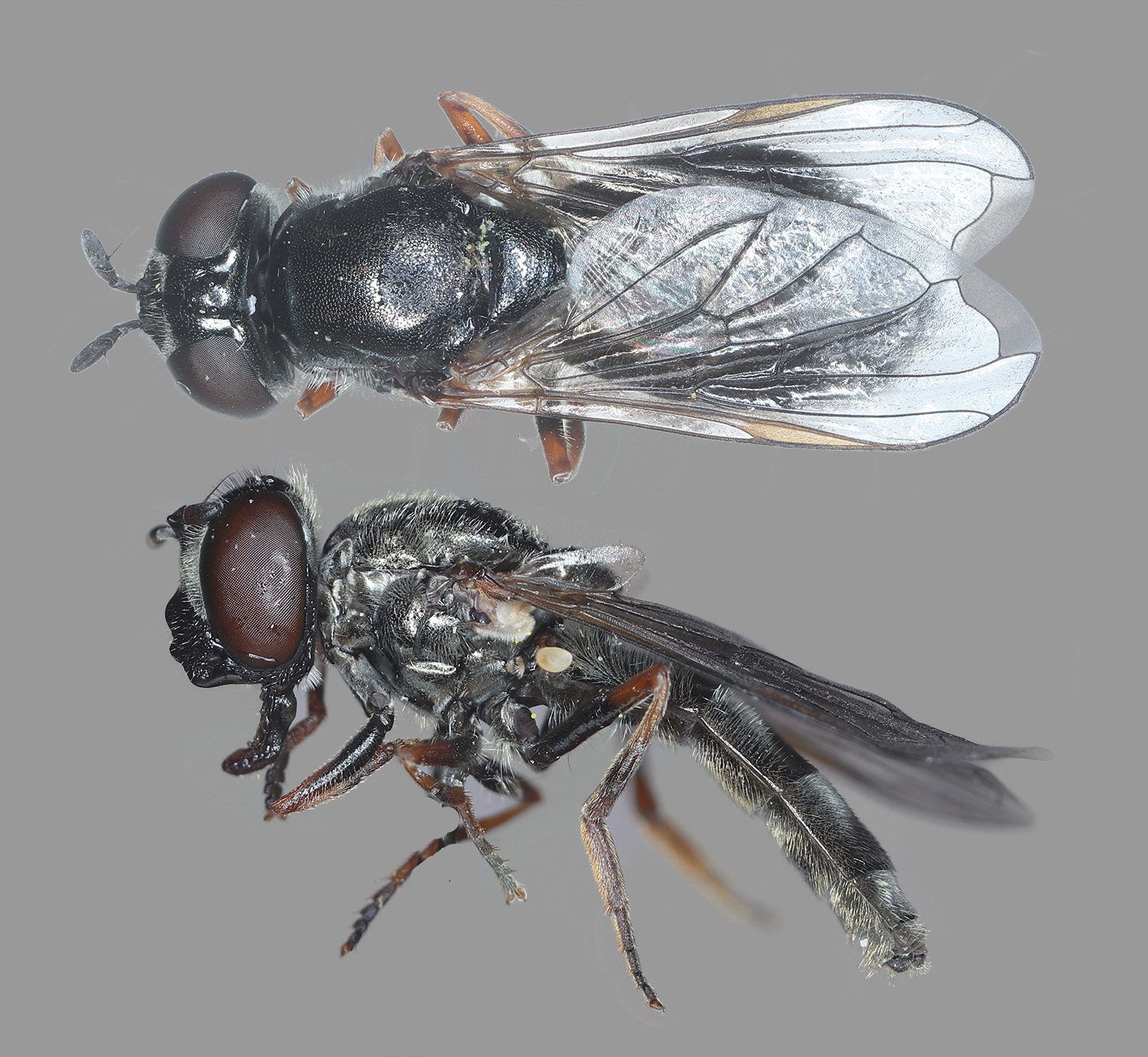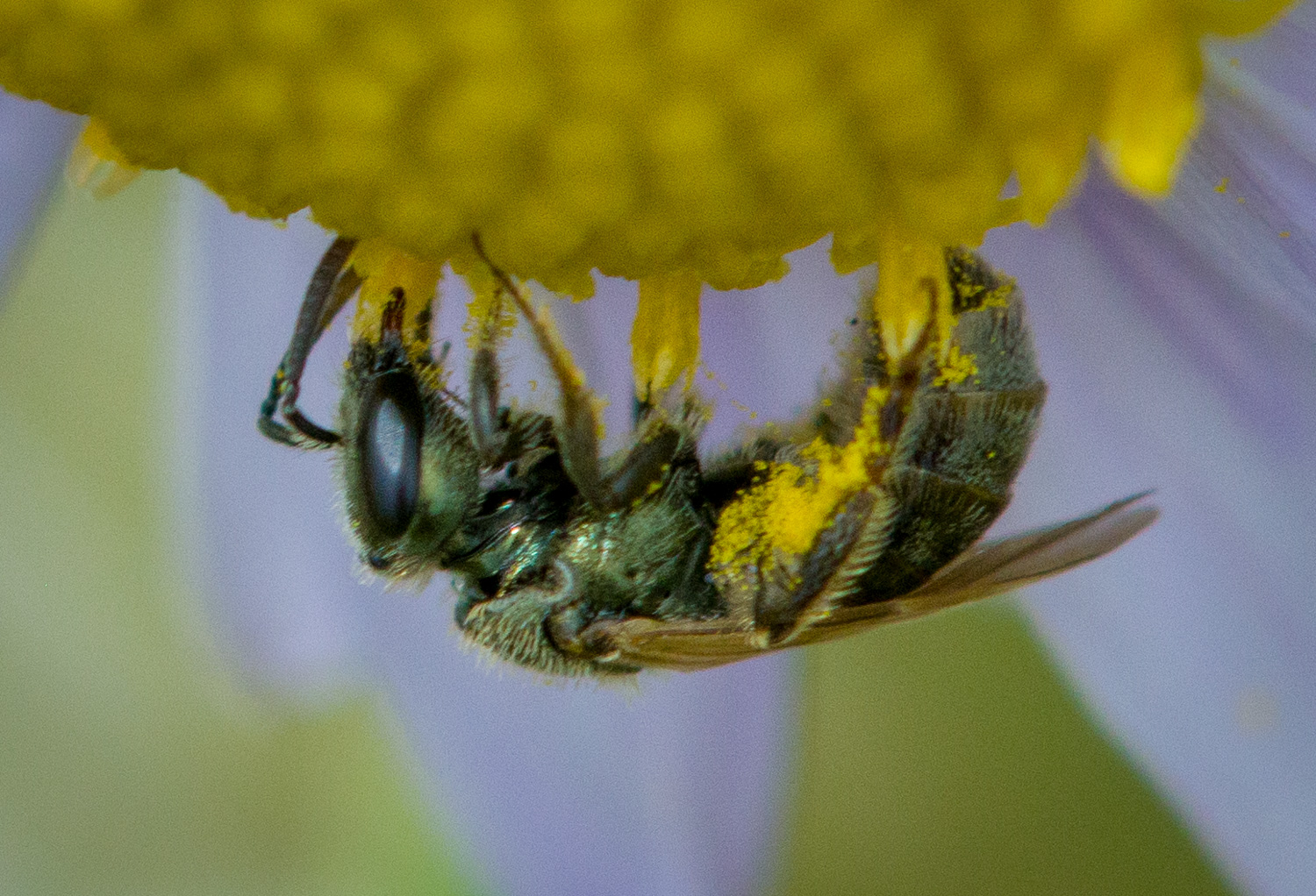 Platycheirus stegnus. Compare the sparse pollen load of the syrphids in this row with the pollen laden bees below. This highlights a perennial issue with visitation counts: Visitation frequency does not equal efficacy.