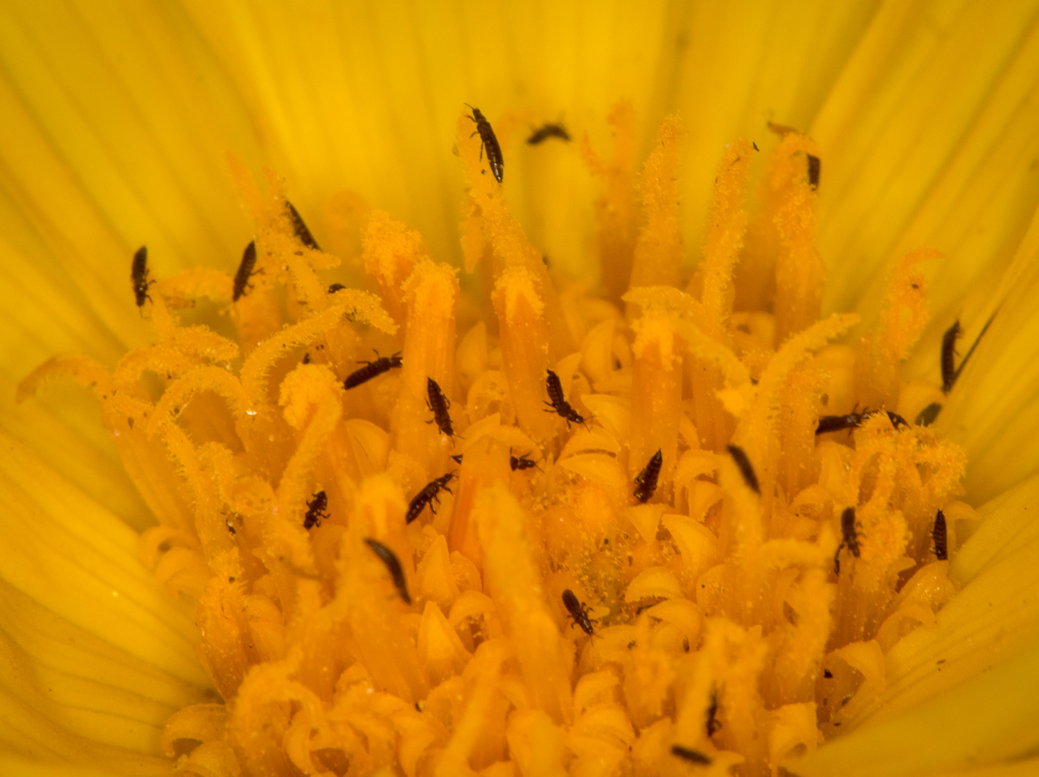 Thrips on Willamette daisy. Such an infestation is common in stressed plants.