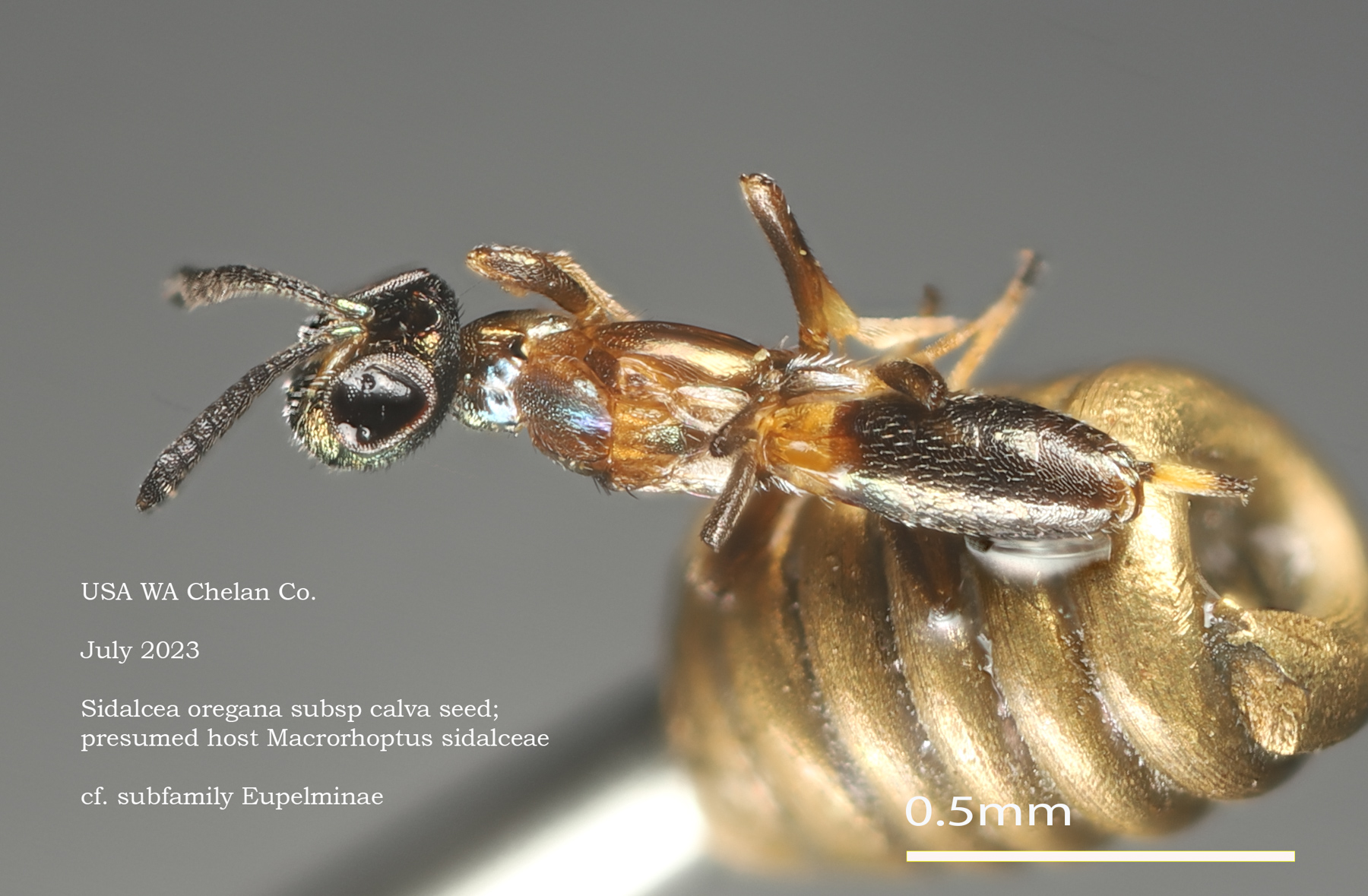 Pteromalid female, reared from most Sidalcea seed collections, including from S. oregana var. calva