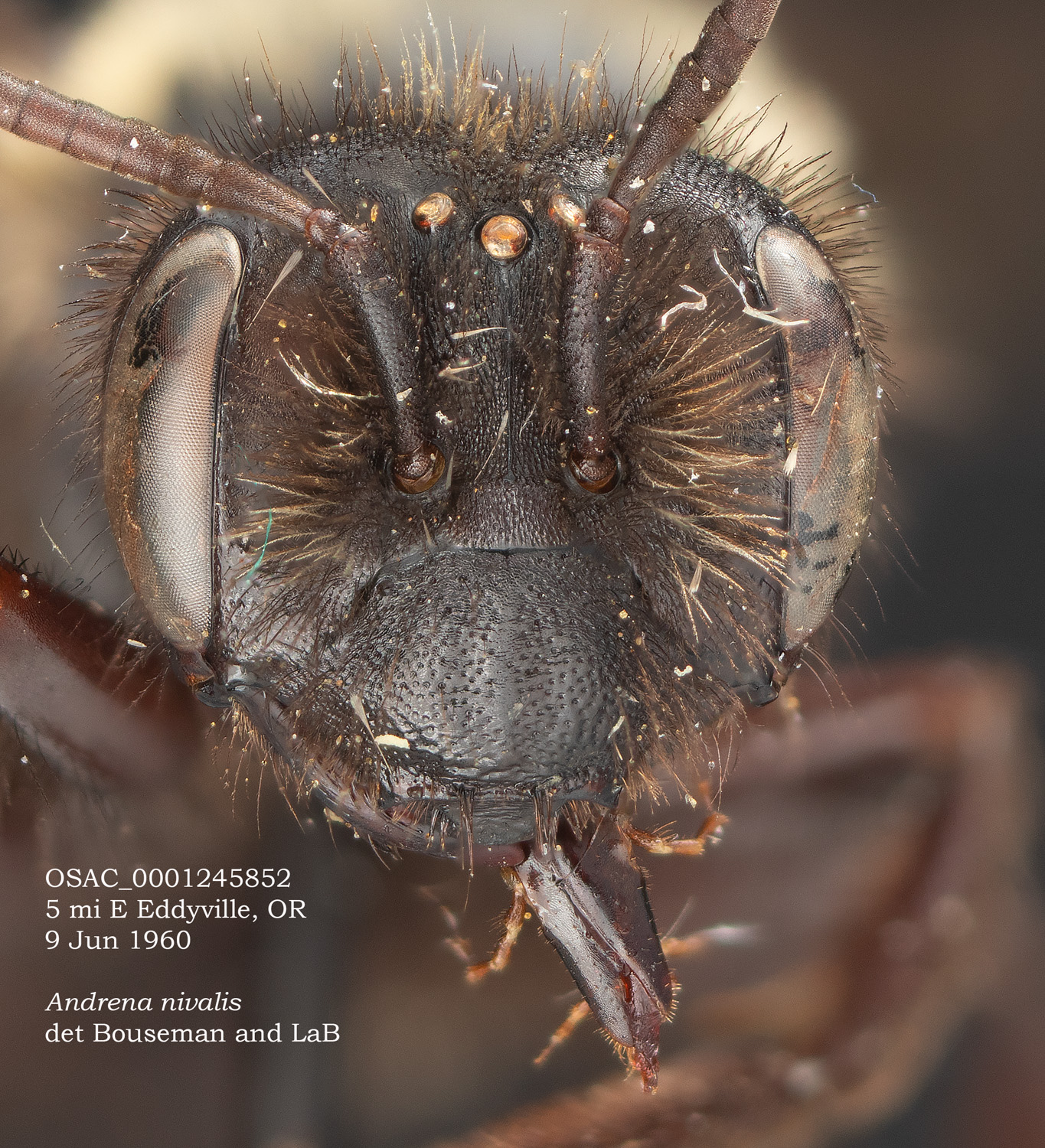 Assuming this is A. vicina, based on J.Ascher det, and the evidence. NOT A. regularis, which would have pale scopal hairs and uniform clypeal pitting. NOT A. carlini, which would have a modified pygidial plate, uniform trochanteral hairs, and a longer vertex. NOT A. nivalis: scopal hairs should be pale (in the east). Also, defintive if LeBerge is correct: "The female of nivalis can be separated from that of vicina by the lack of a median labral crista below the process, by the densely punctate scutellum ... Otherwise, the LeBerge nivalis description is frustratingly populated with statements of the form: "XXX as in vicina, except [subtle tiny difference]." |