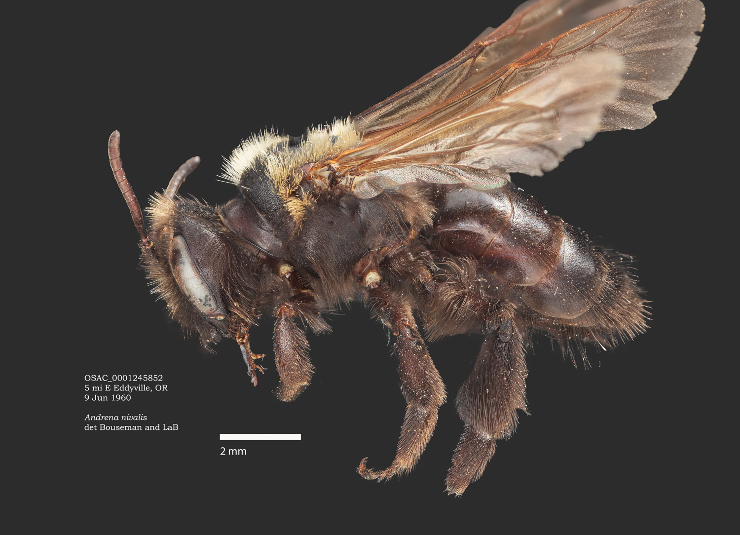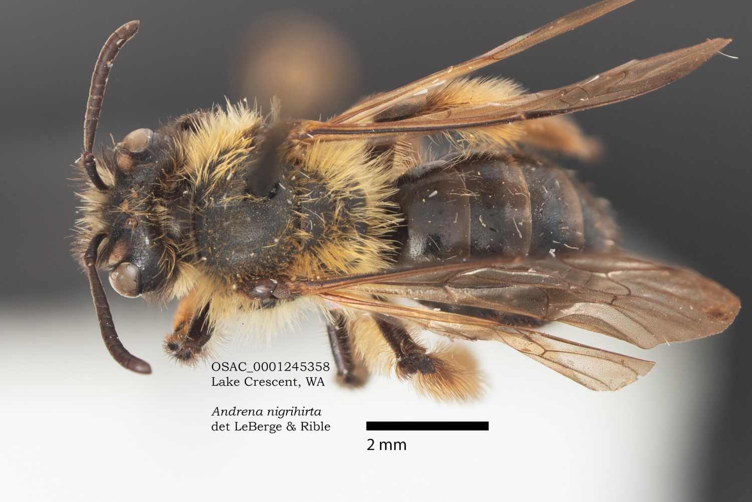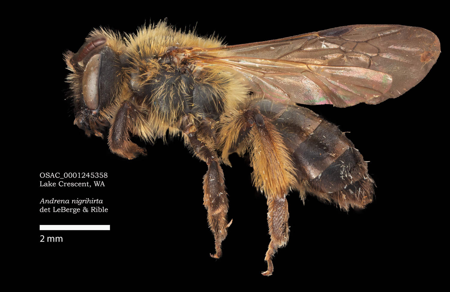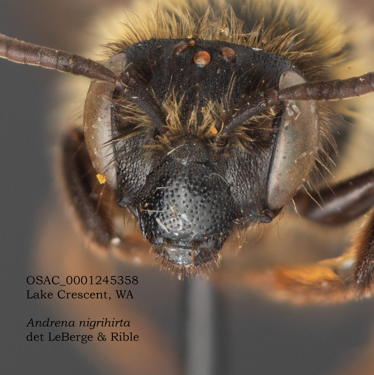 | I can't examine this specimen, but have images I made of one at the Oregon State Arthropod Collection. The determination is by LaBerge/Ribble. Traits evident in the photos do NOT yield A. nigrihirta in Discoverlife ... unless I can be persuaded that lower episternal hairs are dark. |