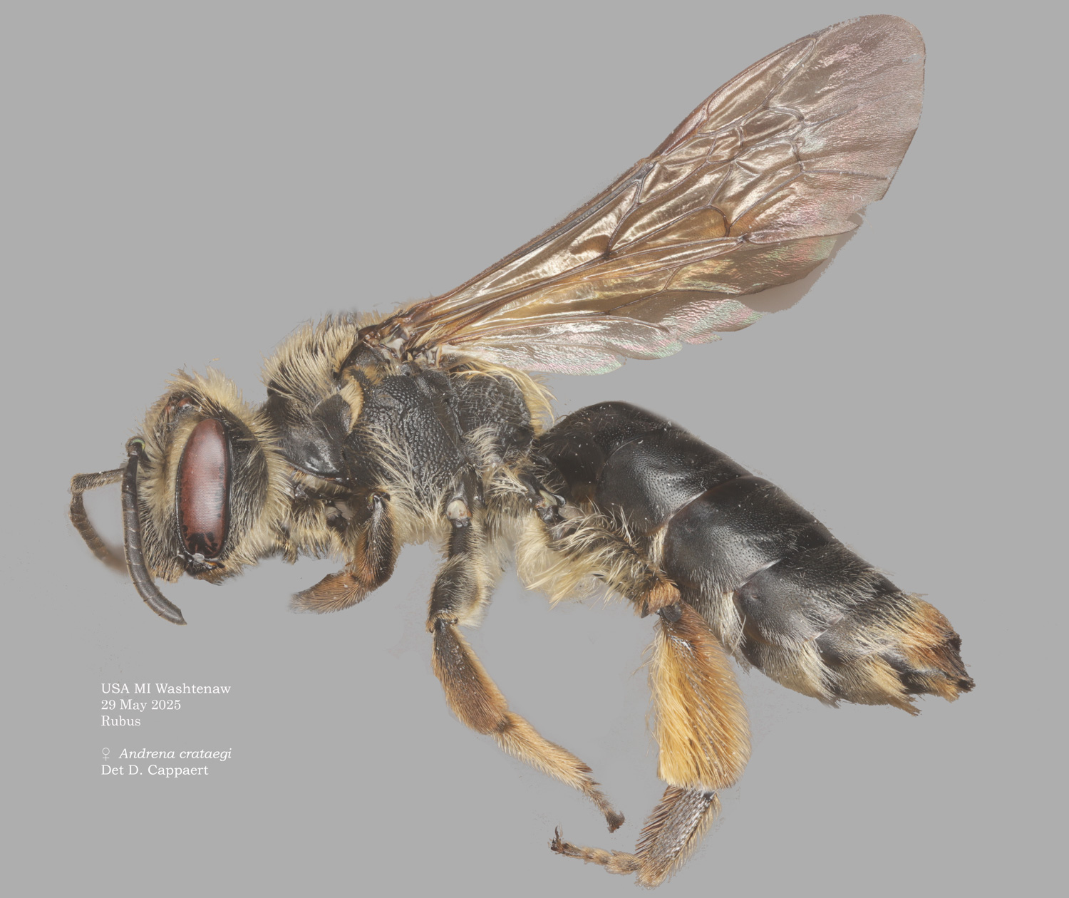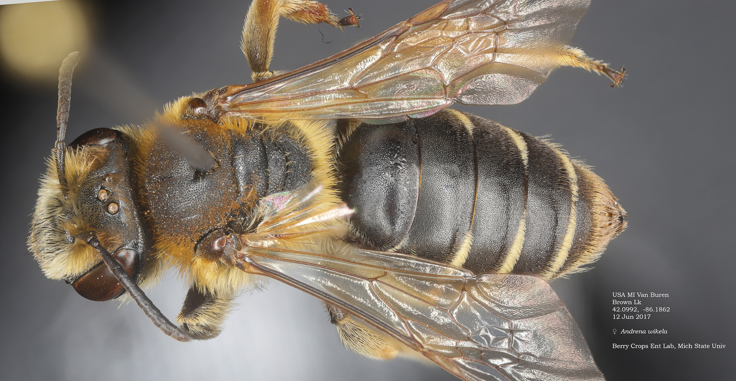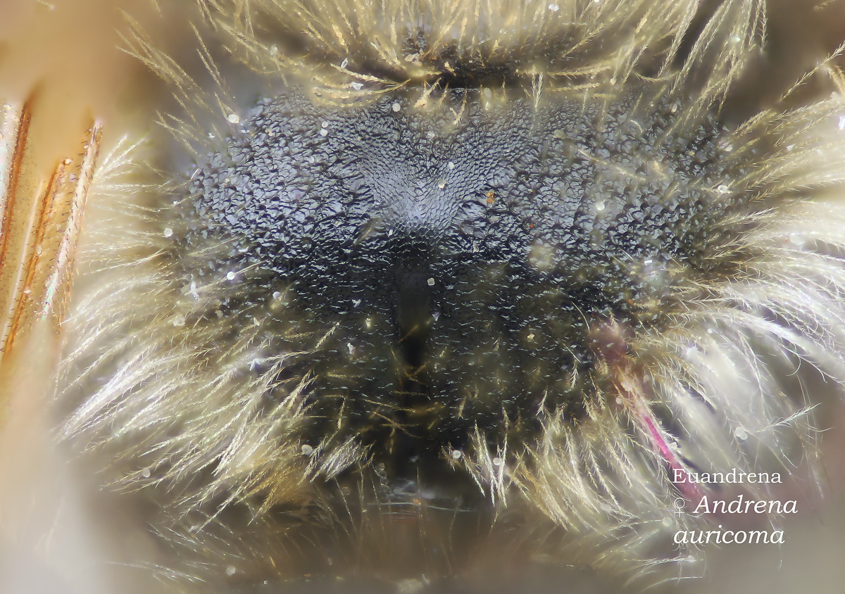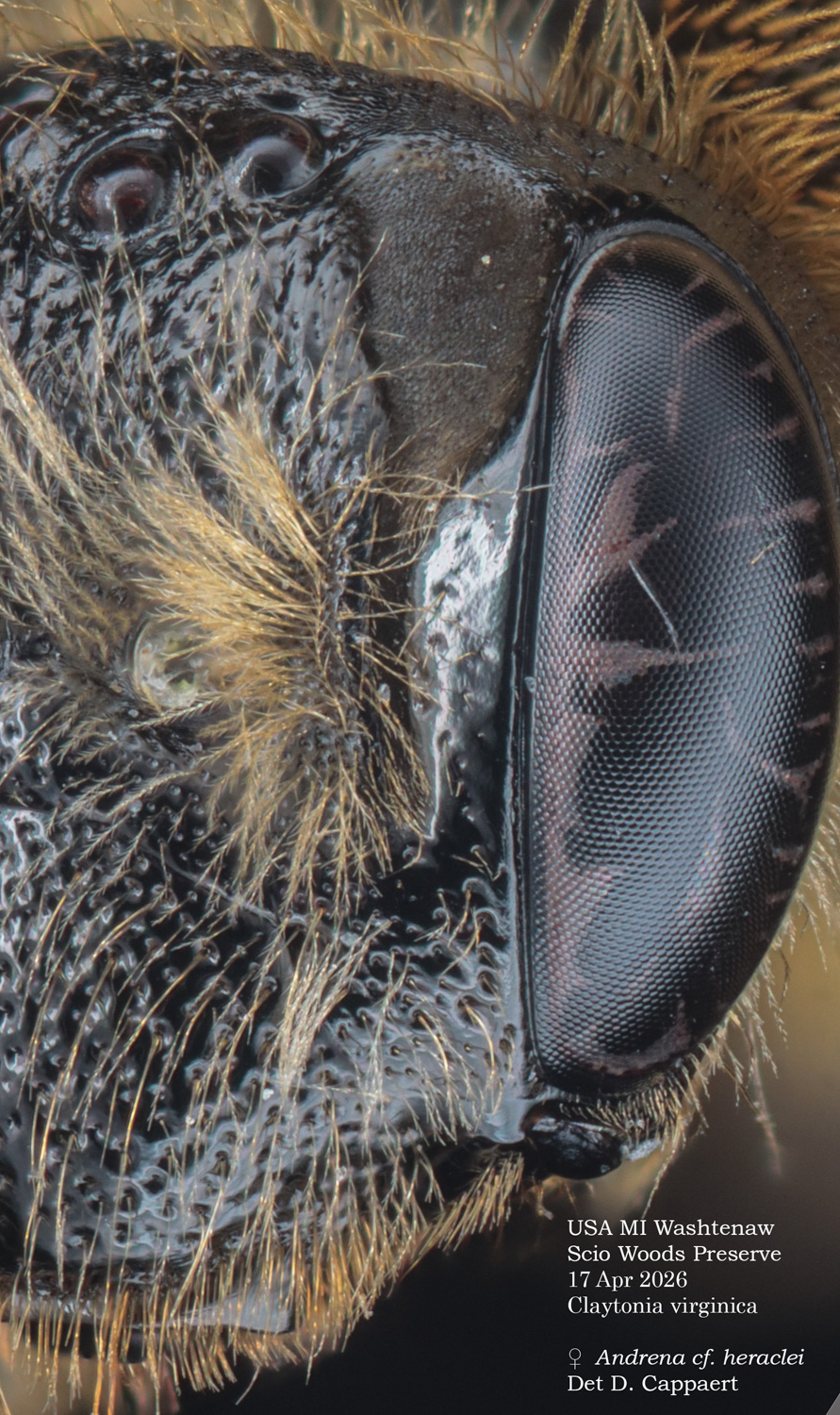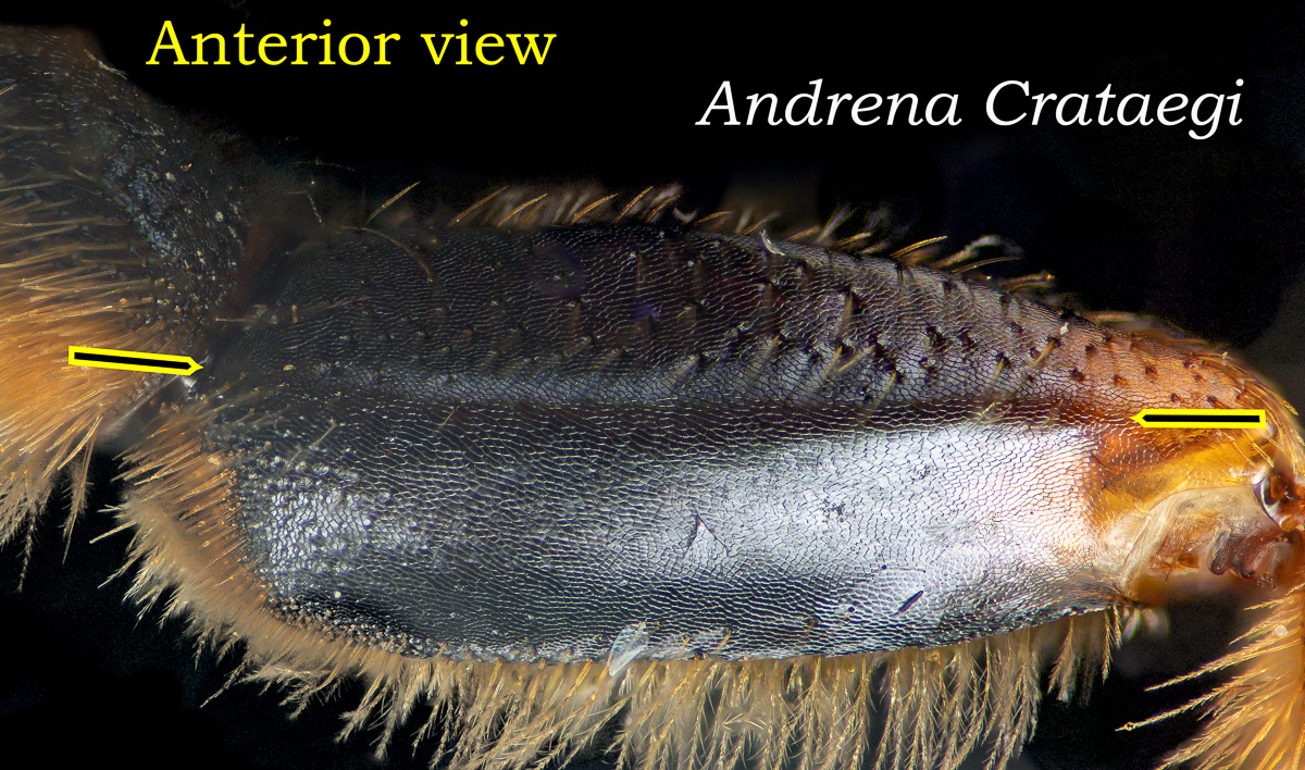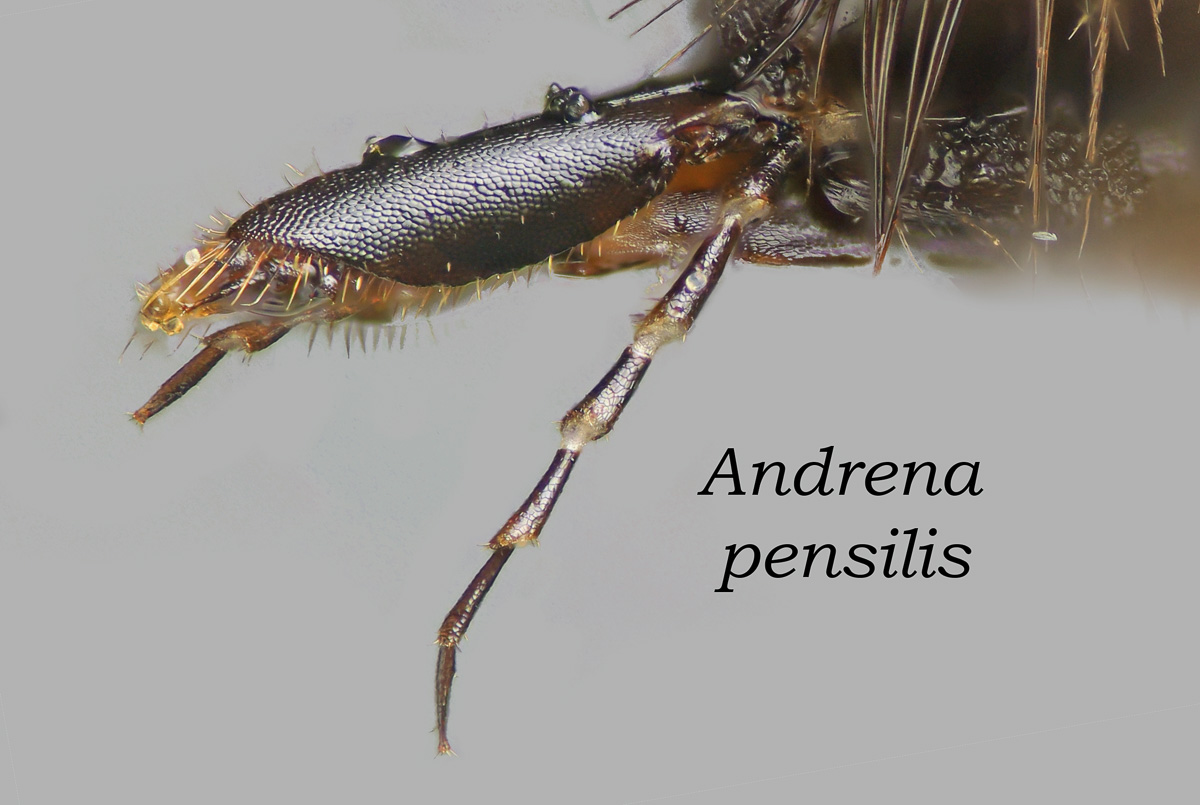 | Shortcut: At a glance, this Michigan specimen is a look-alike to the preceding Oregon A. crataegi. Not shown here ..,. but it exhibits the same deep sculpturing of the delineated propodeal triangle-- a possible Trachandrena. One feature separates this one from any similars in Michigan: strongly curved hind tibial spur. If I am right about both the OR and MI specimens, I can infer common features as typical of the species. E.g., remarkably orange tibial hairs. |
