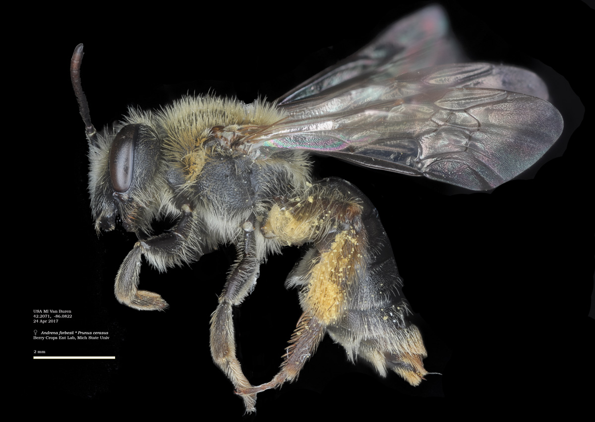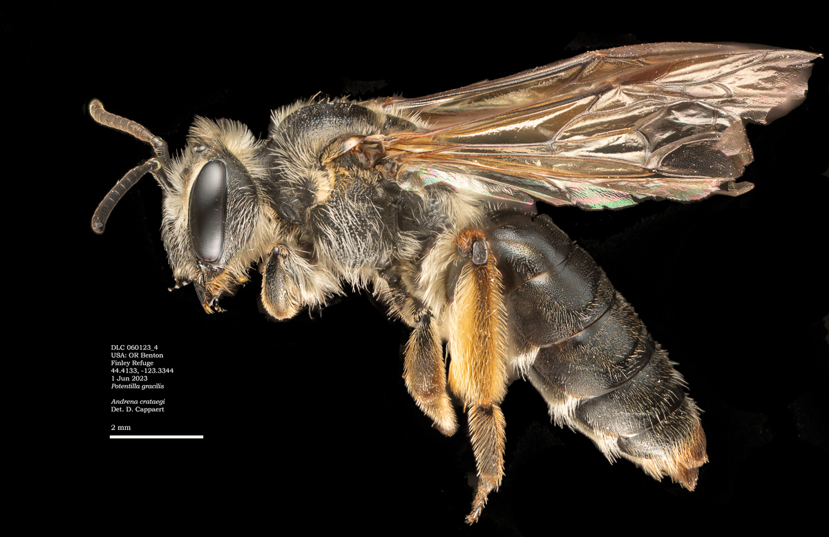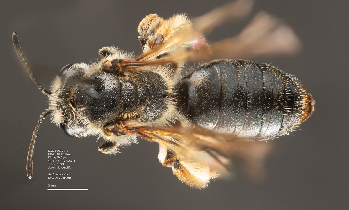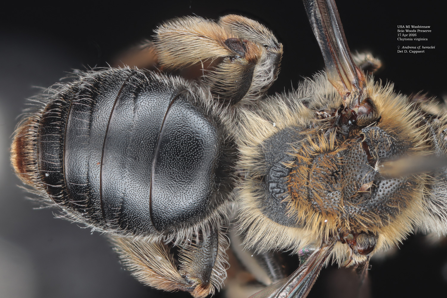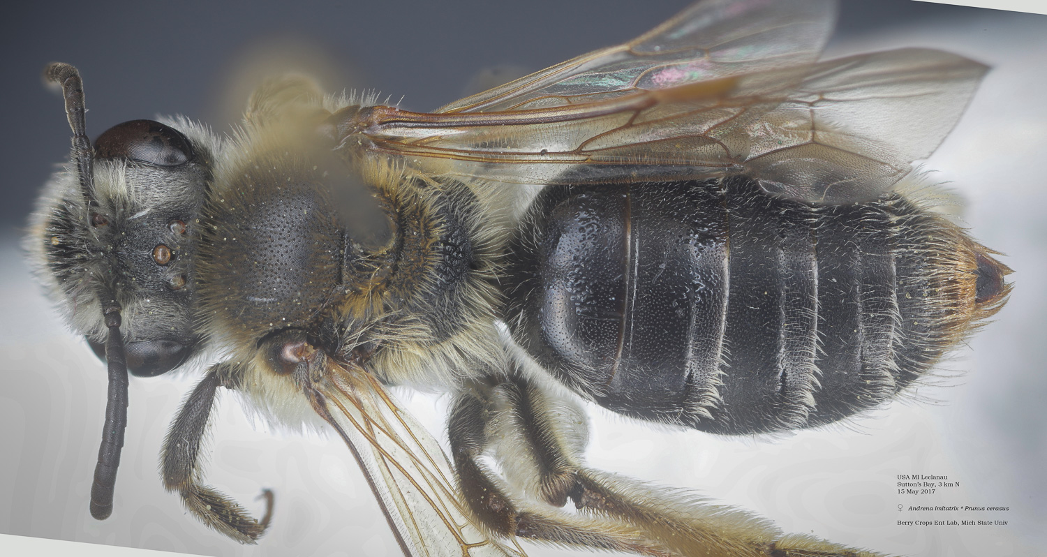 | Shortcut: At a glance, this Michigan specimen is a look-alike to the preceding Oregon A. crataegi. Not shown here ..,. but it exhibits the same deep sculpturing of the delineated propodeal triangle-- a possible Trachandrena. One feature separates this one from any similars in Michigan: strongly curved hind tibial spur. If I am right about both the OR and MI specimens, I can infer common features as typical of the species. E.g., remarkably orange tibial hairs. |