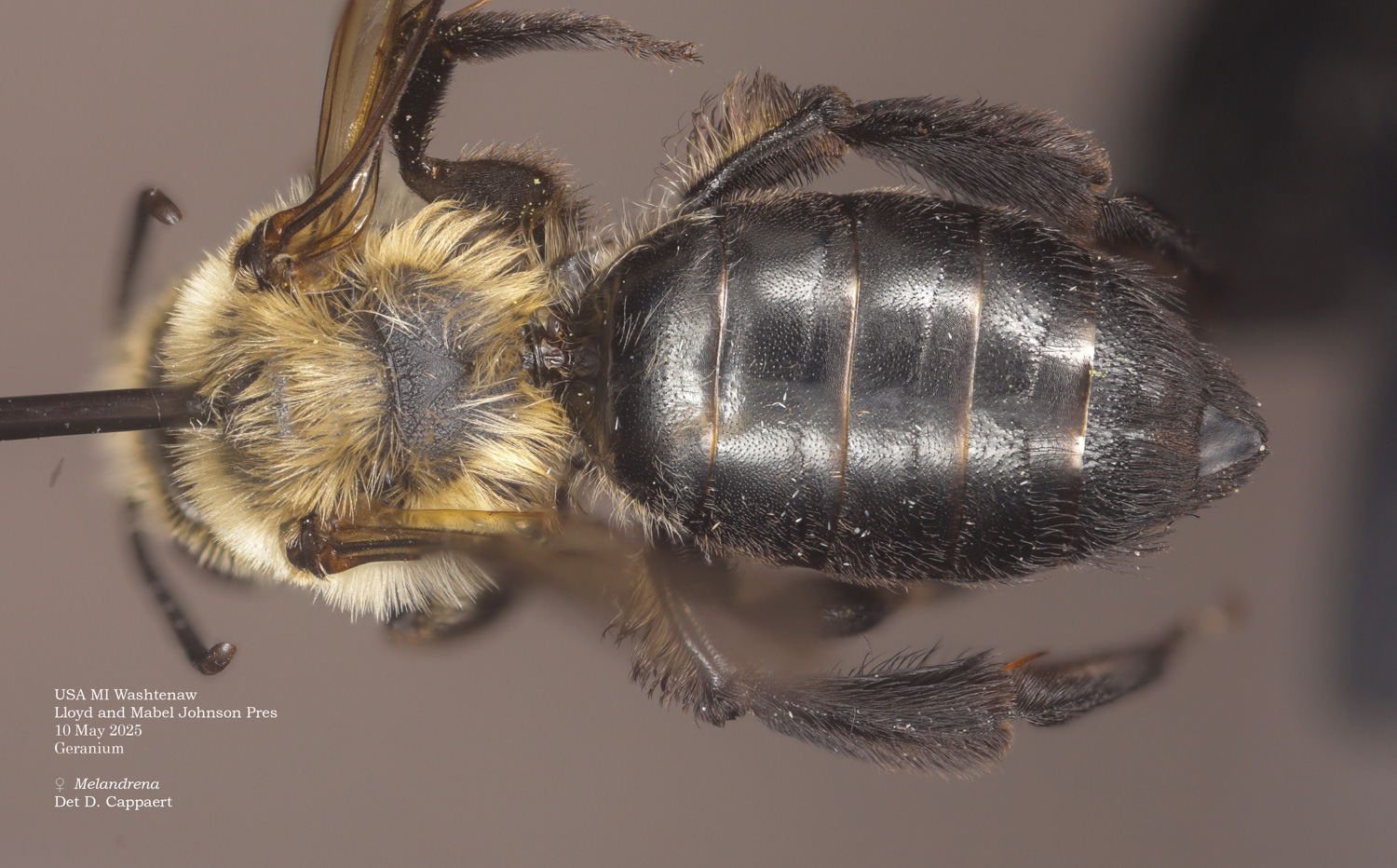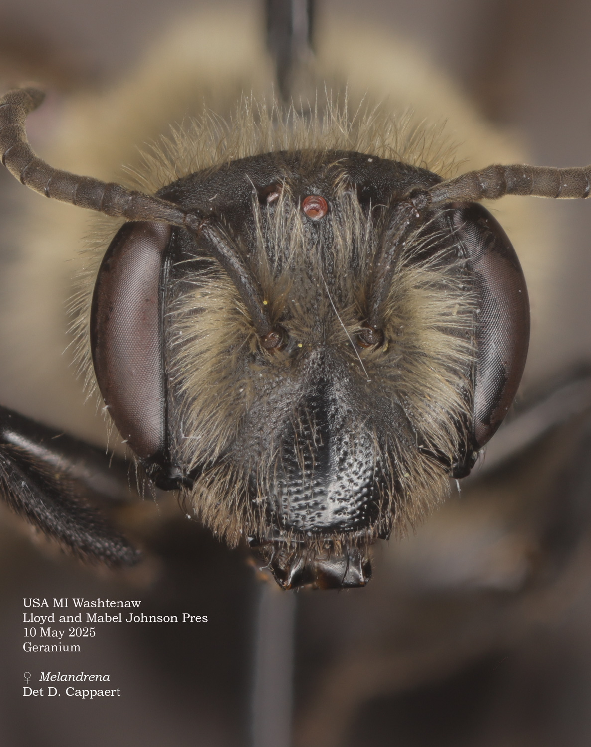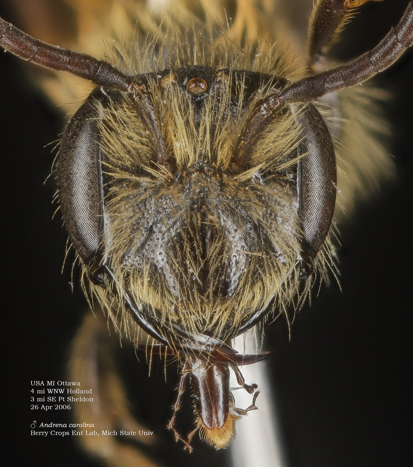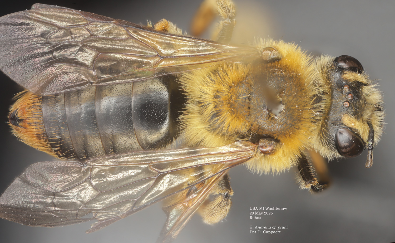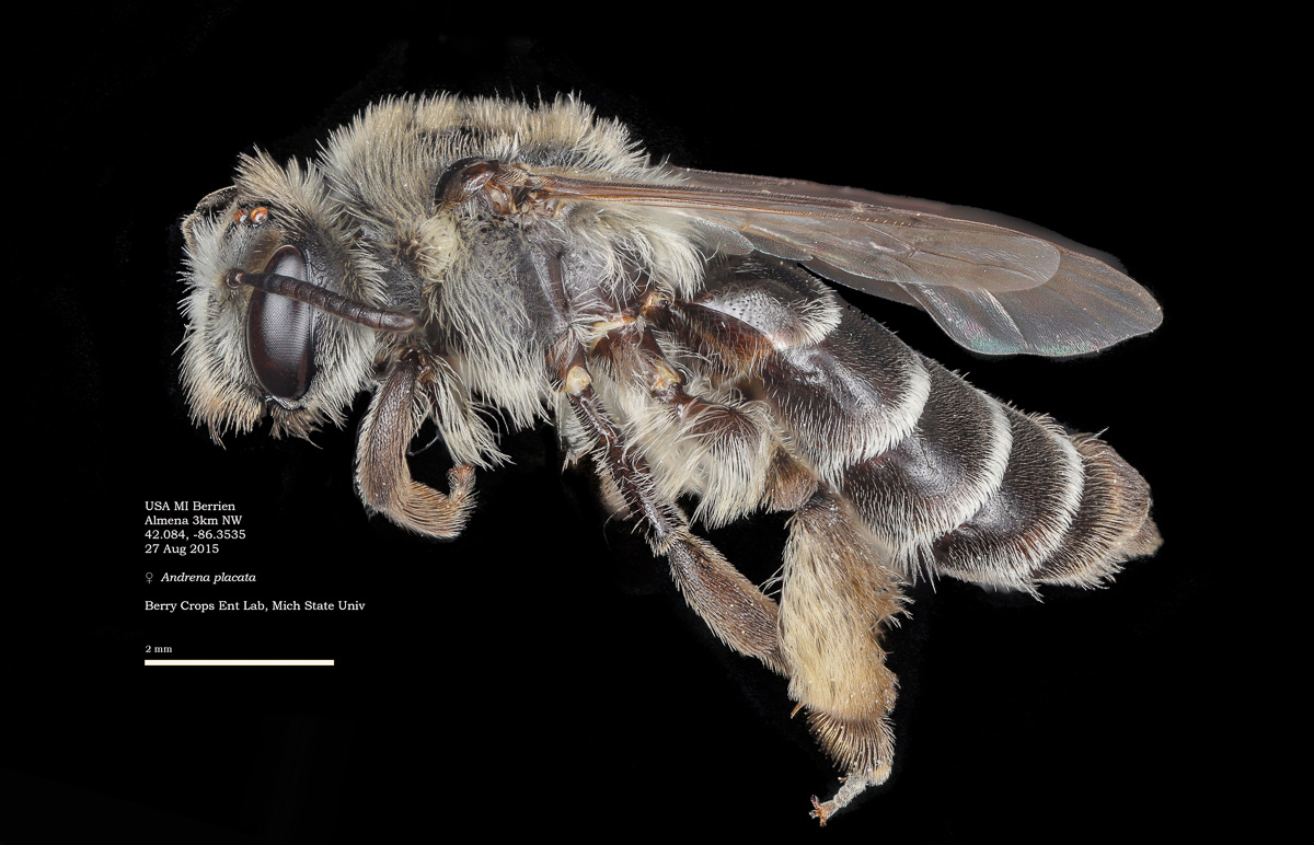 | Shortcut: At a glance, this Michigan specimen is a look-alike to the preceding Oregon A. crataegi. Not shown here ..,. but it exhibits the same deep sculpturing of the delineated propodeal triangle-- a possible Trachandrena. One feature separates this one from any similars in Michigan: strongly curved hind tibial spur. If I am right about both the OR and MI specimens, I can infer common features as typical of the species. E.g., remarkably orange tibial hairs. |
