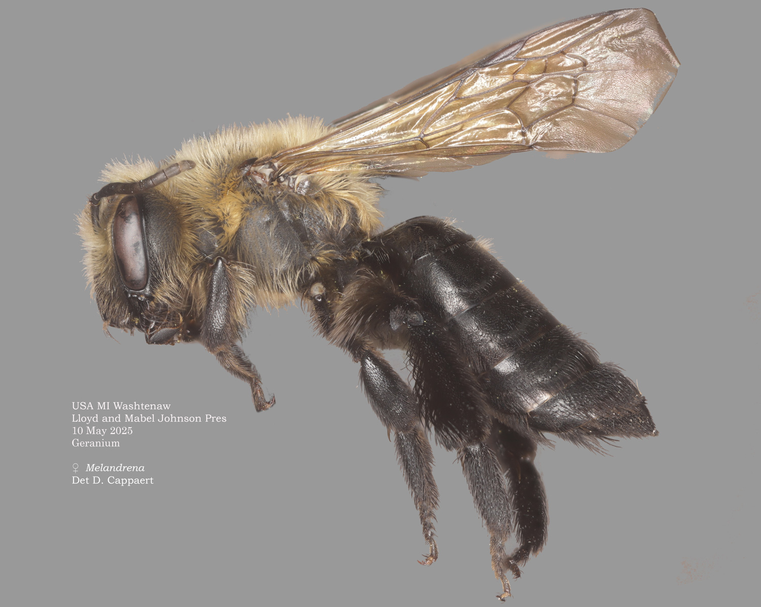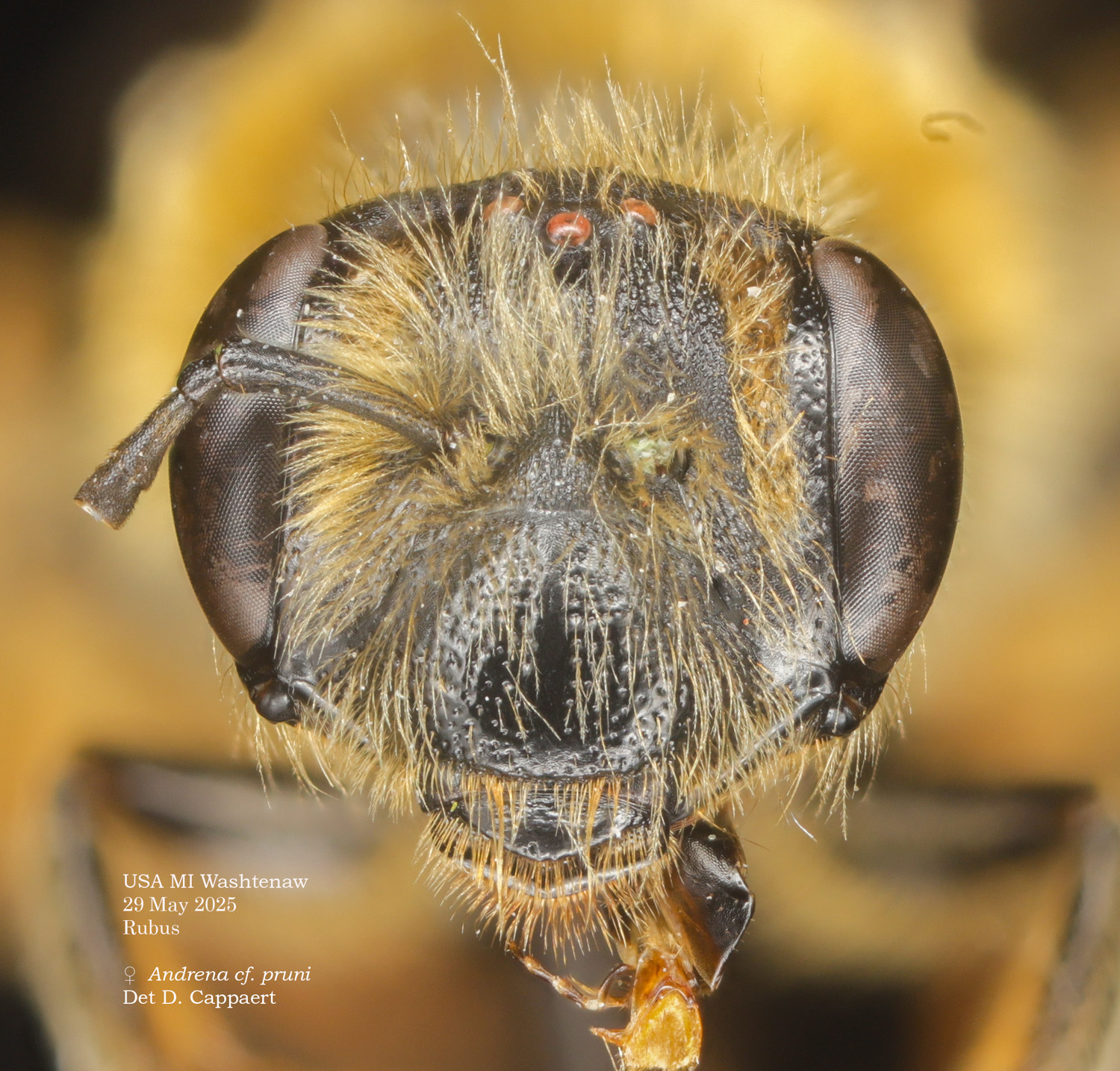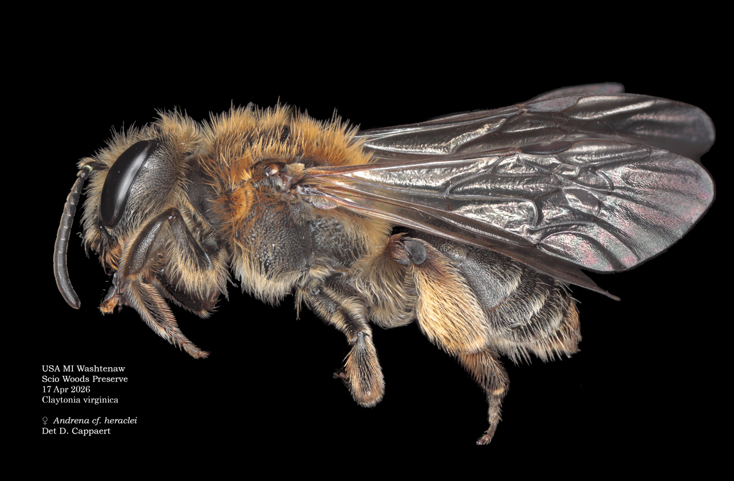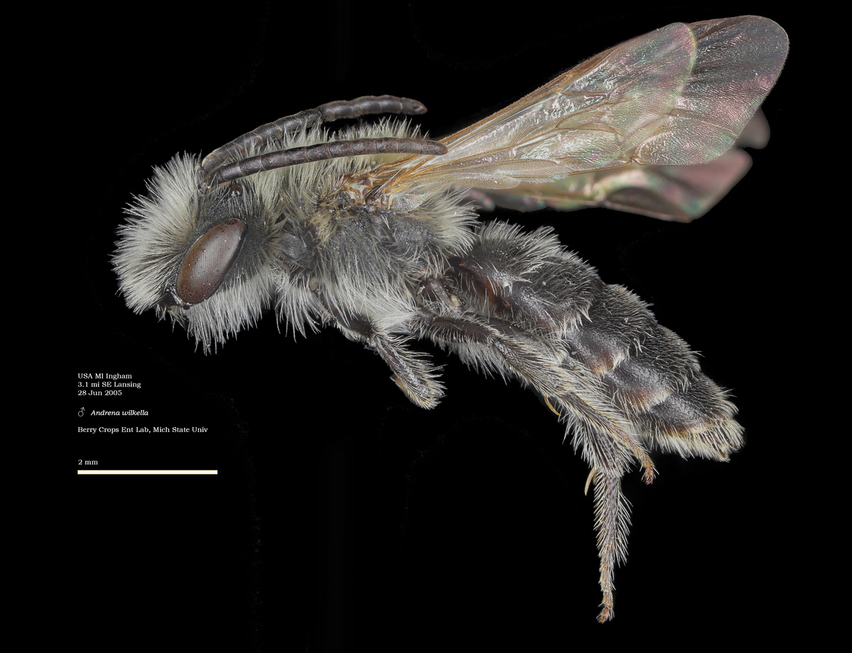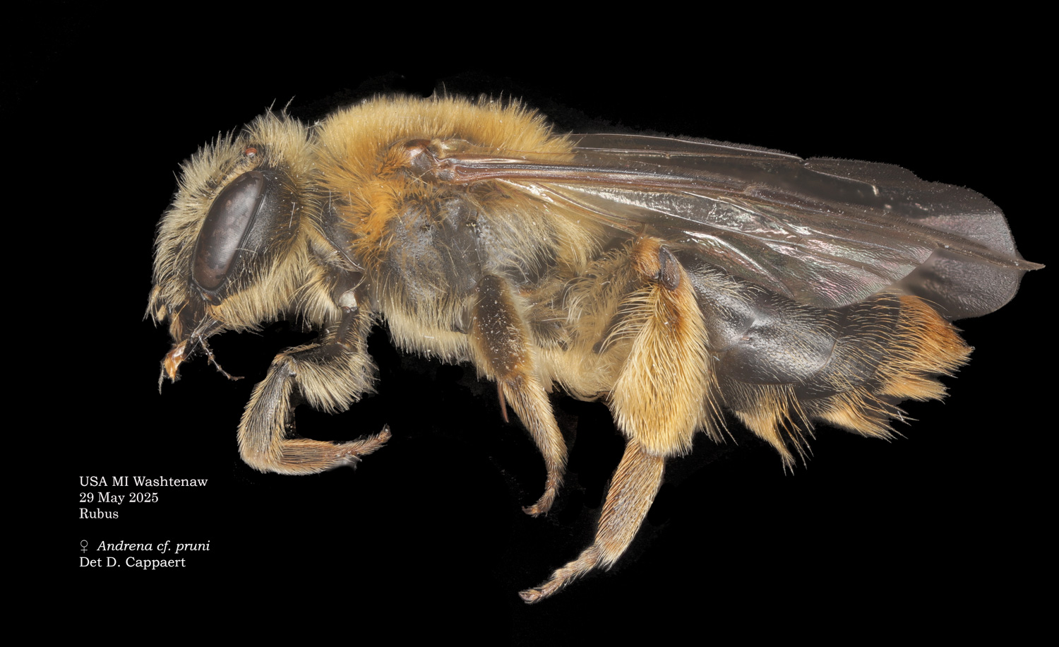 | Shortcut: At a glance, this Michigan specimen is a look-alike to the preceding Oregon A. crataegi. Not shown here ..,. but it exhibits the same deep sculpturing of the delineated propodeal triangle-- a possible Trachandrena. One feature separates this one from any similars in Michigan: strongly curved hind tibial spur. If I am right about both the OR and MI specimens, I can infer common features as typical of the species. E.g., remarkably orange tibial hairs. |