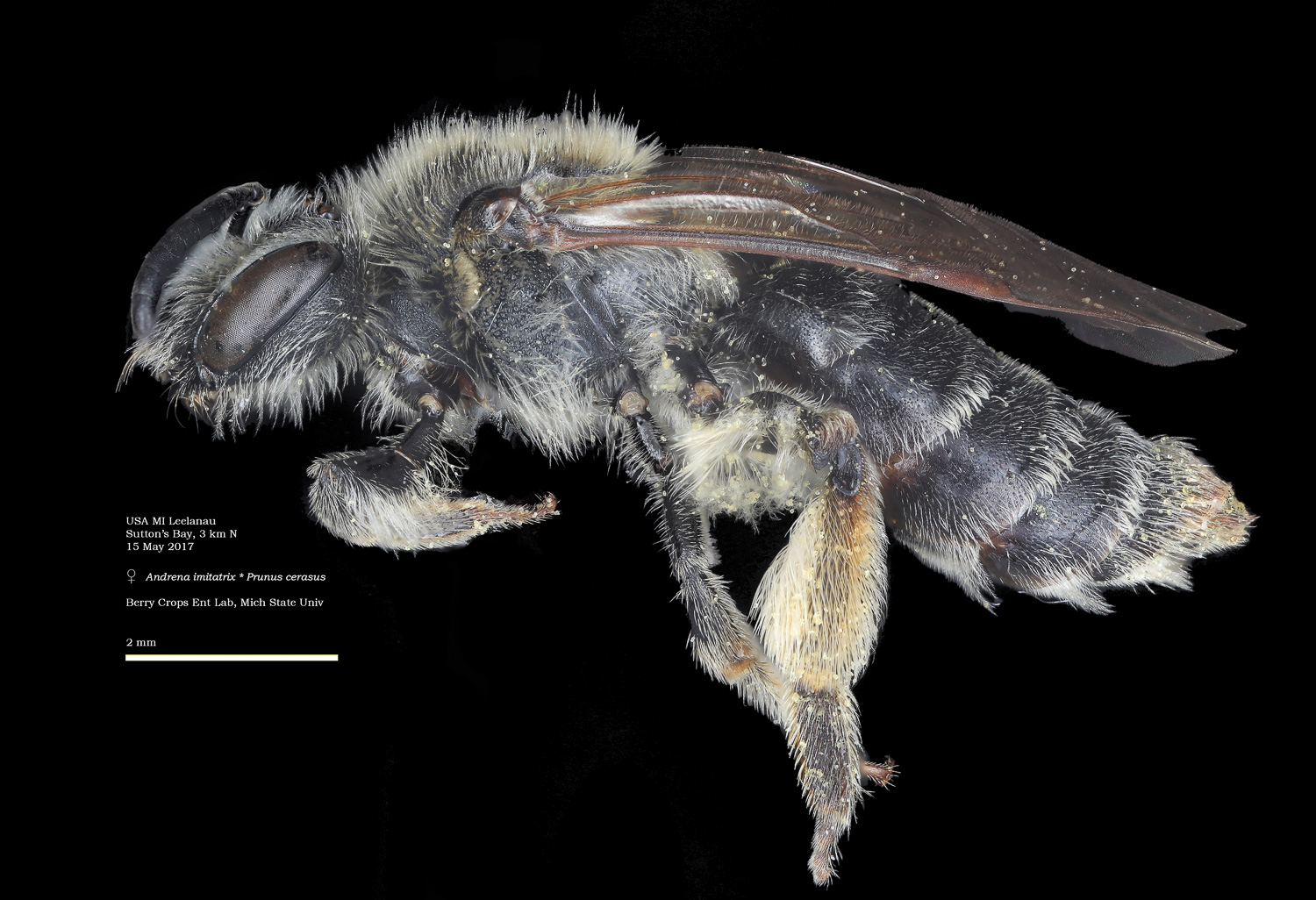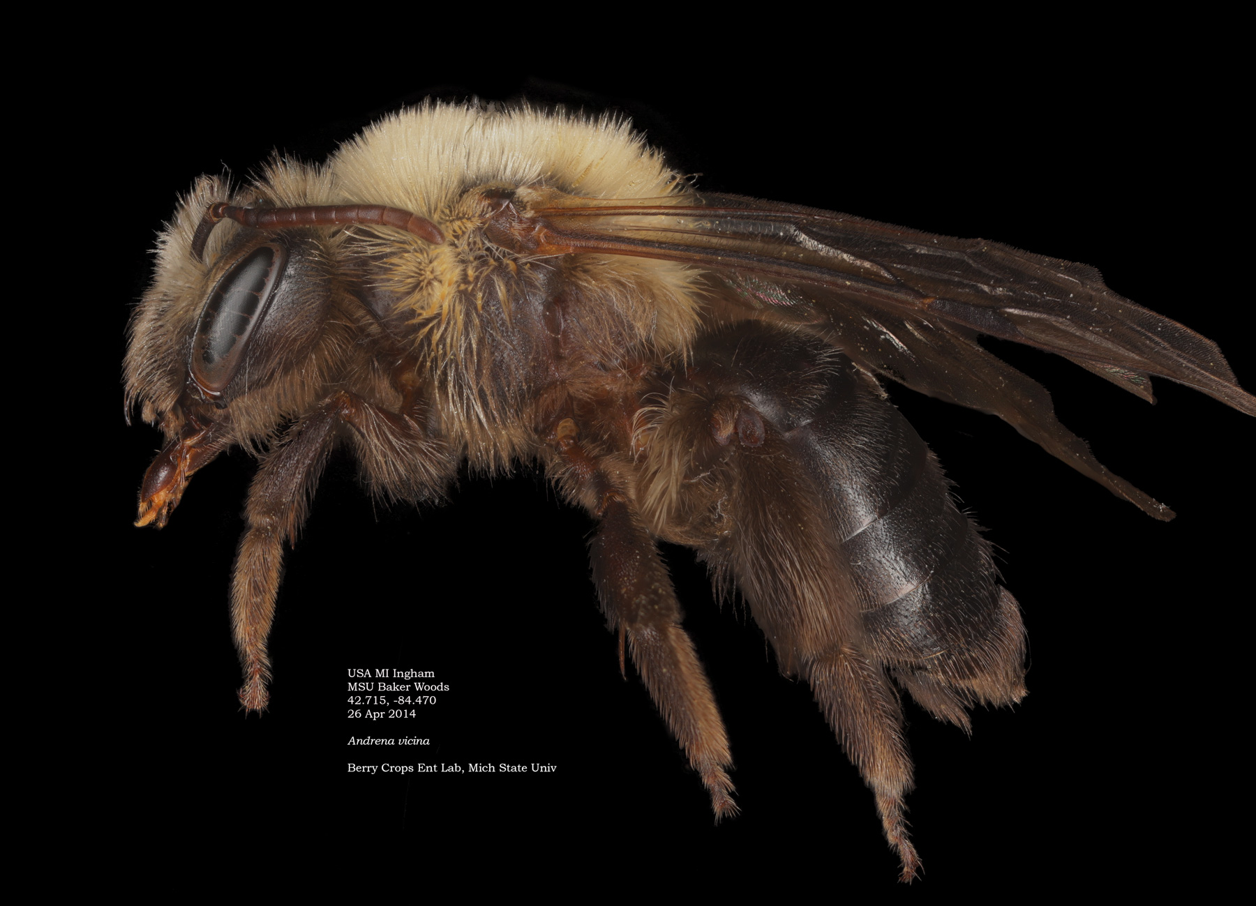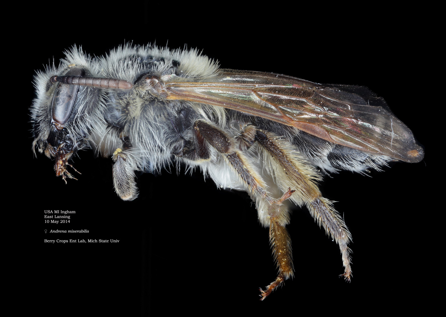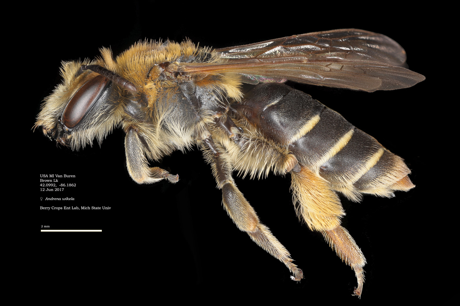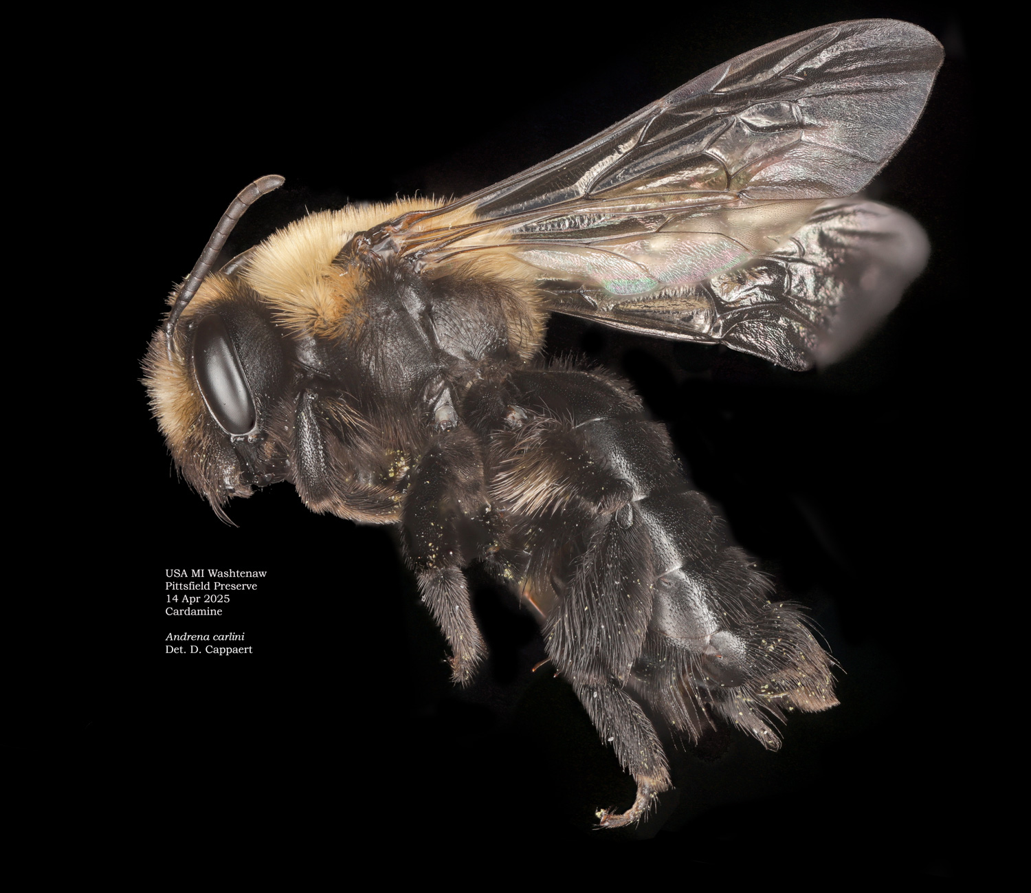 | Shortcut: At a glance, this Michigan specimen is a look-alike to the preceding Oregon A. crataegi. Not shown here ..,. but it exhibits the same deep sculpturing of the delineated propodeal triangle-- a possible Trachandrena. One feature separates this one from any similars in Michigan: strongly curved hind tibial spur. If I am right about both the OR and MI specimens, I can infer common features as typical of the species. E.g., remarkably orange tibial hairs. |
