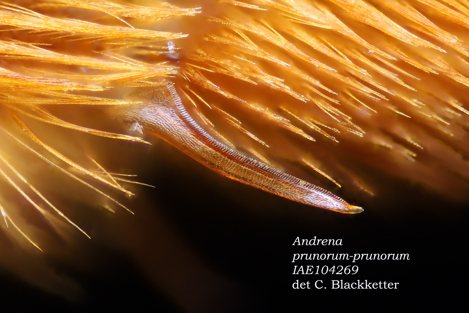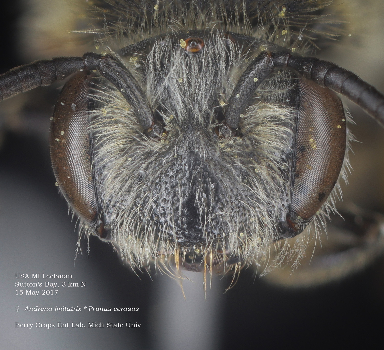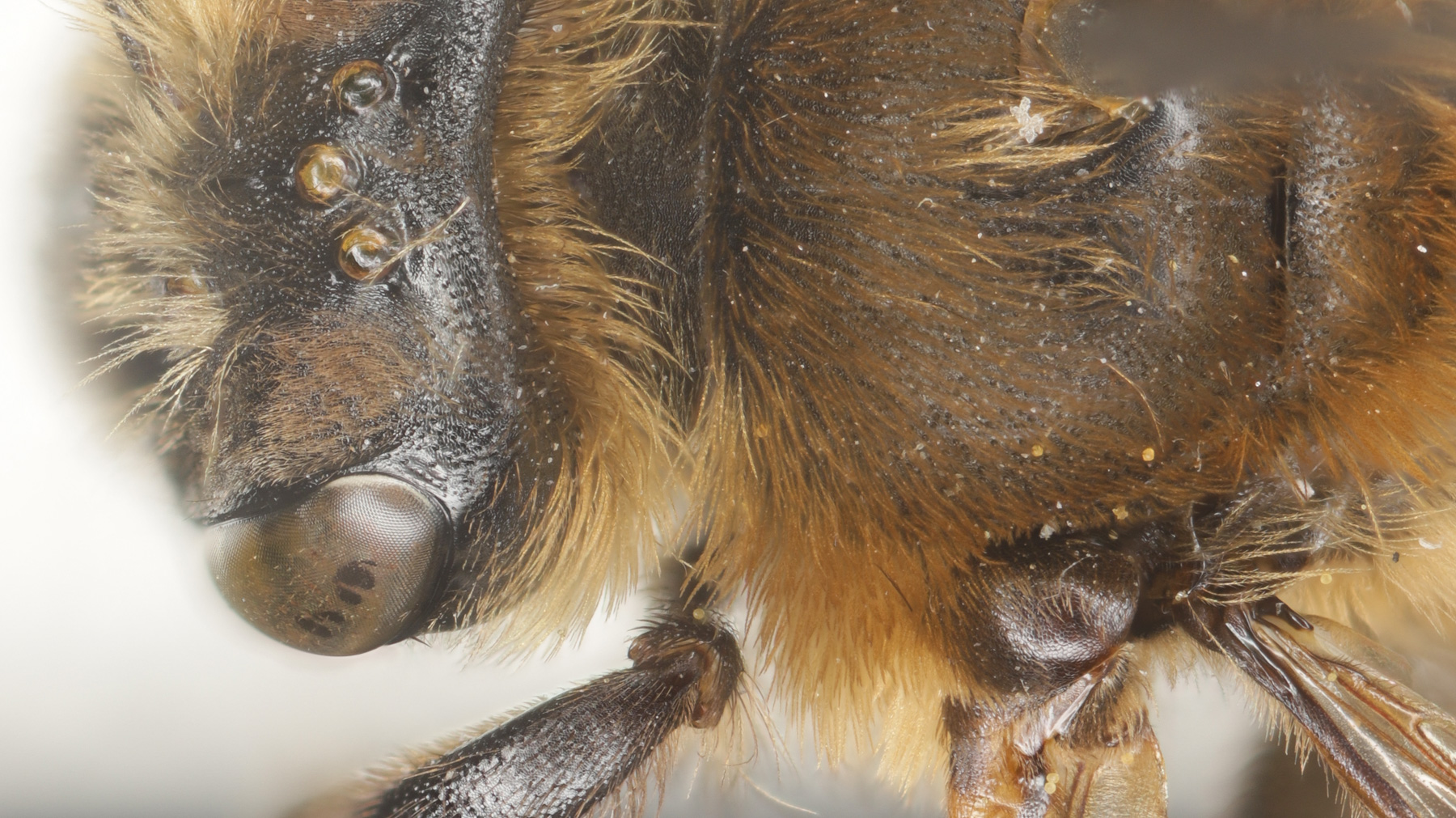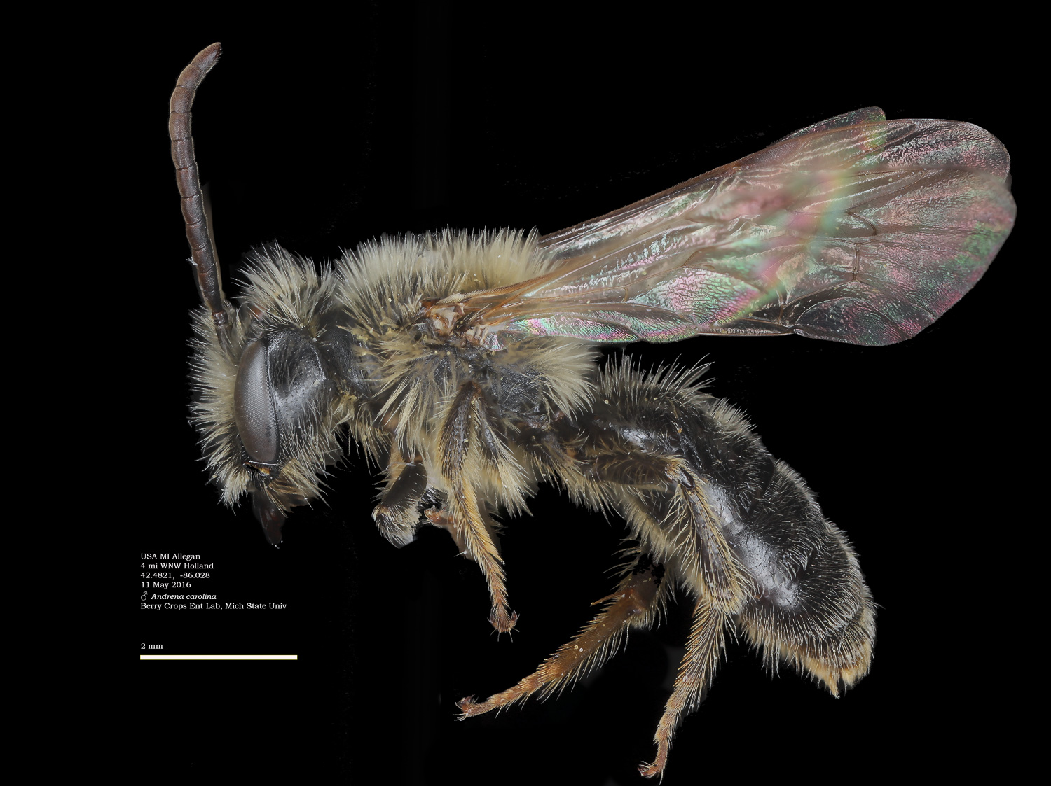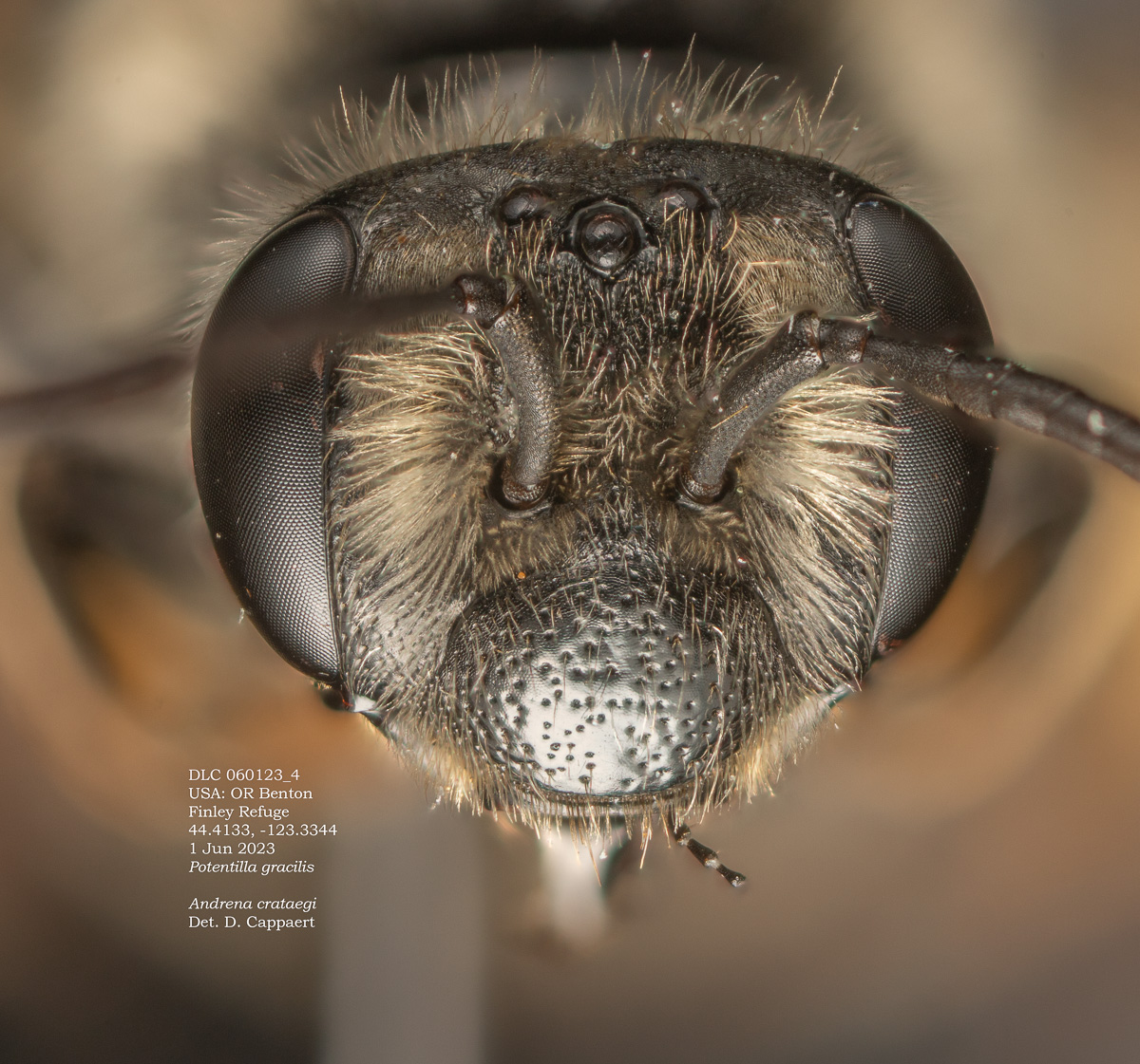 | Shortcut: At a glance, this Michigan specimen is a look-alike to the preceding Oregon A. crataegi. Not shown here ..,. but it exhibits the same deep sculpturing of the delineated propodeal triangle-- a possible Trachandrena. One feature separates this one from any similars in Michigan: strongly curved hind tibial spur. If I am right about both the OR and MI specimens, I can infer common features as typical of the species. E.g., remarkably orange tibial hairs. |