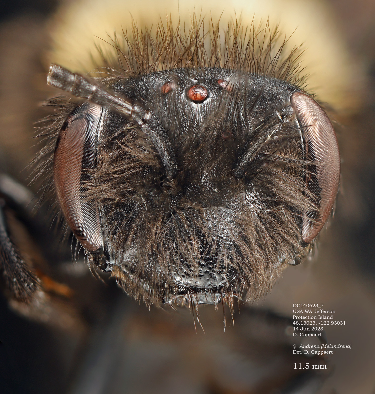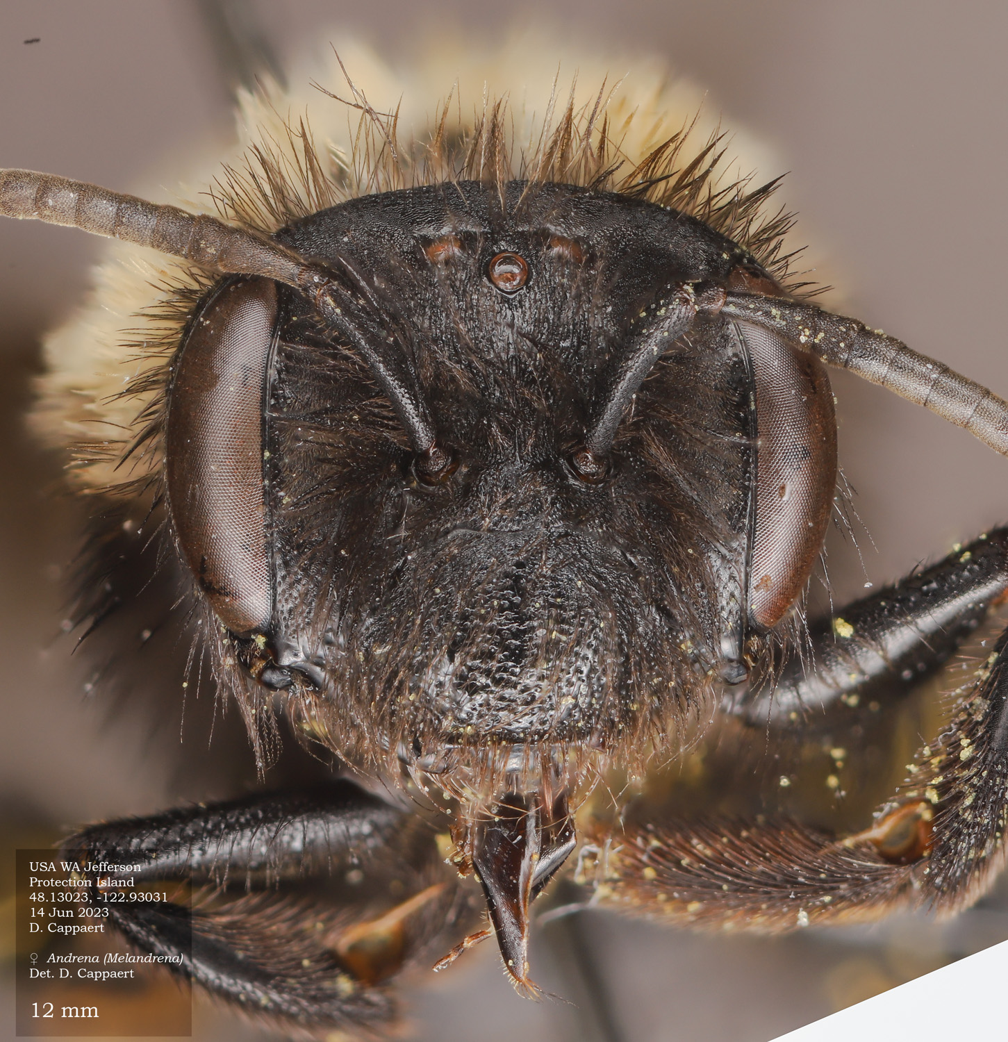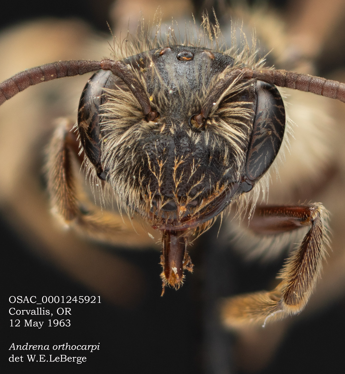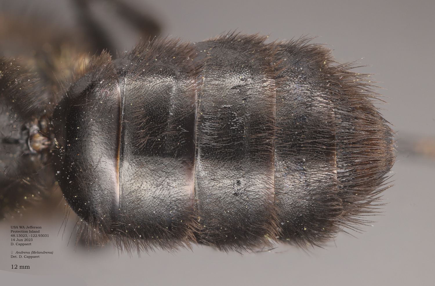 | The second Protection Island specimen at right. It would be surprising if this were not the same species as the first specimen. However it would be excluded in the DL guide, where A. vicina would have a complete, or nearly complete corbicula (From LaBerge: "propodeal corbicula well developed but rather short, with a distinct anterior fringe." I see no hint of an anterior fringe, and abundant, simple internal hairs. Is this vicina? If not, I don't have a better suggestion. |