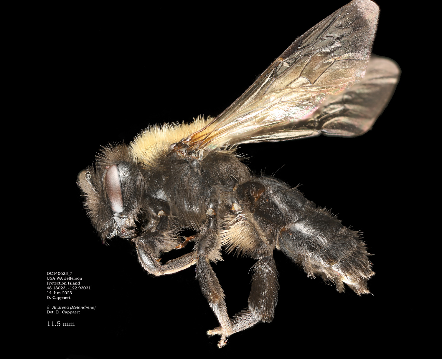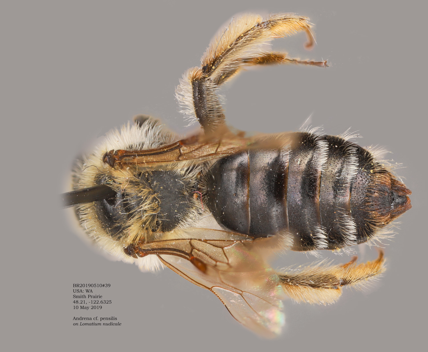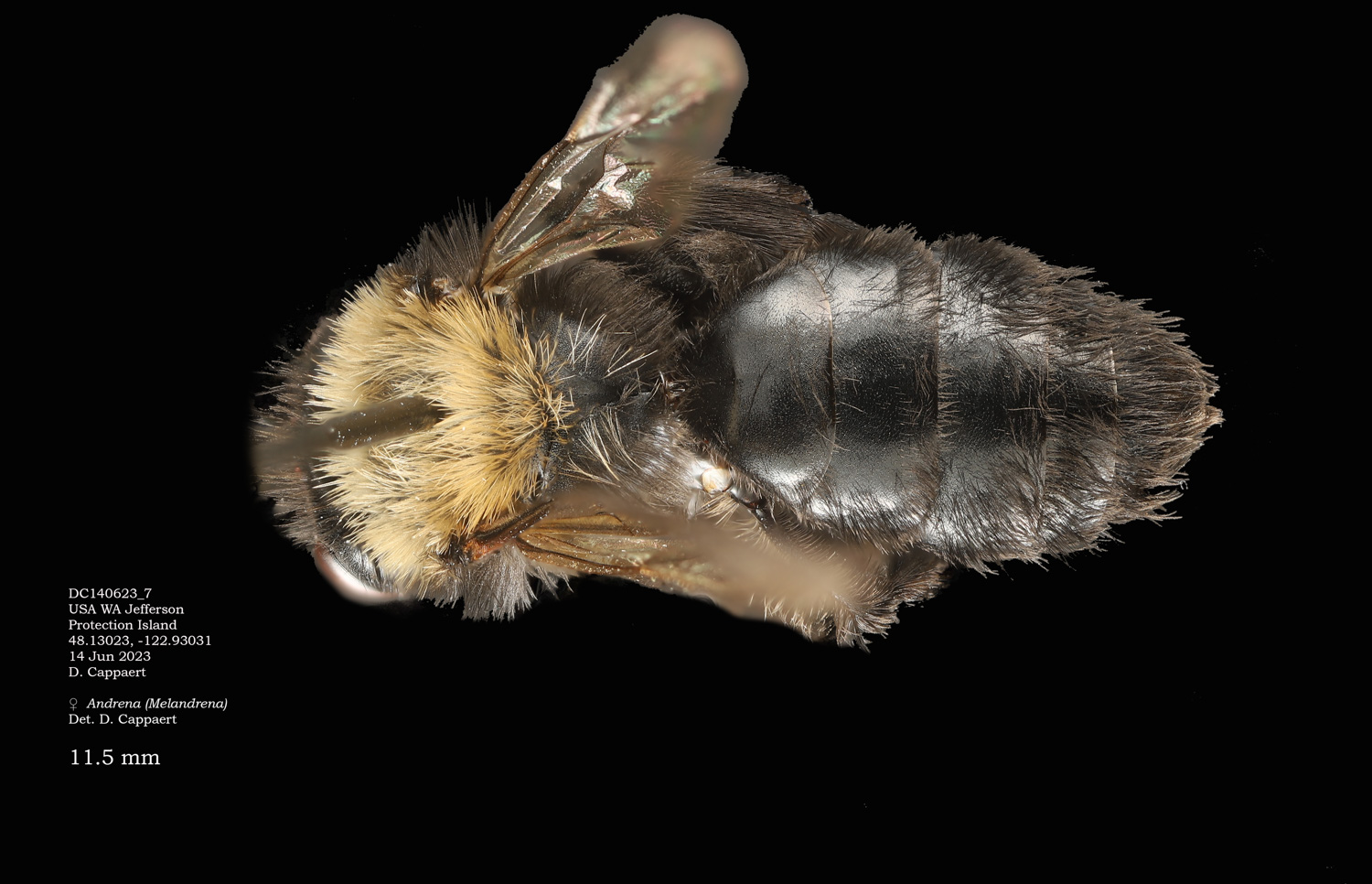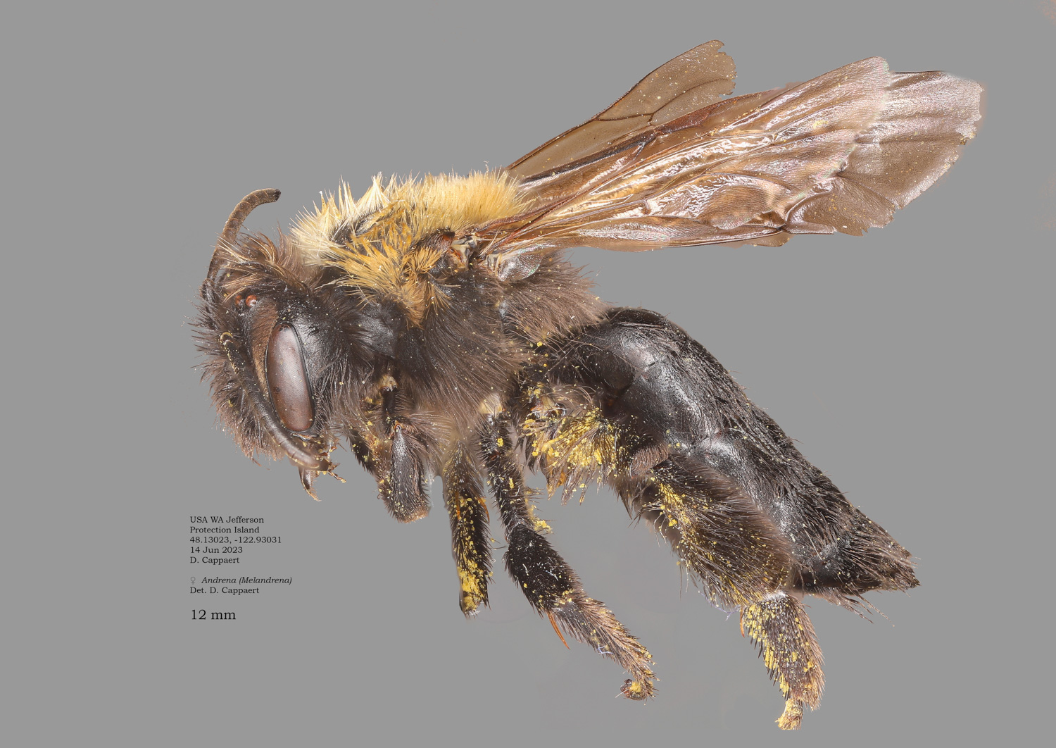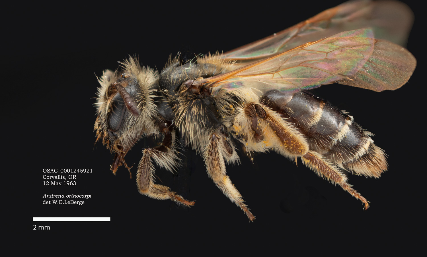 | The second Protection Island specimen at right. It would be surprising if this were not the same species as the first specimen. However it would be excluded in the DL guide, where A. vicina would have a complete, or nearly complete corbicula (From LaBerge: "propodeal corbicula well developed but rather short, with a distinct anterior fringe." I see no hint of an anterior fringe, and abundant, simple internal hairs. Is this vicina? If not, I don't have a better suggestion. |