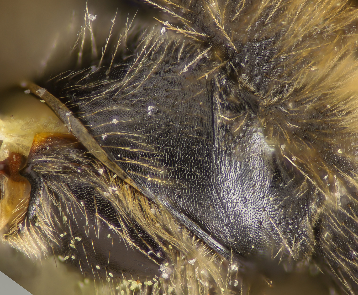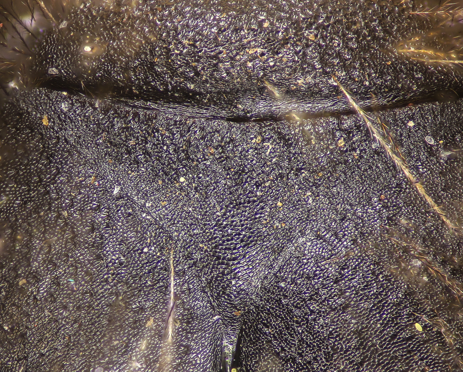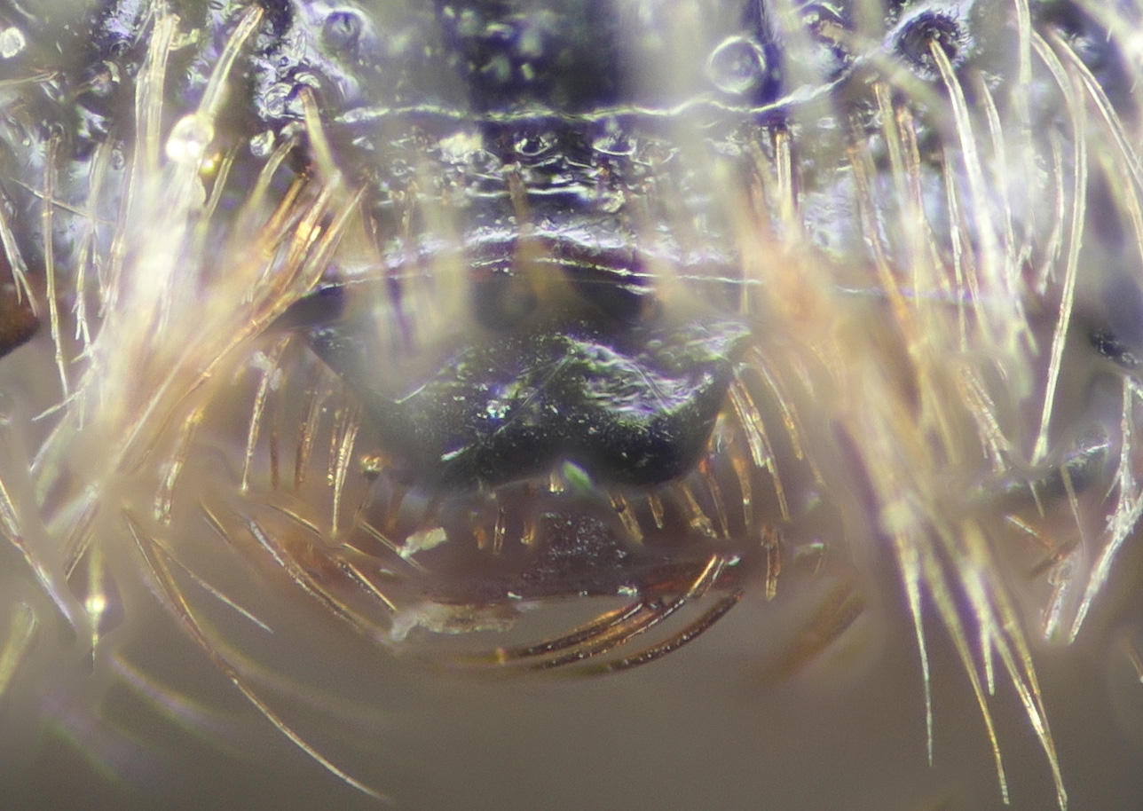 Above: DL scores T2 as granular, or shiny, and pits absent or present. Reasonable because this one is hard to call. The propdeal triangle - appears to me to have no, or weak and uniform sculpturing. Frizzy plumose hairs on narrow tibia.