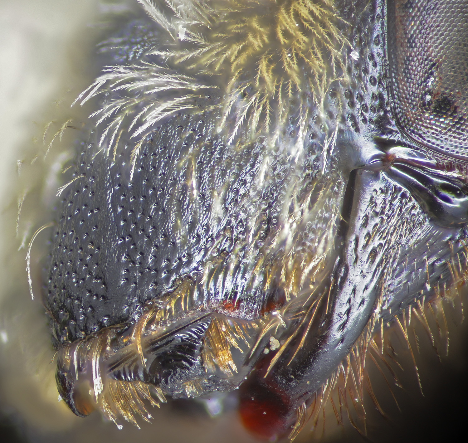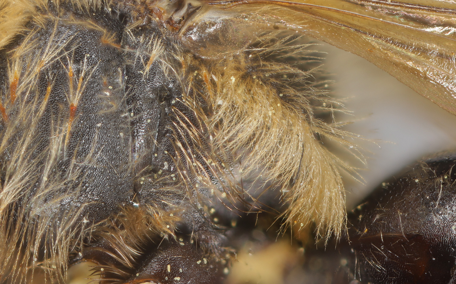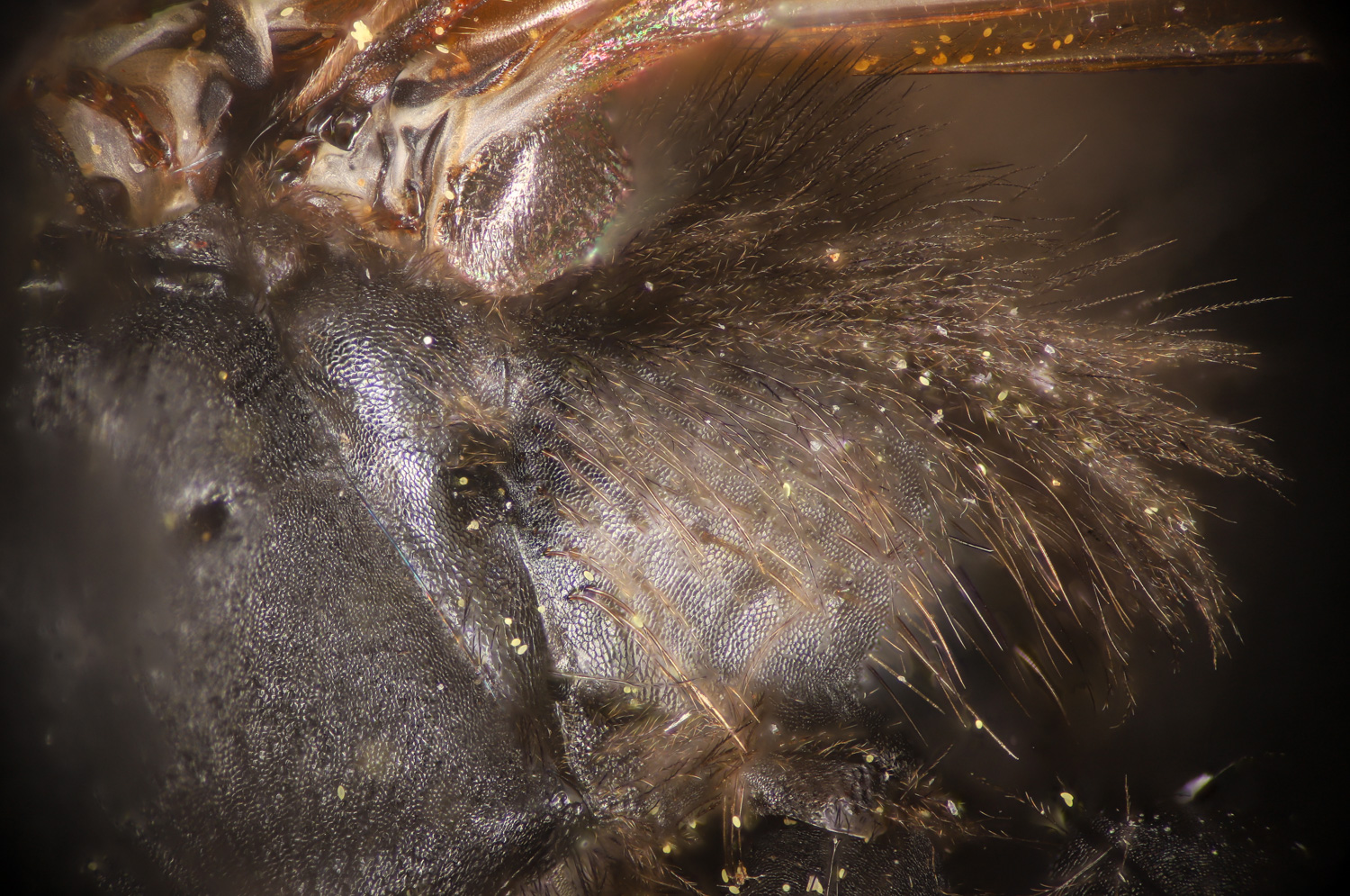 Above: DL scores T2 as granular, or shiny, and pits absent or present. Reasonable because this one is hard to call. The propdeal triangle - appears to me to have no, or weak and uniform sculpturing. Frizzy plumose hairs on narrow tibia.