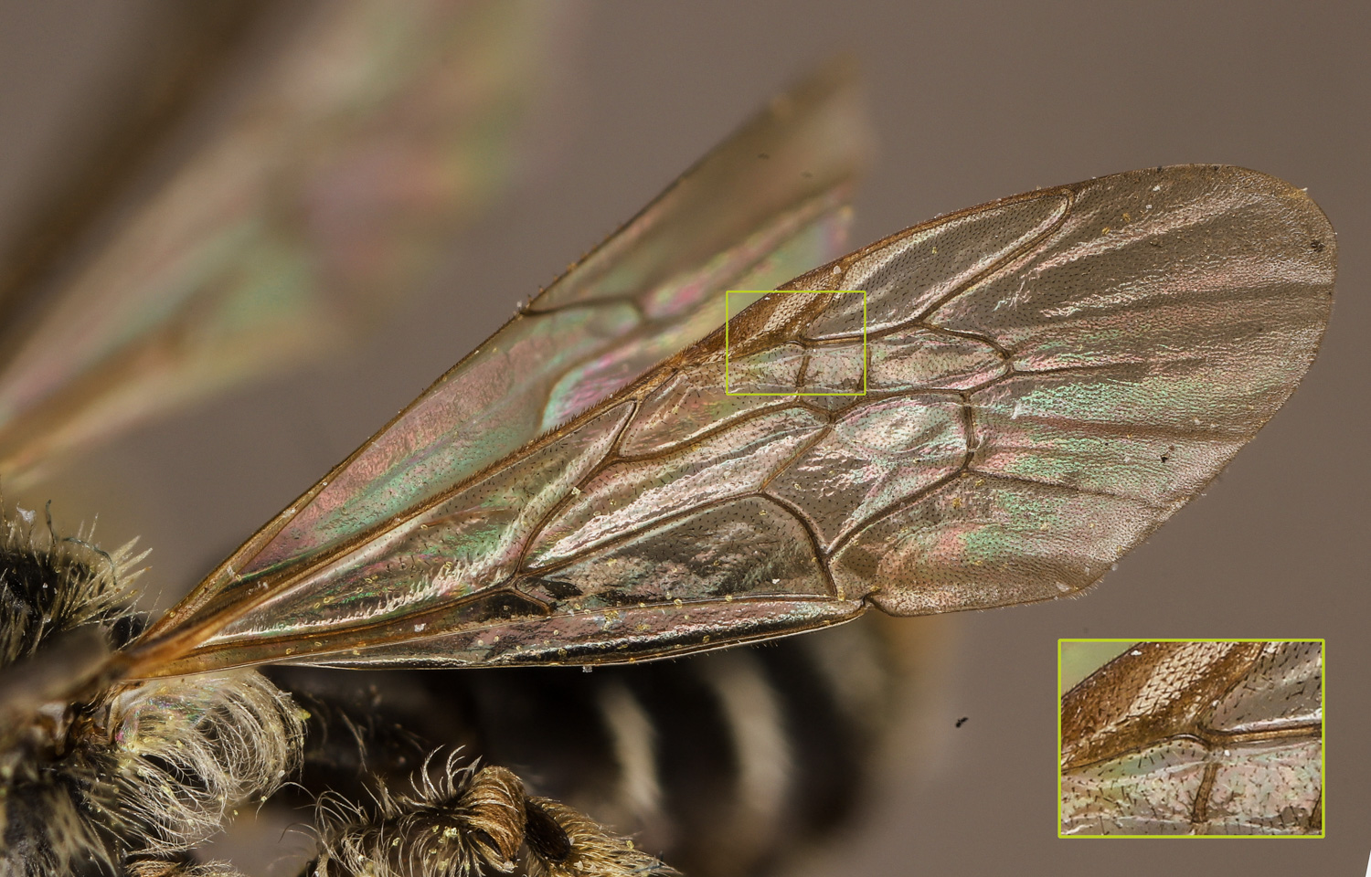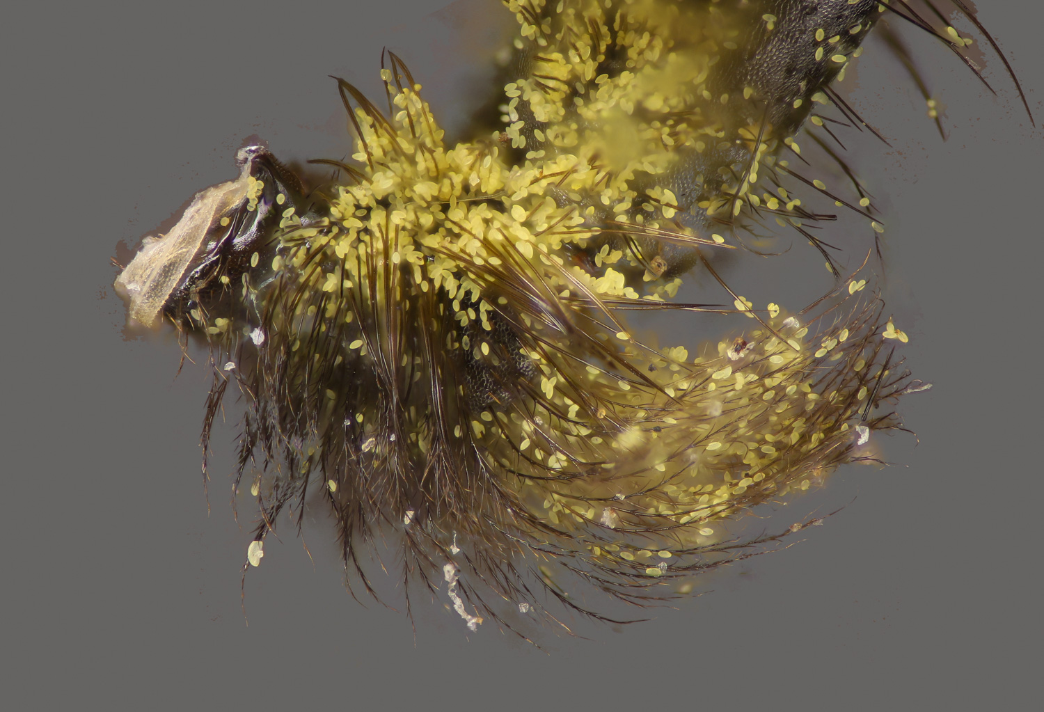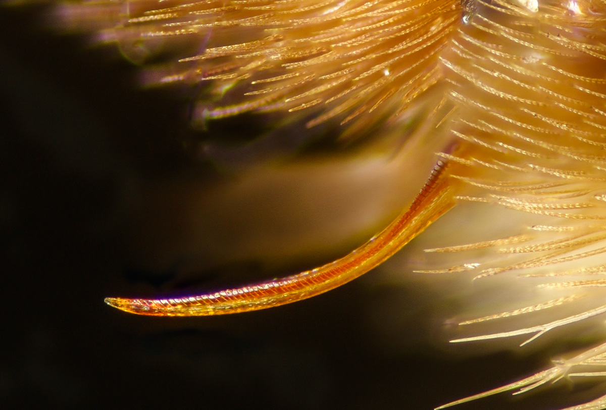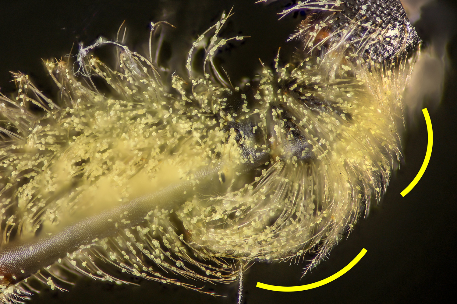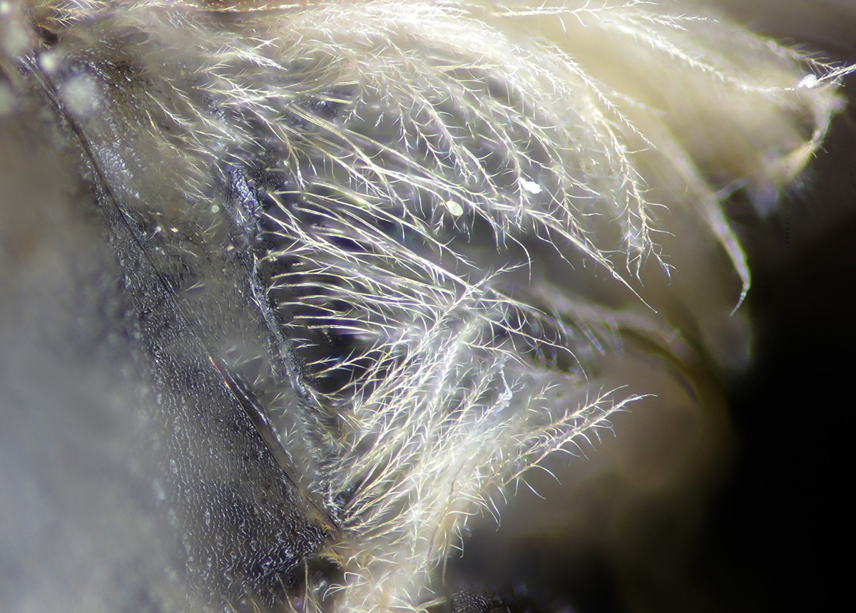 Below: frizzy-plumose hind tibia. On the flying insects, the reflectivity is noticeable. |
