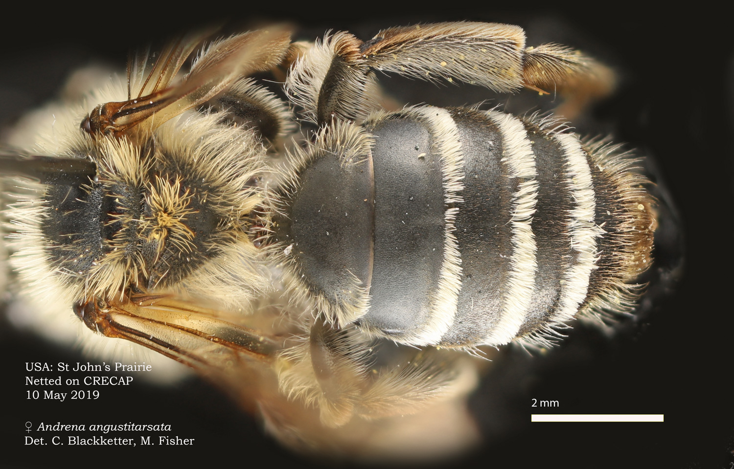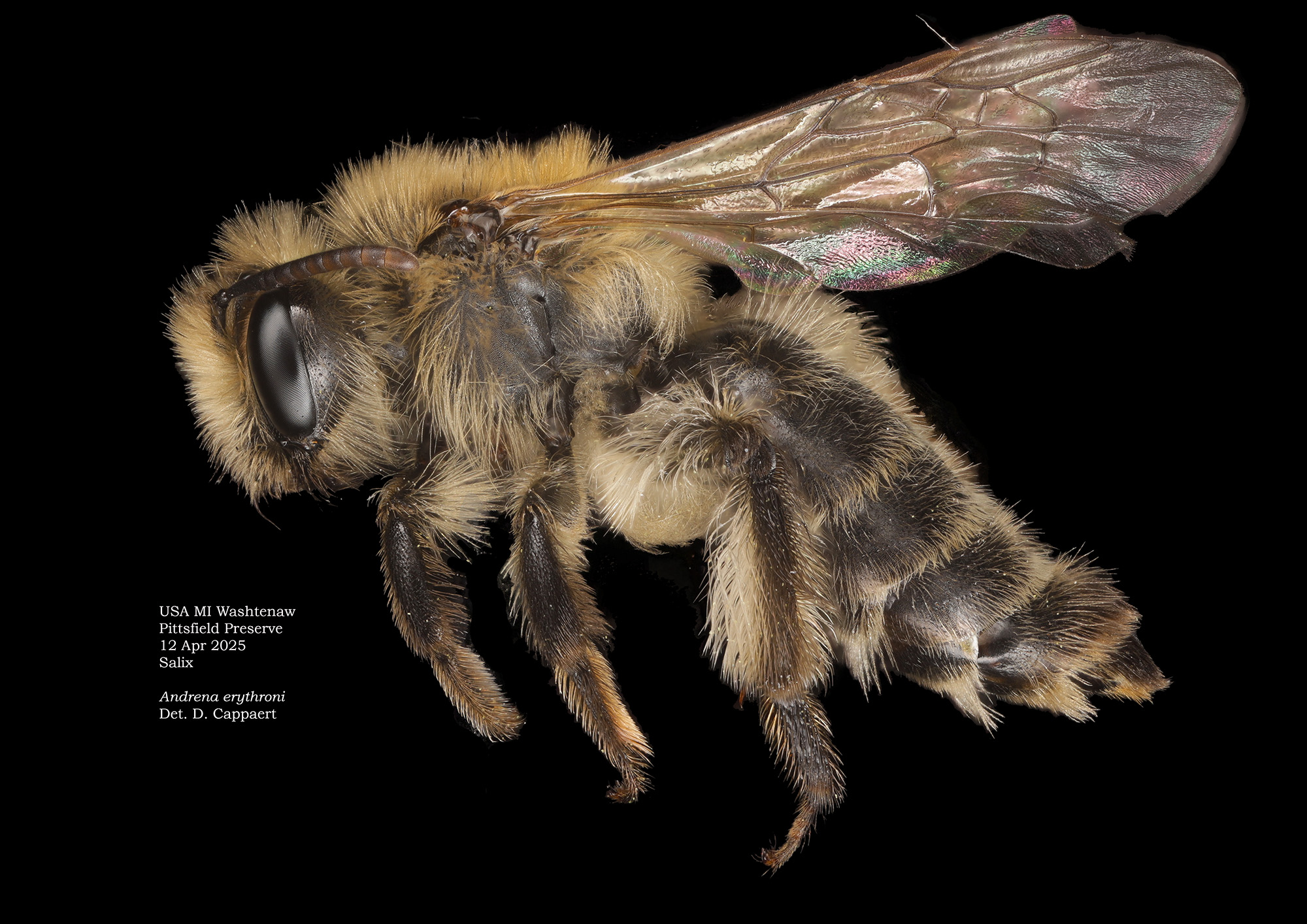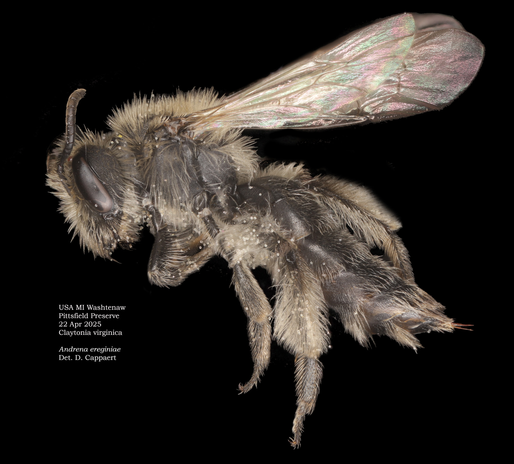 The key character is the unusual frizzy-plumose tibial scopa. Another determinative datum: the was specimen collected on spring beauty (Claytonia virginica) for which A. erigeniae is a specialist pollinator. Additional note: spring beauty has many other pollinators in the sites I follow. |
