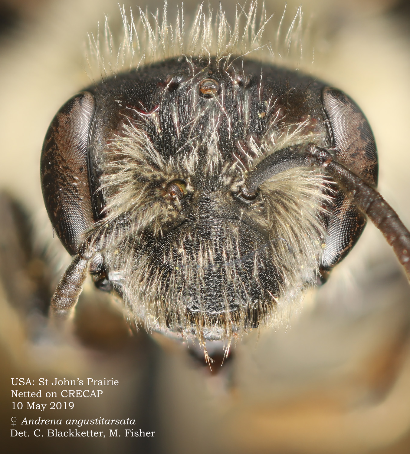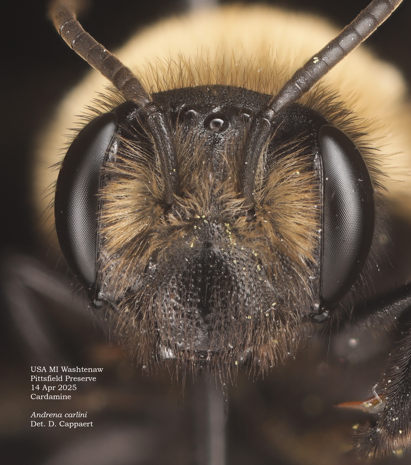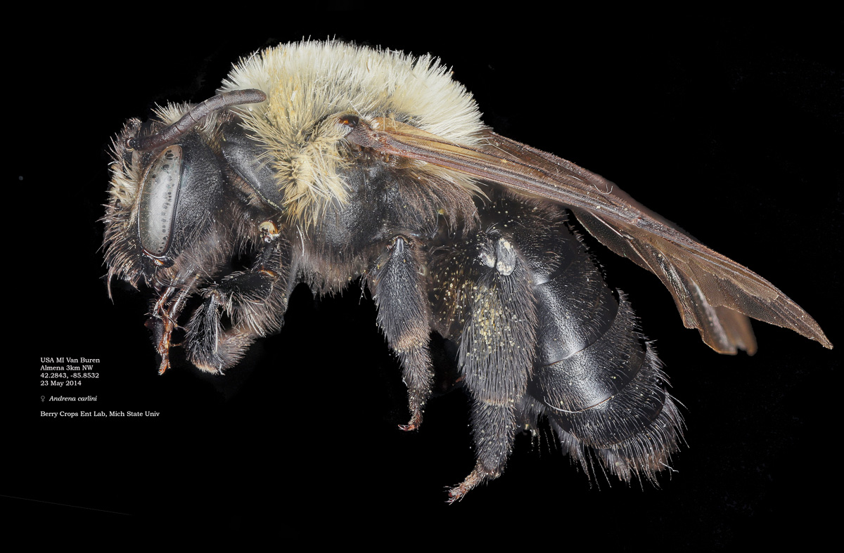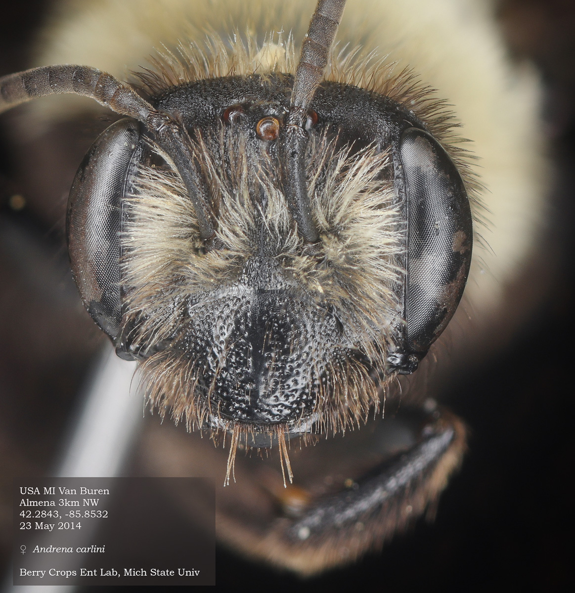 | An additional specimen at right. The mining bees of Minnesota (unpublished manuscript by Joel Gardner): "Andrena carlini is one of the most common Melandrena in Minnesota and easily recognized in the female by the hair of the head and thorax being bright yellow-white dorsally and black ventrally. Most other Minnesota Melandrena have the head and thorax with completely light hair." The exception would be A. vicina. I can't rule that out for this specimen. LaBerge: differs from A. vicina by "a [more] distinct median clypeal impunctate line with crowded punctures on either side." The A. carlini flocculus, not visible in photos, would be complete, but partial for vicina. |