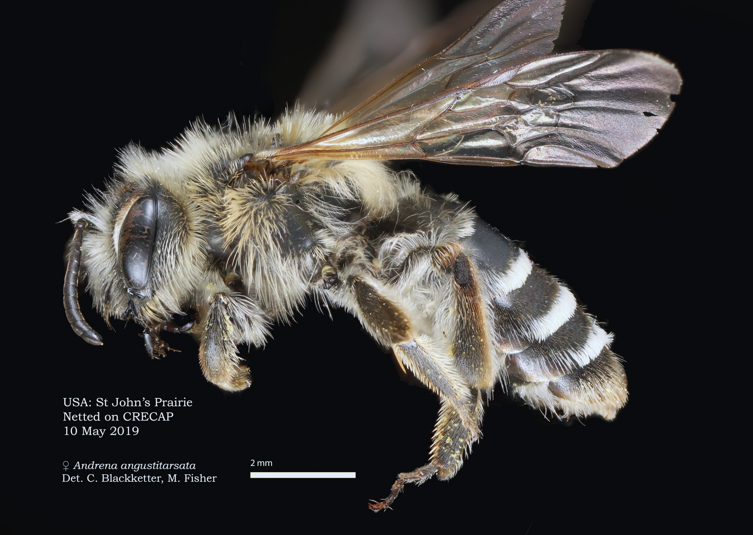 LaBerge: "Andrena angustitarsata Viereck is an extremely common western Andrena, distinguishable in either sex by the terga being punctureless and opaque due to the dense regular tessellation." |