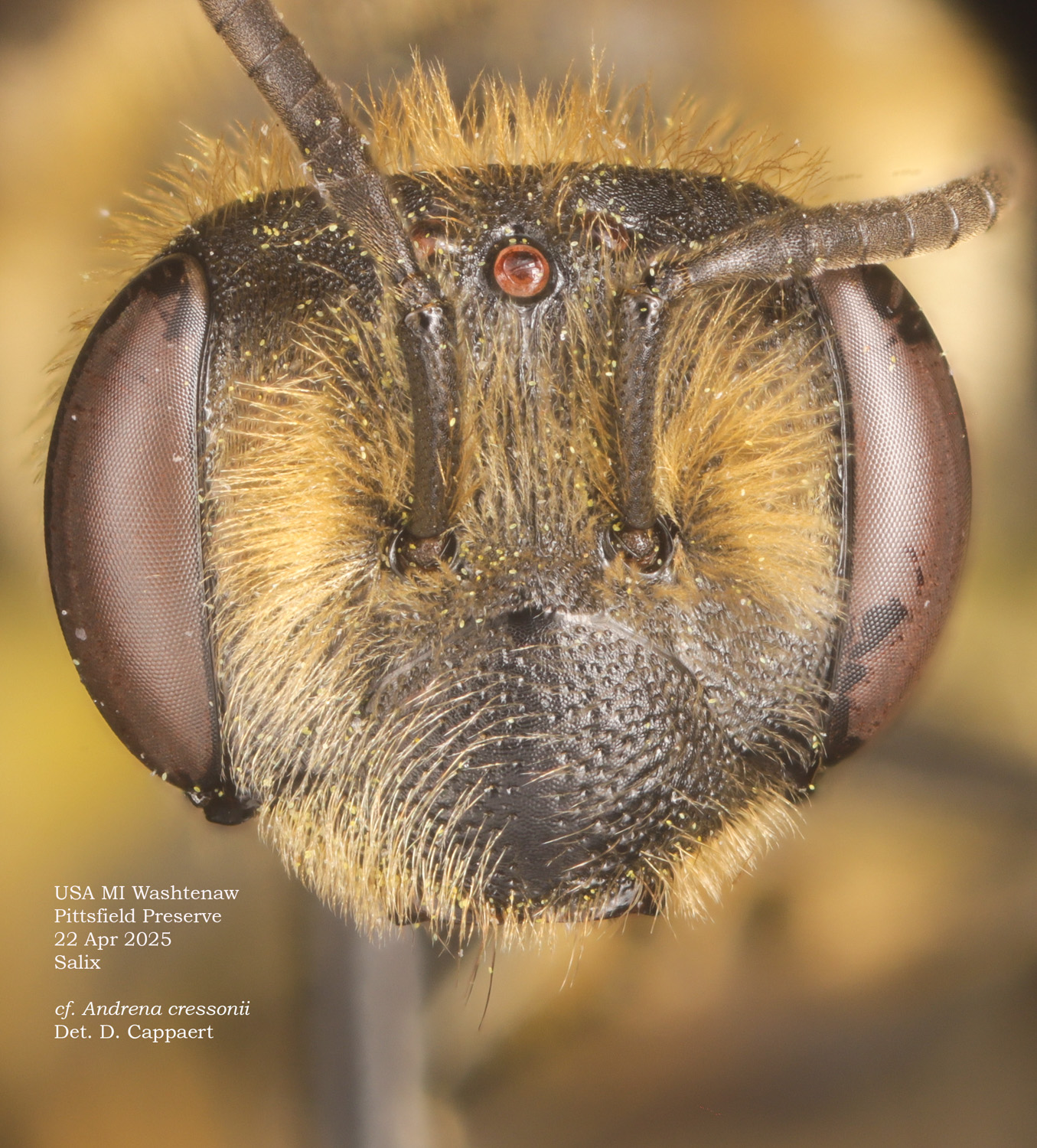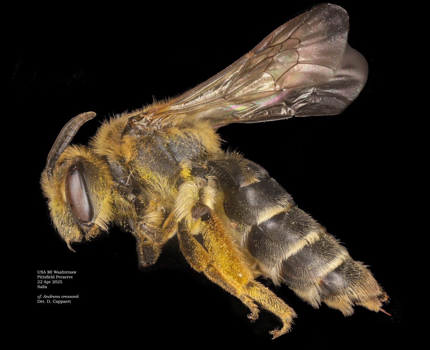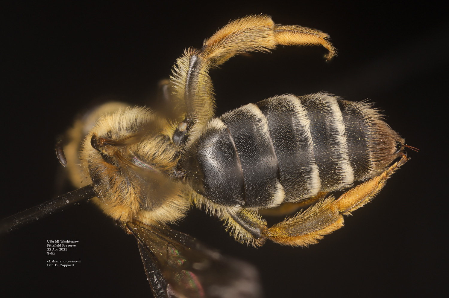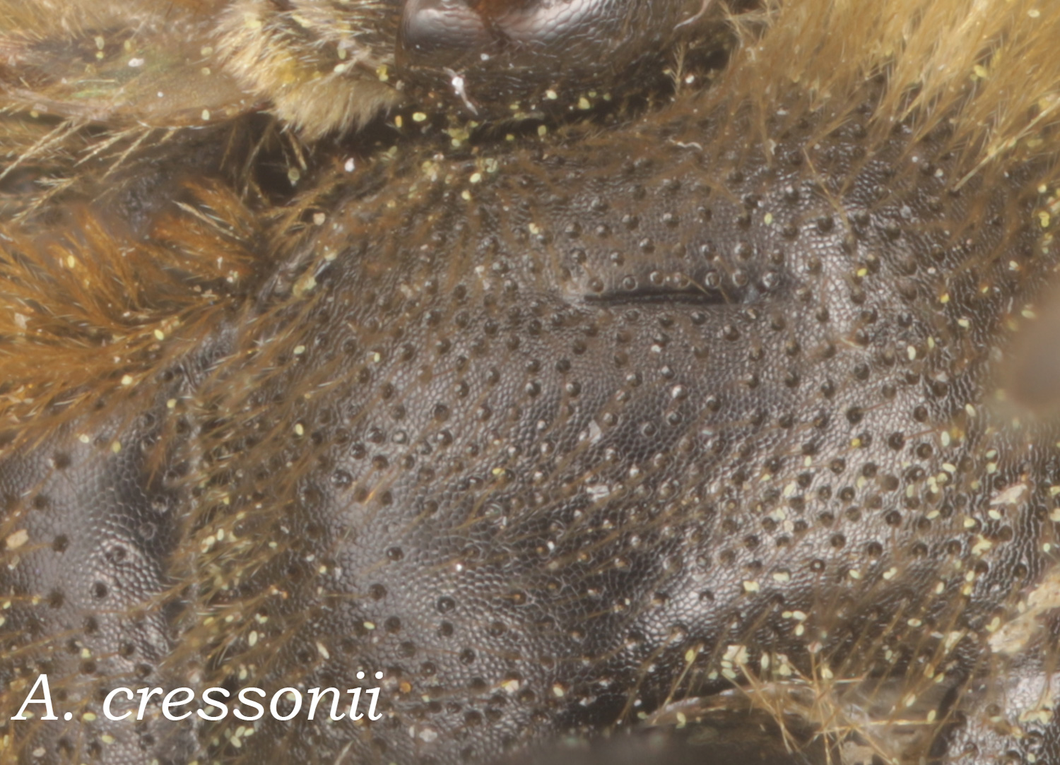 A. cressonii should have a "trochanteral flocculus incomplete, basal half with short hairs." The mess of hairs and pollen makes this a little hard to evaluate, but I think I see this in the photo.