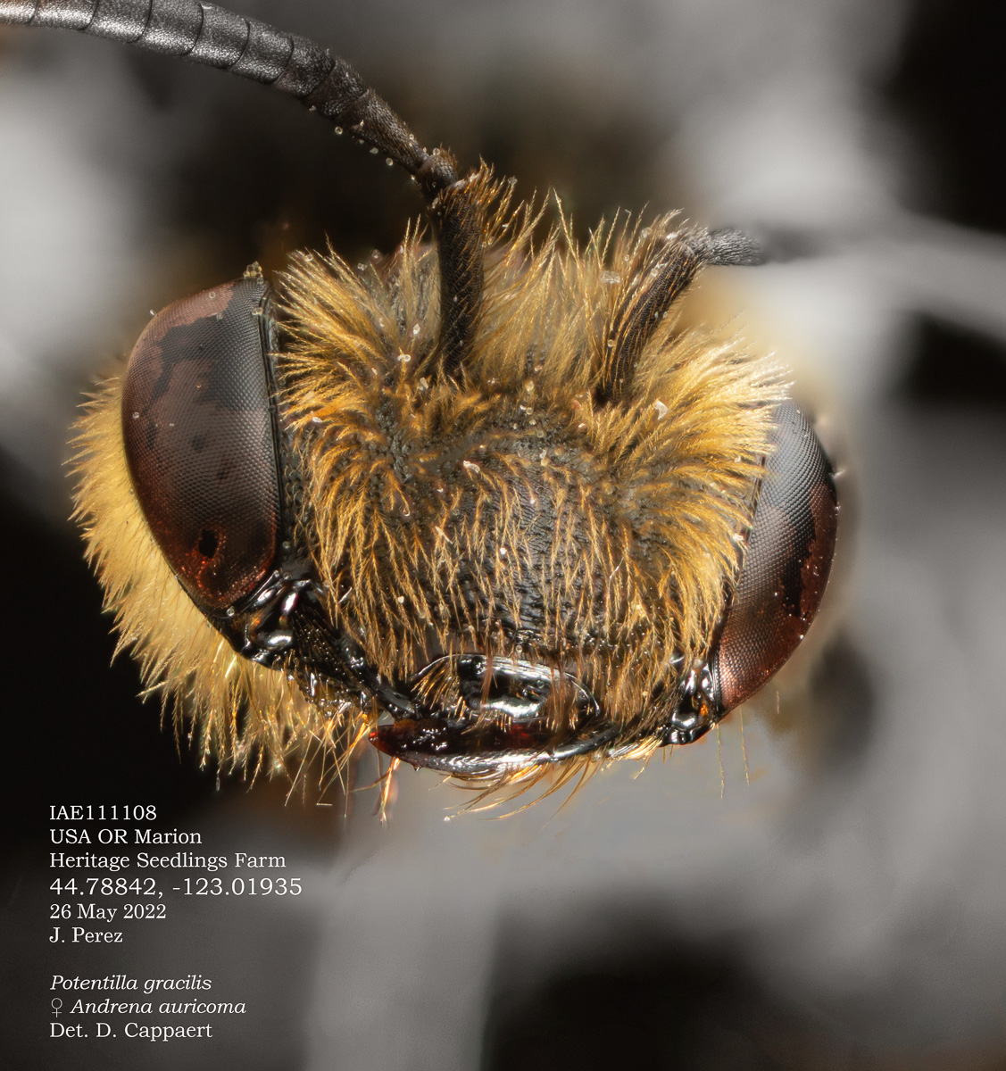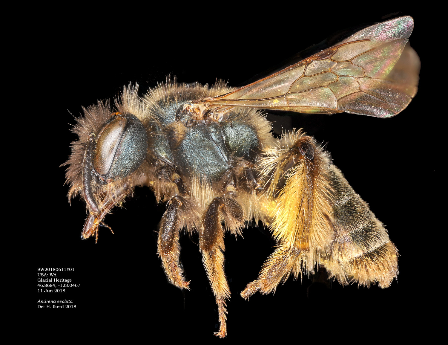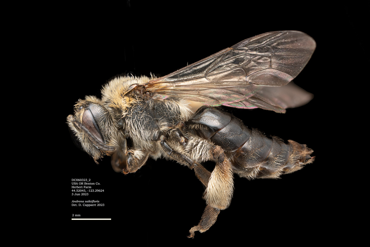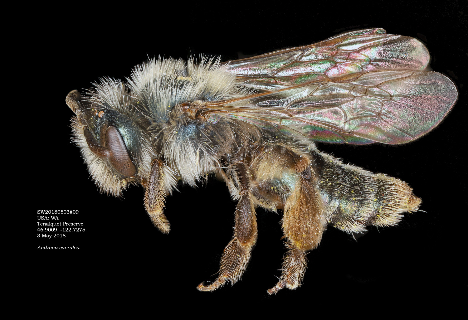 A. cressonii should have a "trochanteral flocculus incomplete, basal half with short hairs." The mess of hairs and pollen makes this a little hard to evaluate, but I think I see this in the photo.