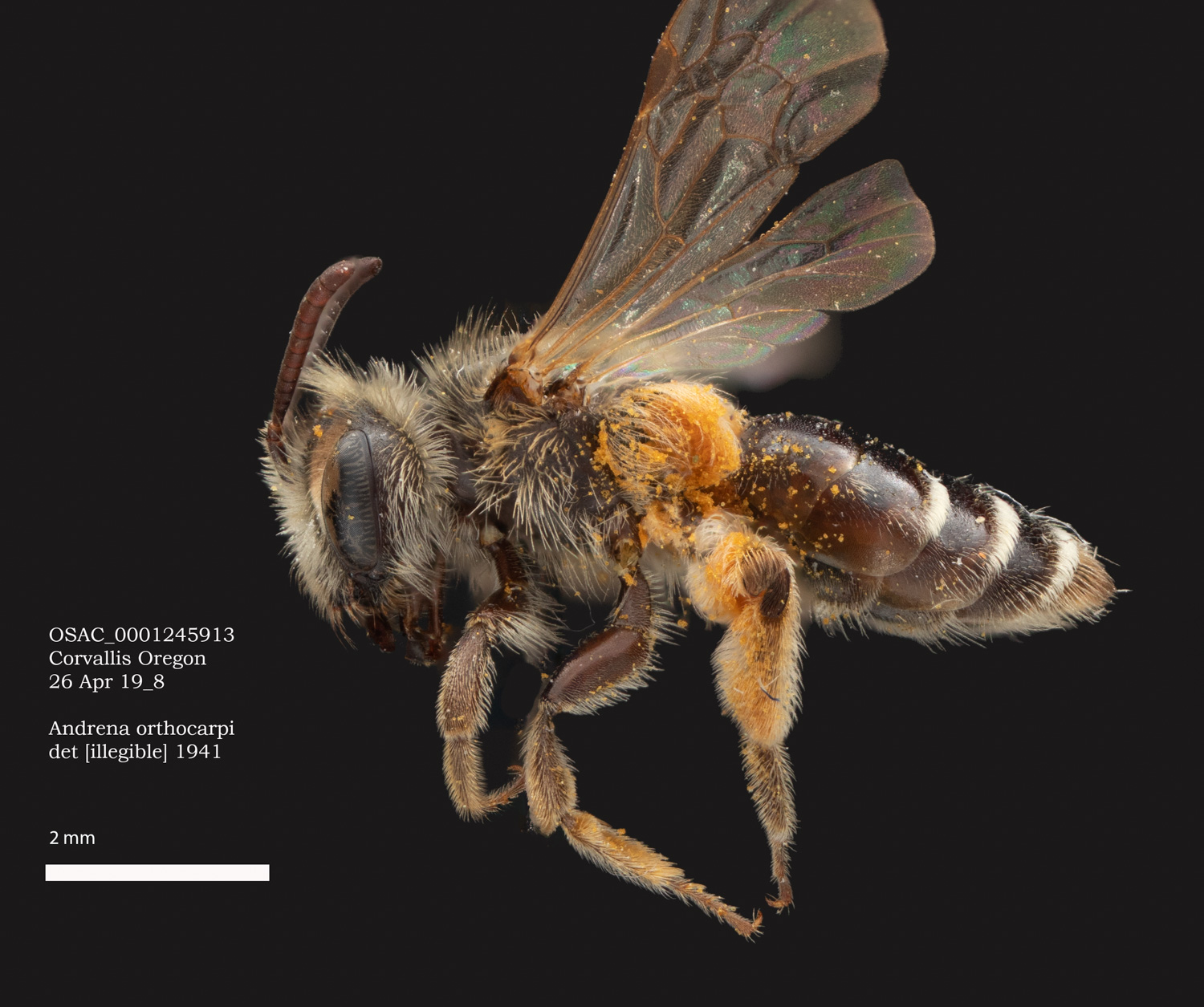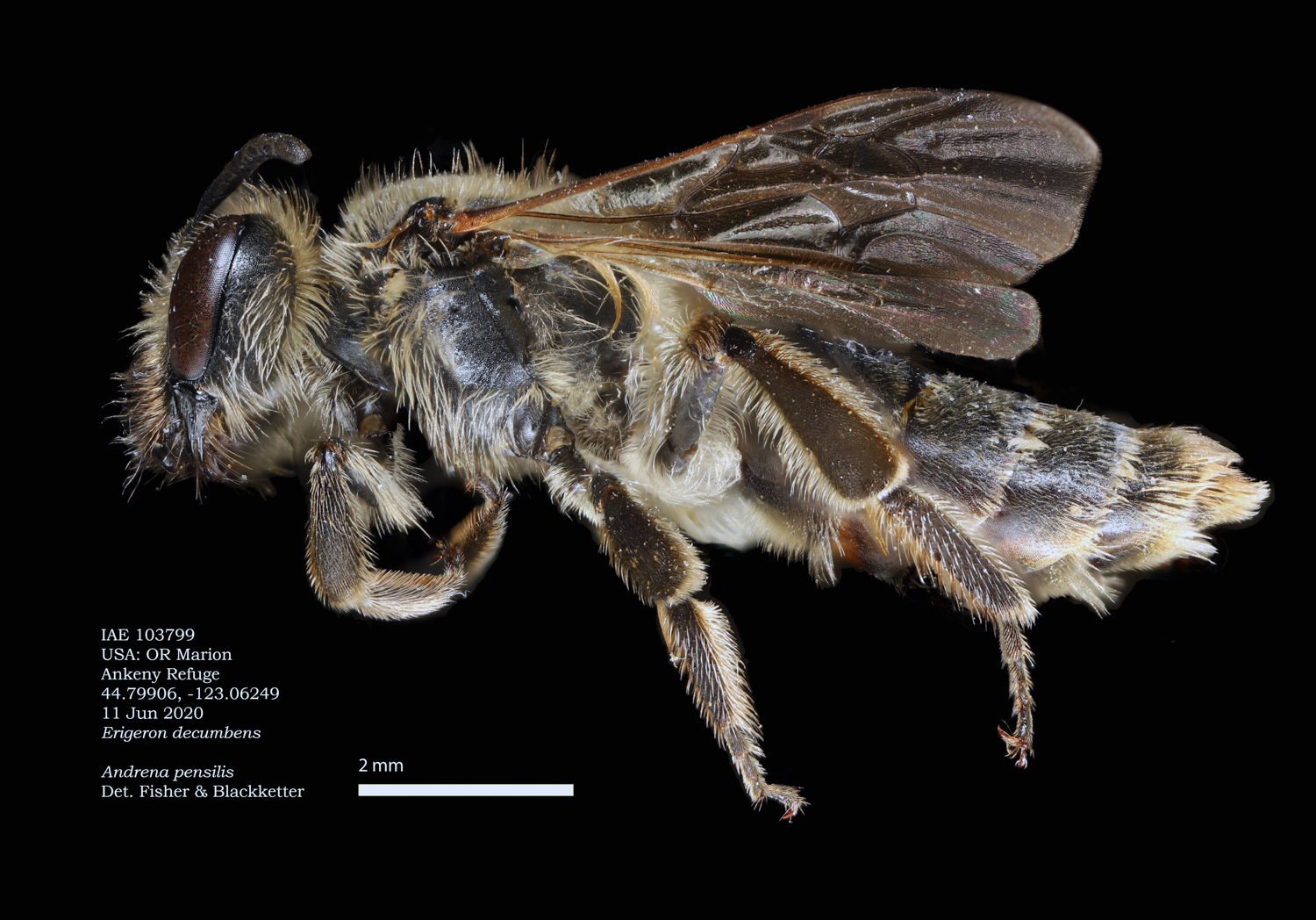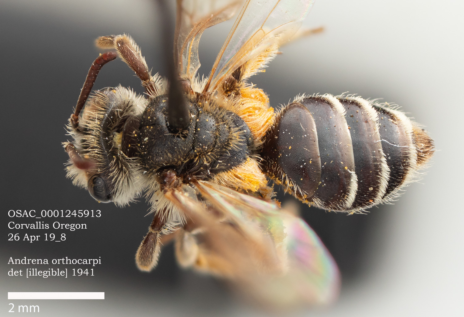 Result: Andrena orthocarpi or A. pensilis. Not pensilis, which has wavy clypeal hairs, and a long r vein. |