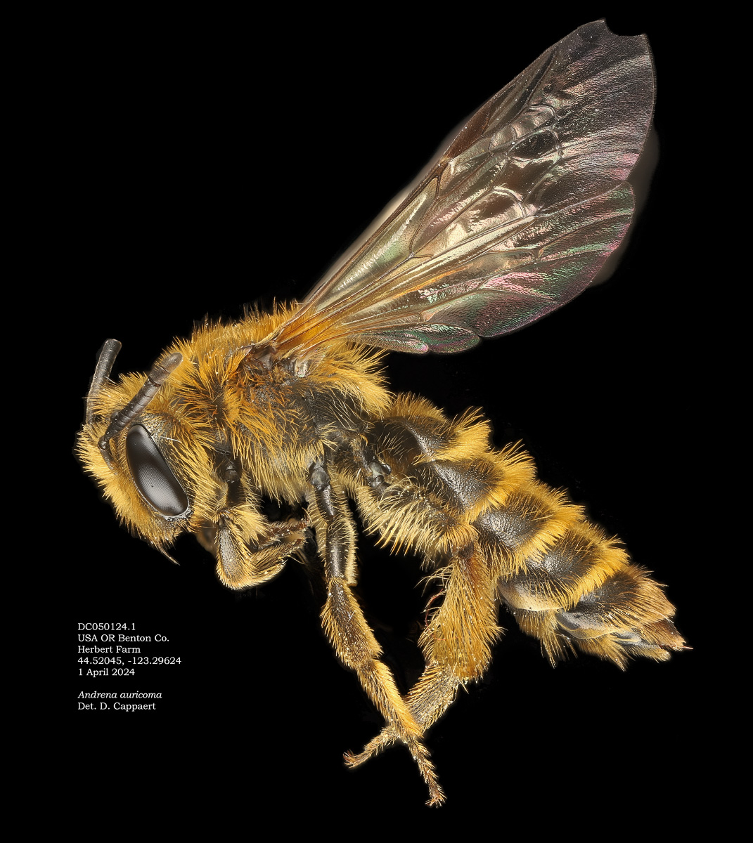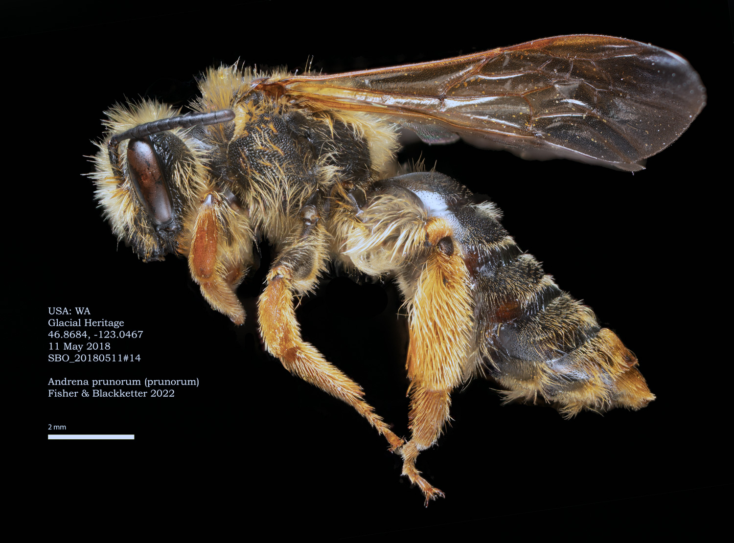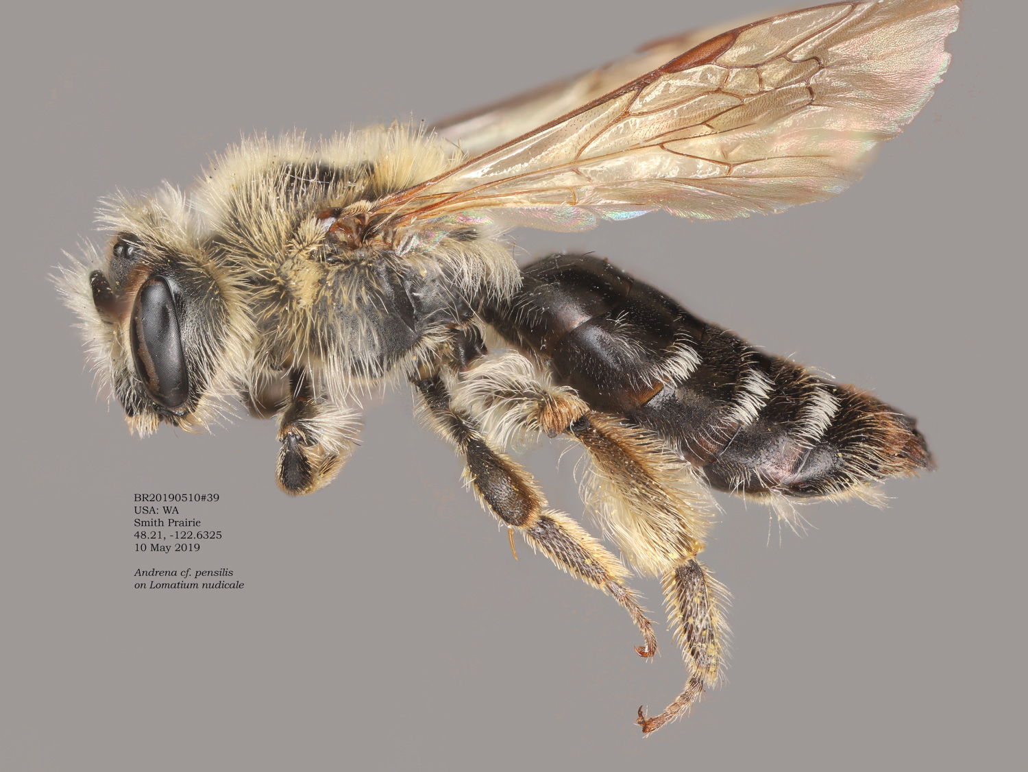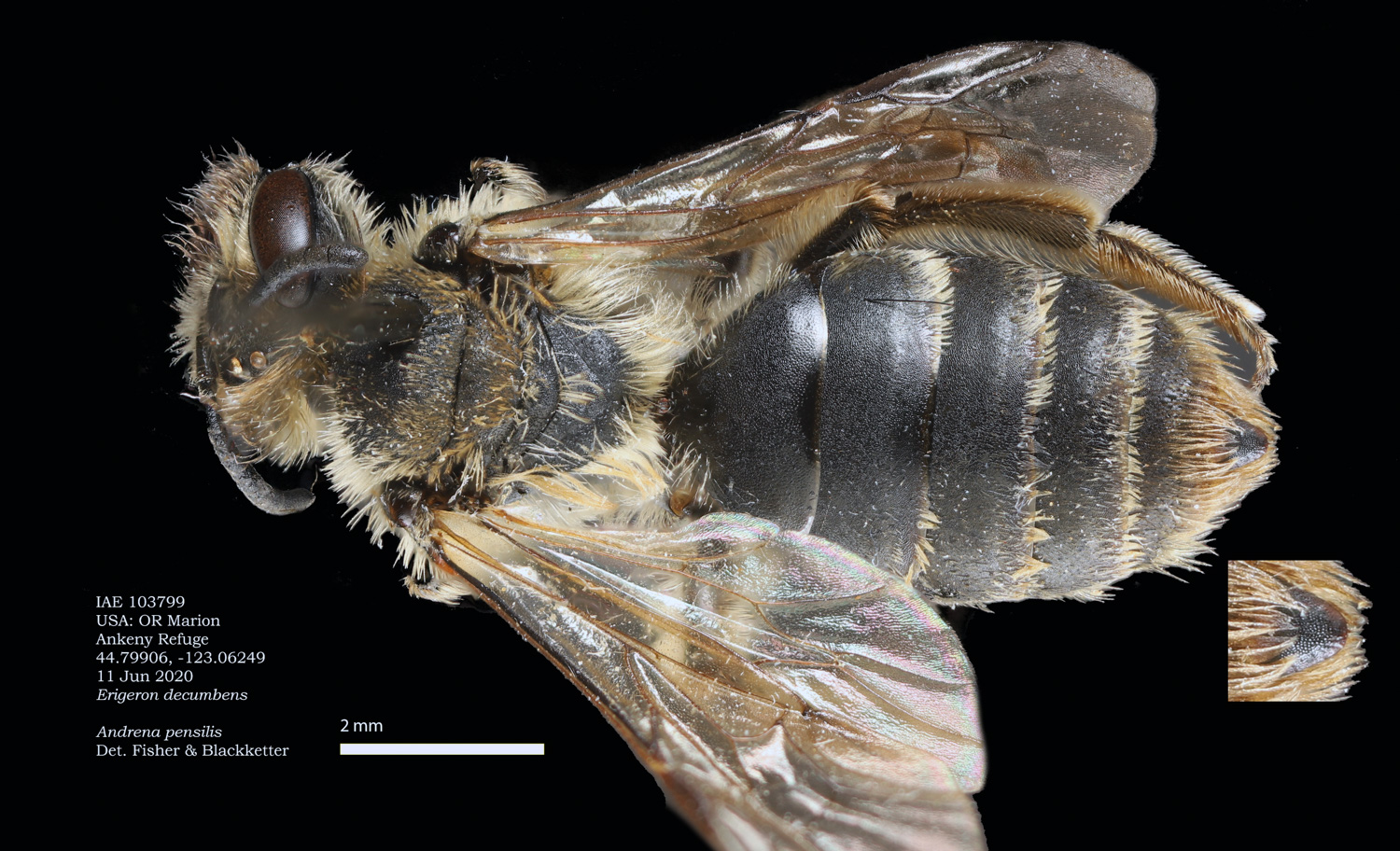 Result: Andrena orthocarpi or A. pensilis. Not pensilis, which has wavy clypeal hairs, and a long r vein. |