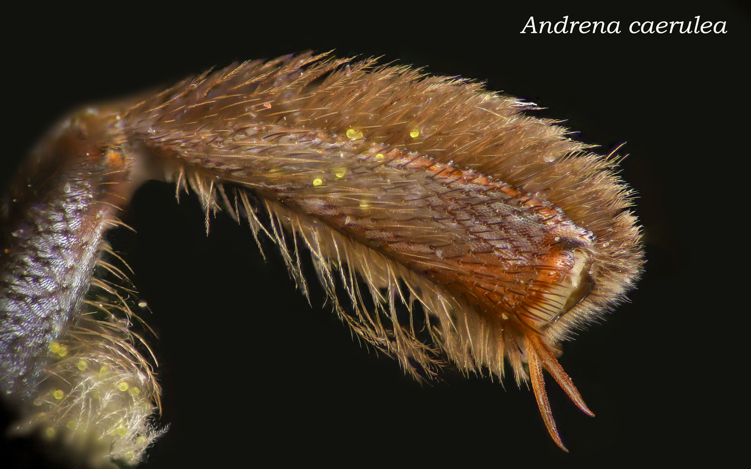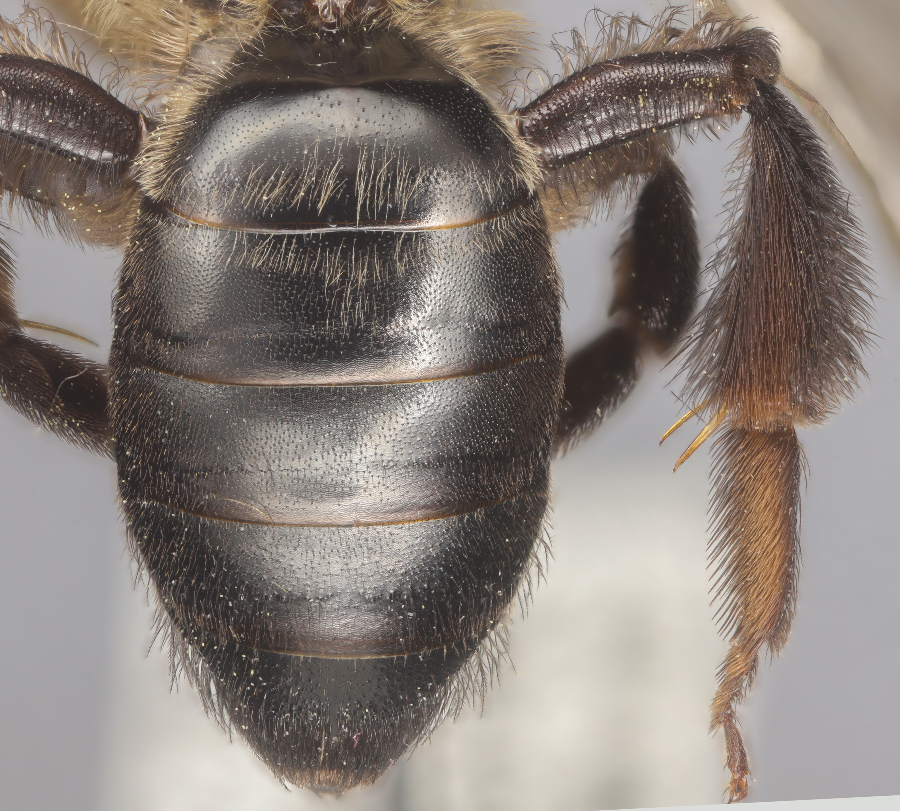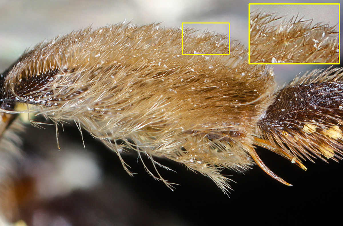Above: Highly plumose tibial scopa, dark(ish) hairs.