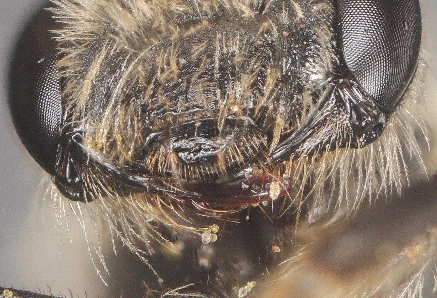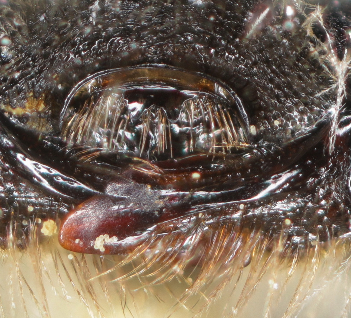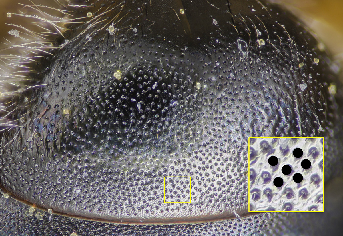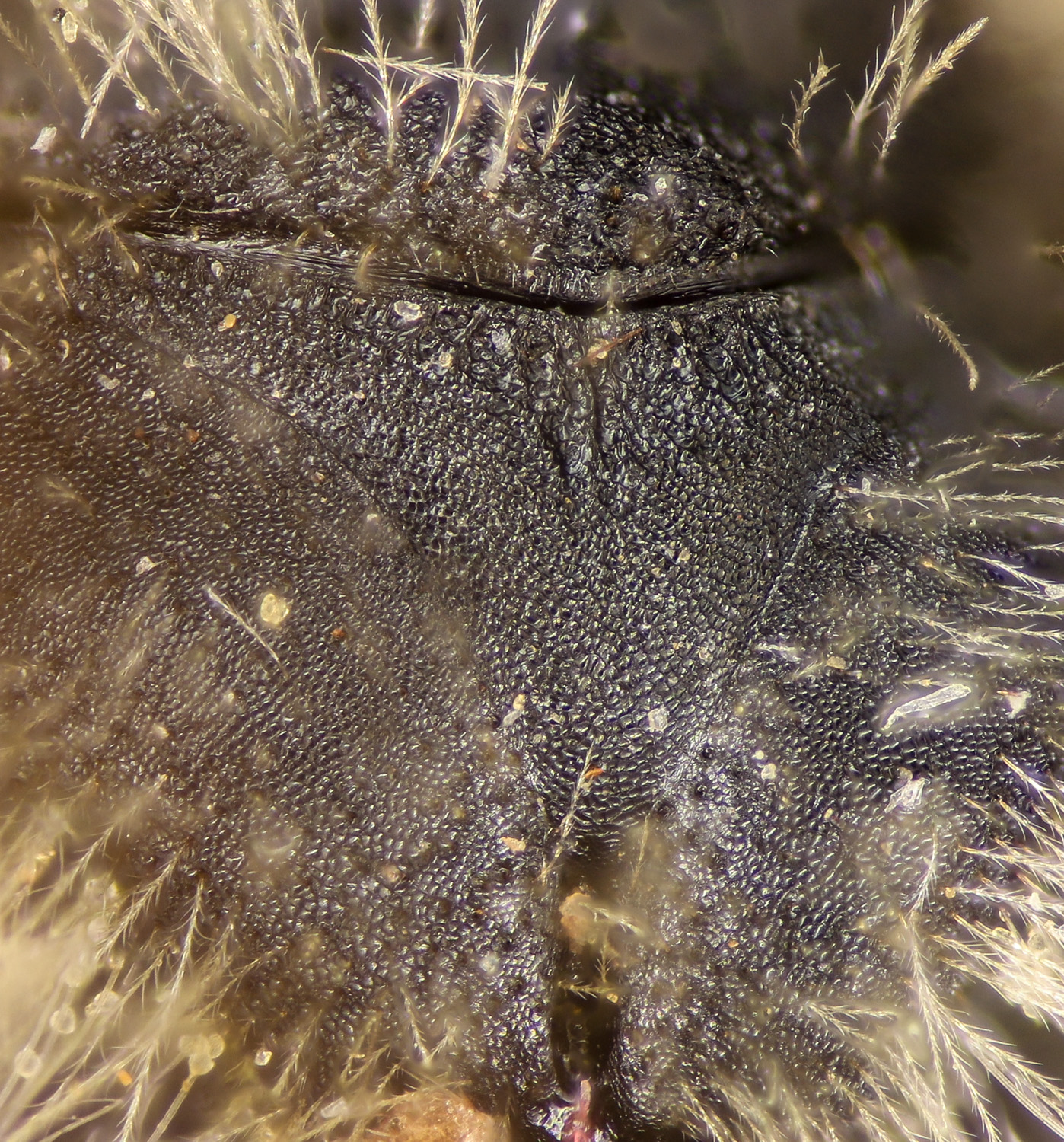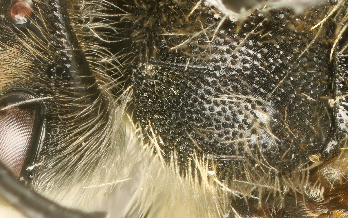 Clypeus dull. Fovea narrow. NOTE: the fovea appear dark. This is partly a trick of the lighting. But also, LaBerge says: "facial foveae with tomentum often pale brown or yellow in upper half or more." The DL guide scores for pale, and "dark above, pale below."" I might add "all dark" to the scoring. |