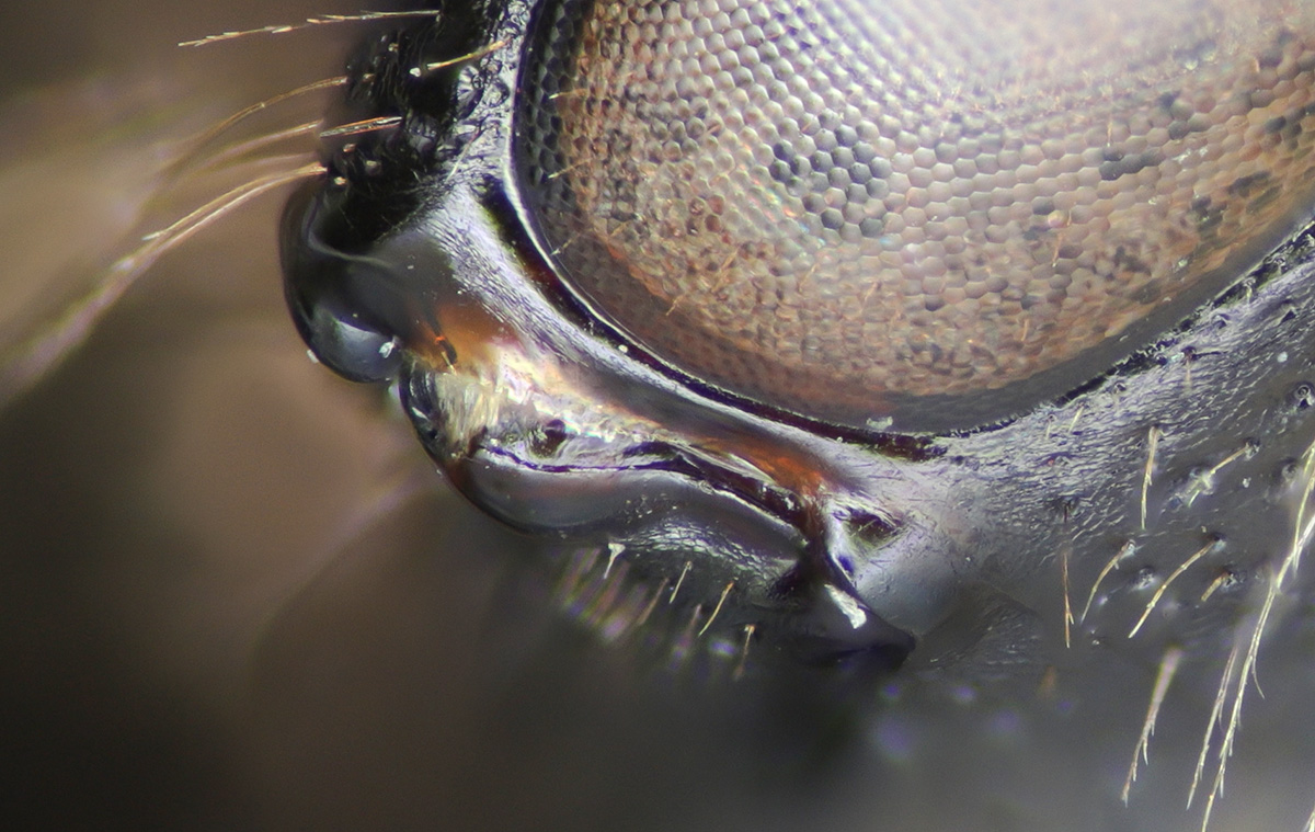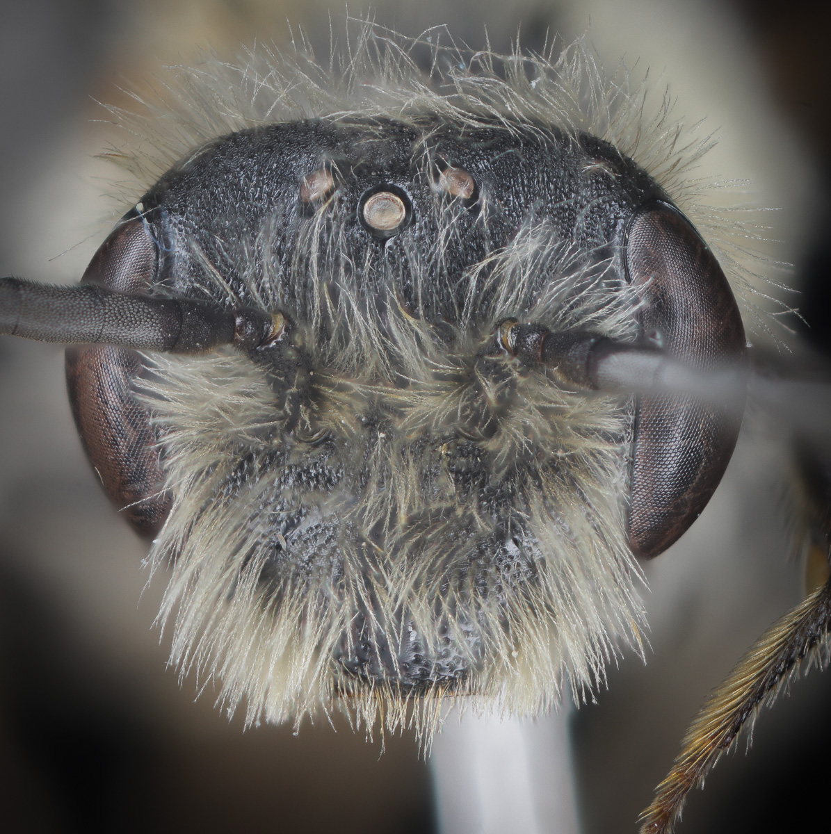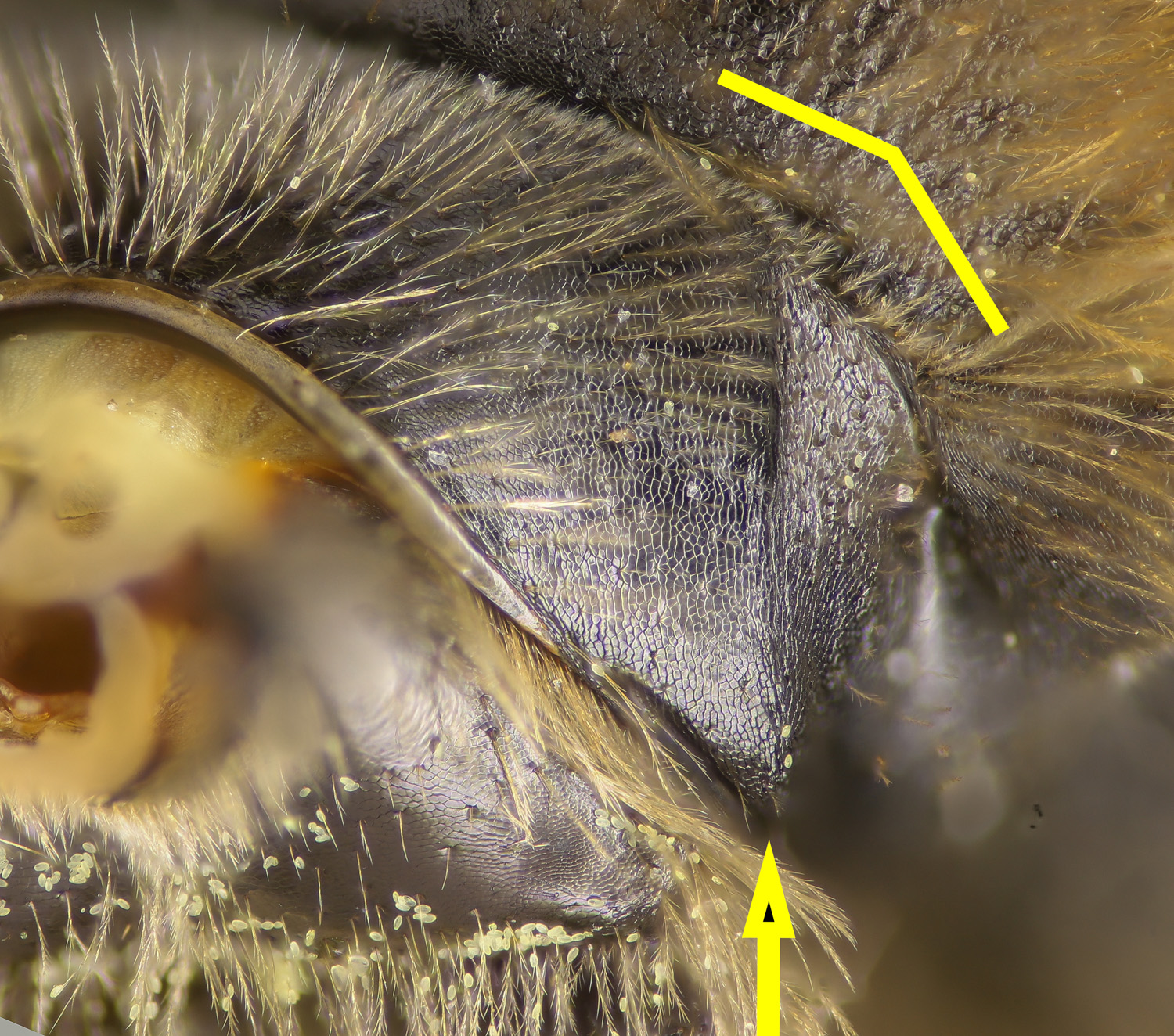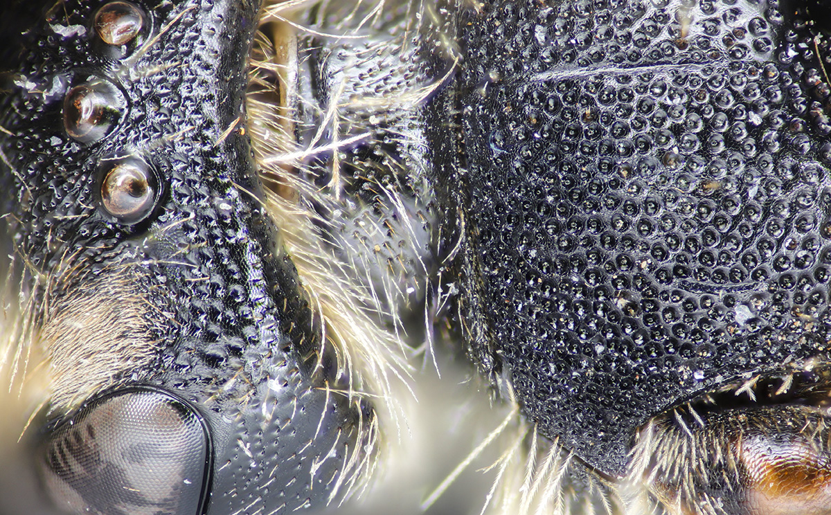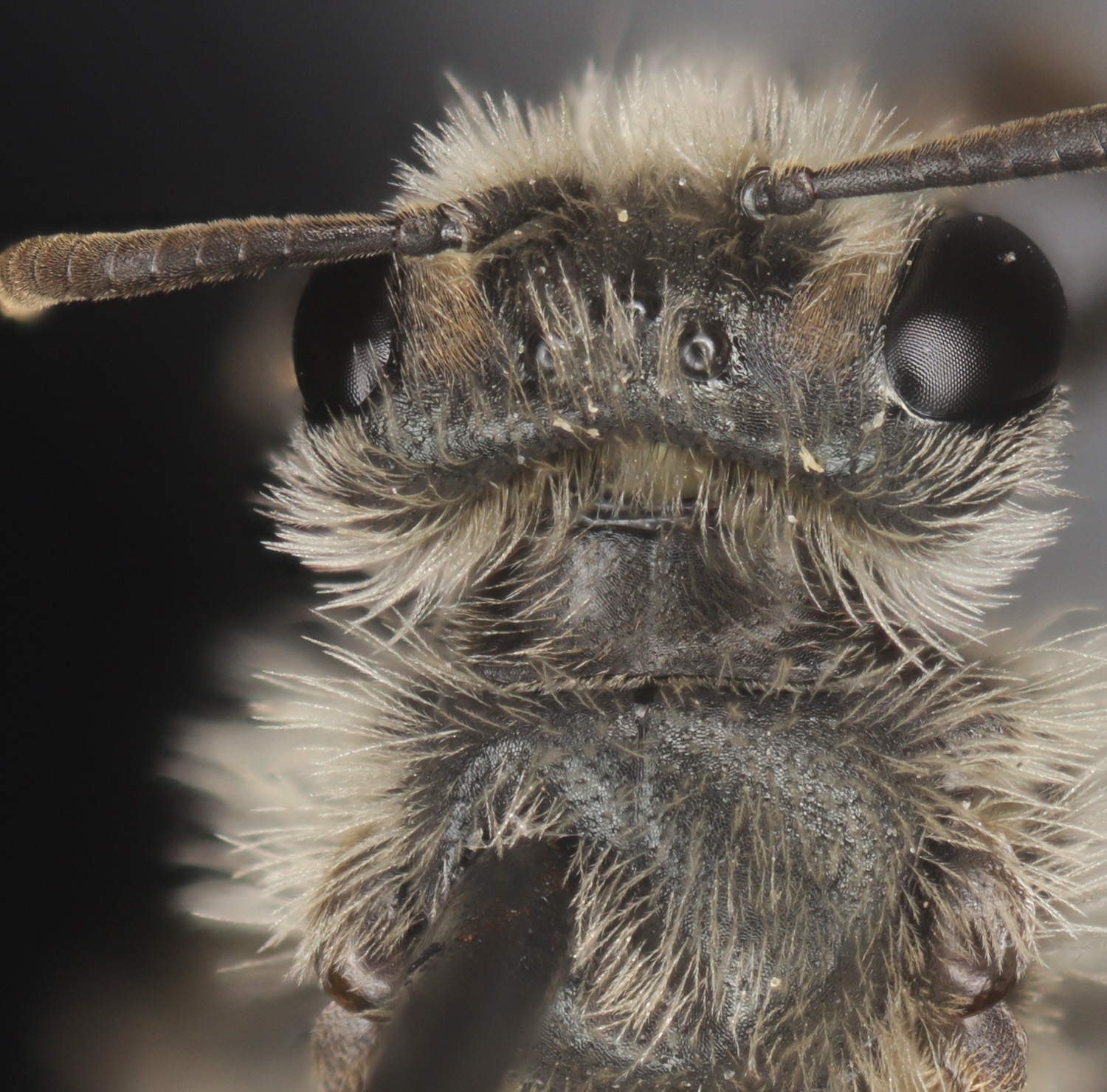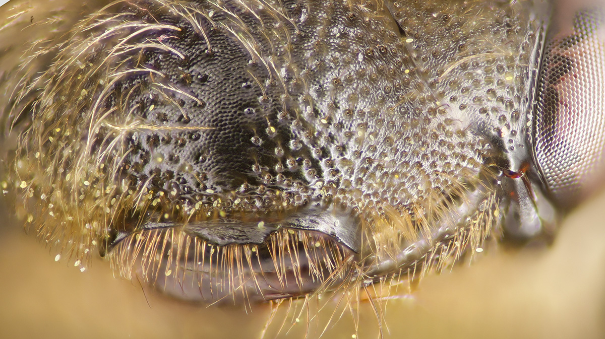 Clypeus dull. Fovea narrow. NOTE: the fovea appear dark. This is partly a trick of the lighting. But also, LaBerge says: "facial foveae with tomentum often pale brown or yellow in upper half or more." The DL guide scores for pale, and "dark above, pale below."" I might add "all dark" to the scoring. |
