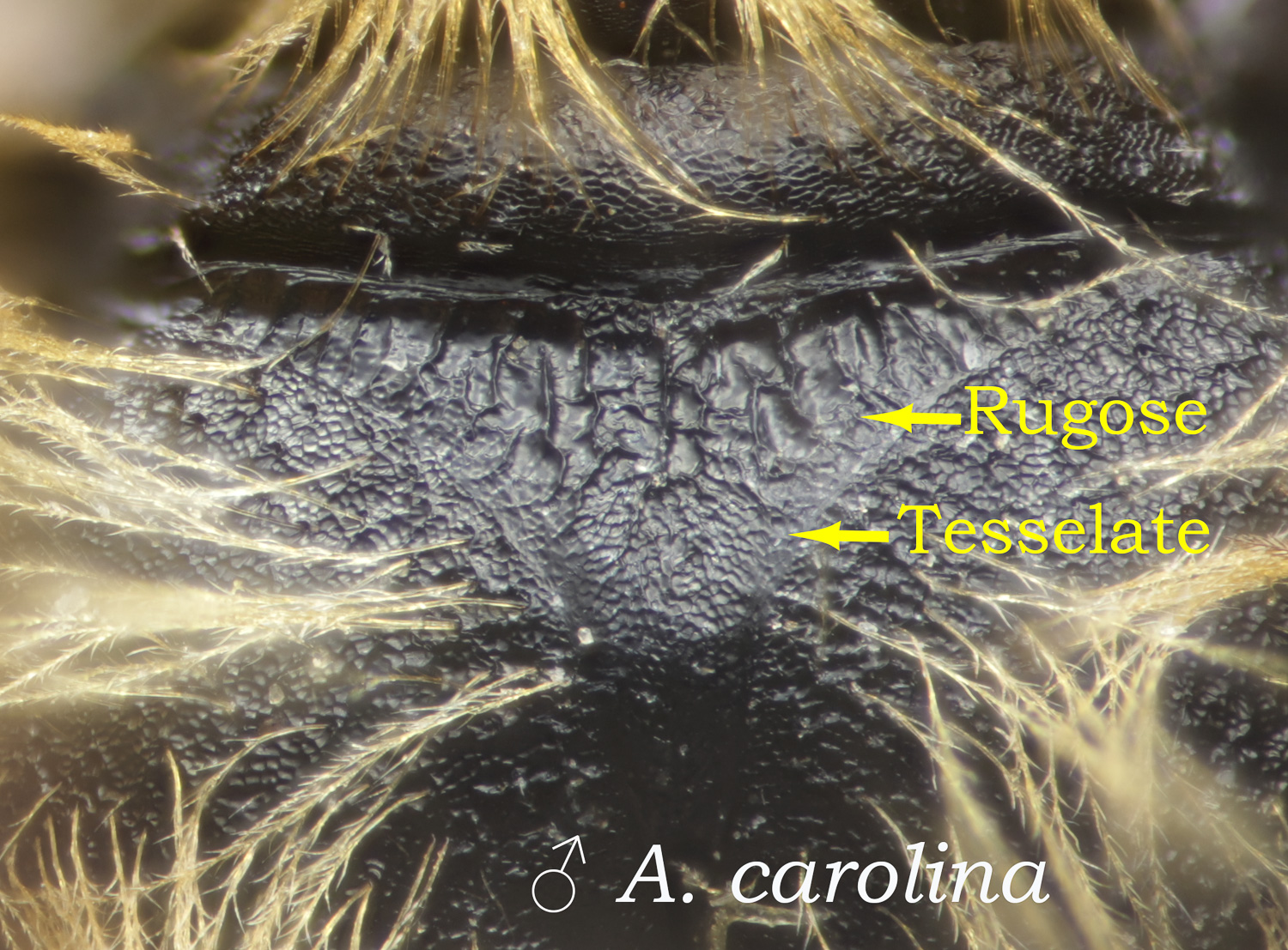 Above: Not miranda, described as unique among this group with "Propodeum with triangle without ridged sides, boundaries indistinct, adjacent areas often sculptured nearly as coarsely as triangle." My specimens: "propodeum distinctly finer outside than inside triangle" A. miranda or A. rugosa would also have tergum 2 with depressed apical area occupying three-fourths or more of midline" (about half for my specimens).