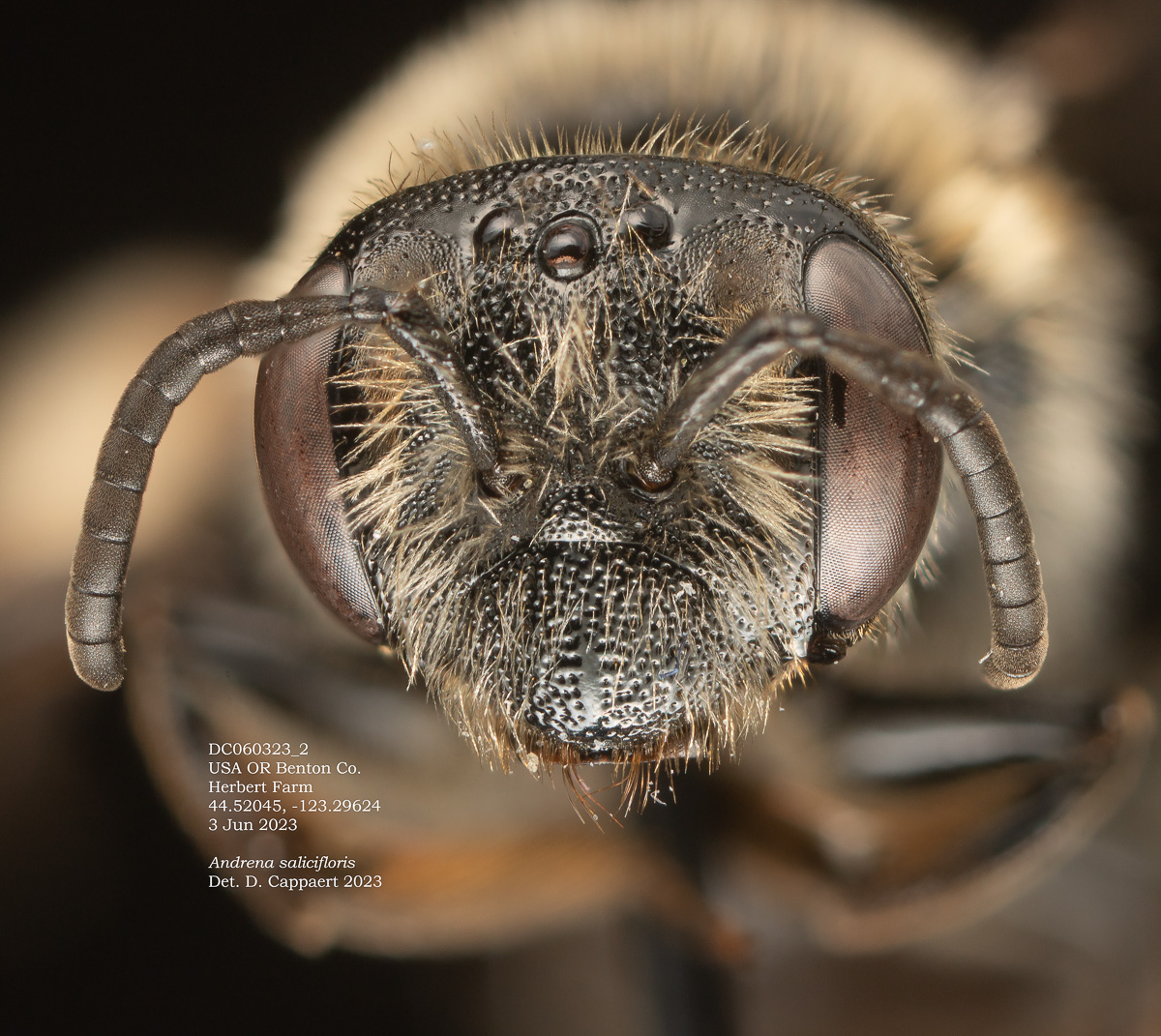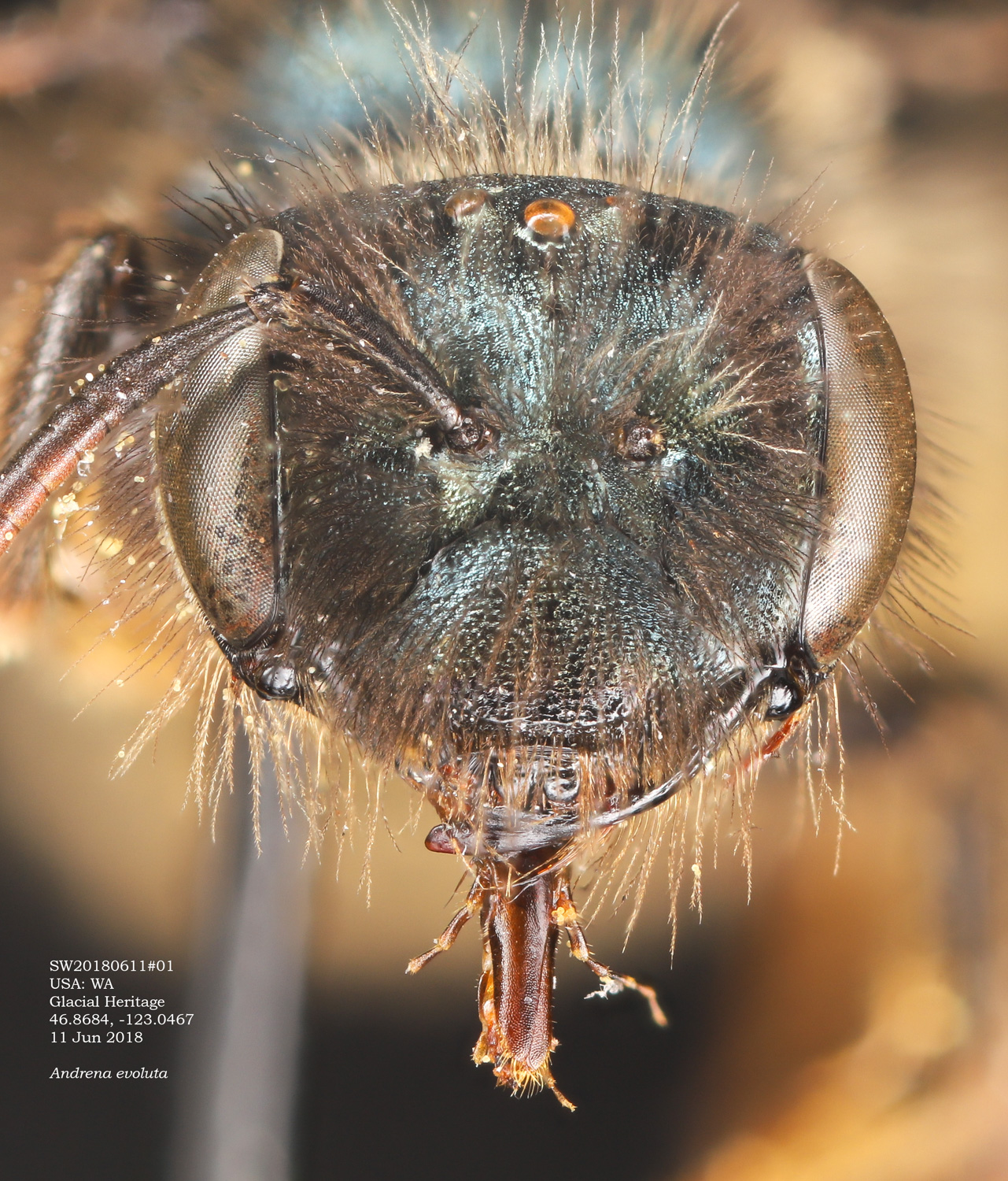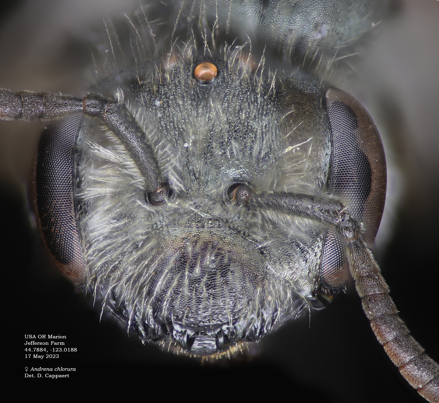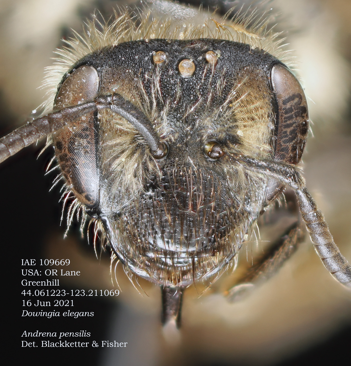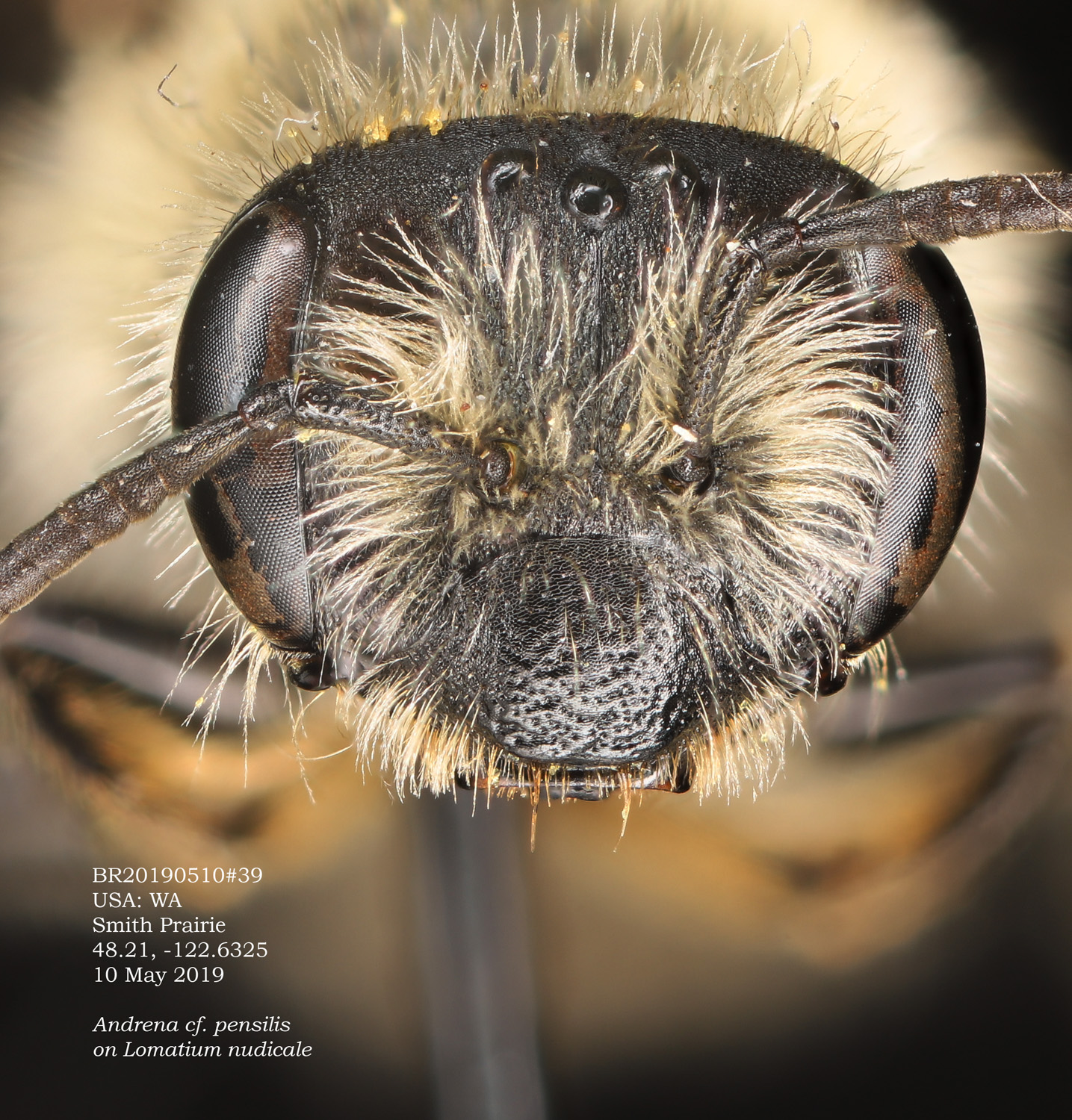 LaBerege: Andrena pensilis is a California species that is readily recognized in the female sex by the long, relative simple, tapering clypeal hairs, which are wavy distally (photo far right). This feature is evident in the half a dozen Oregon specimens I have. |