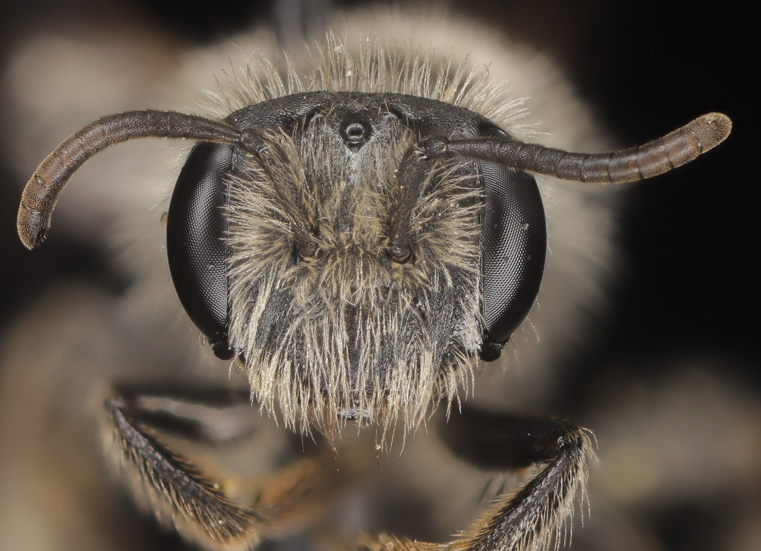 Below: Fovea long, malar space short, clypeal hairs plumose.