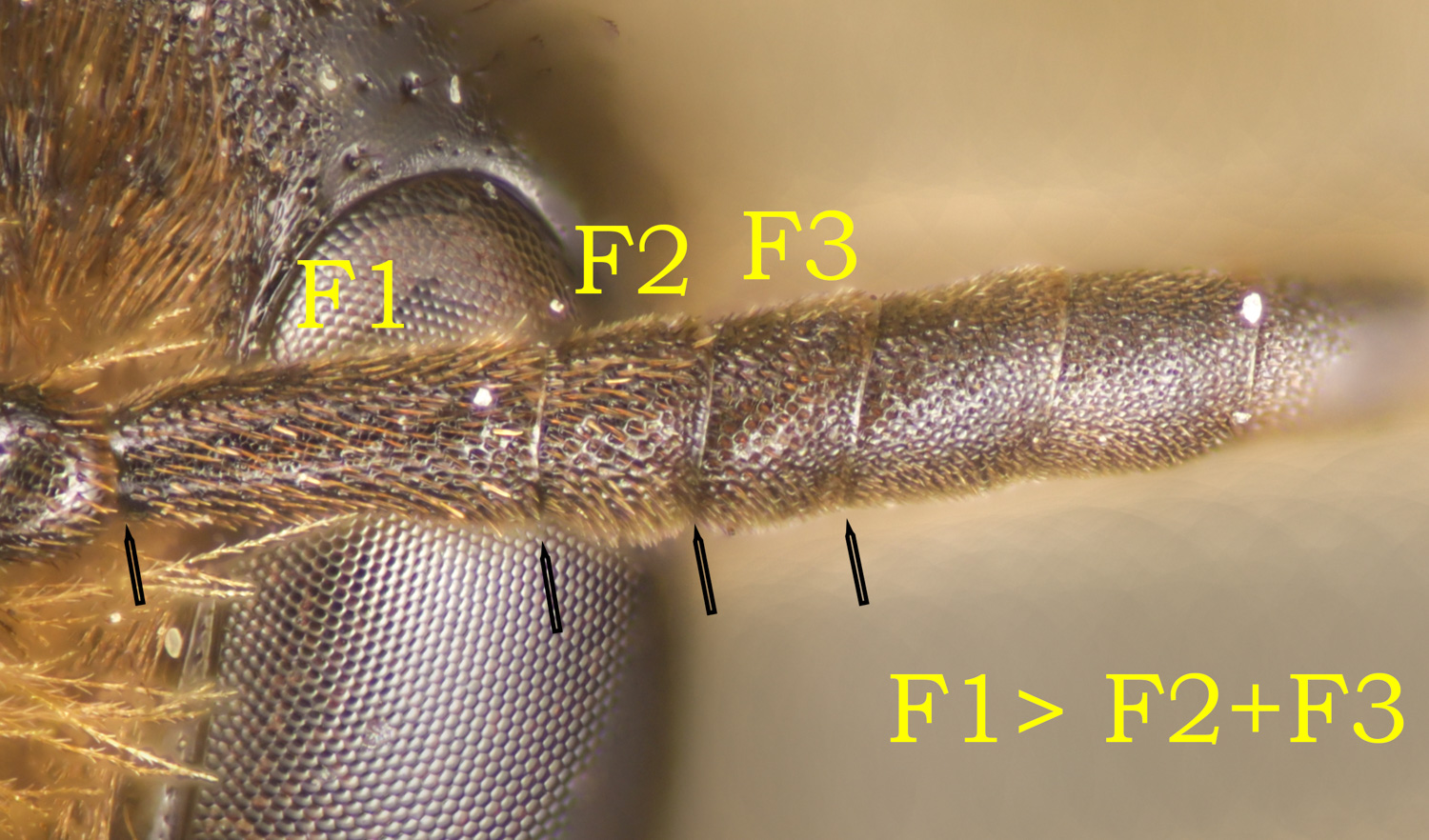 Clypeus dull, hairy, plumose. F1 long.