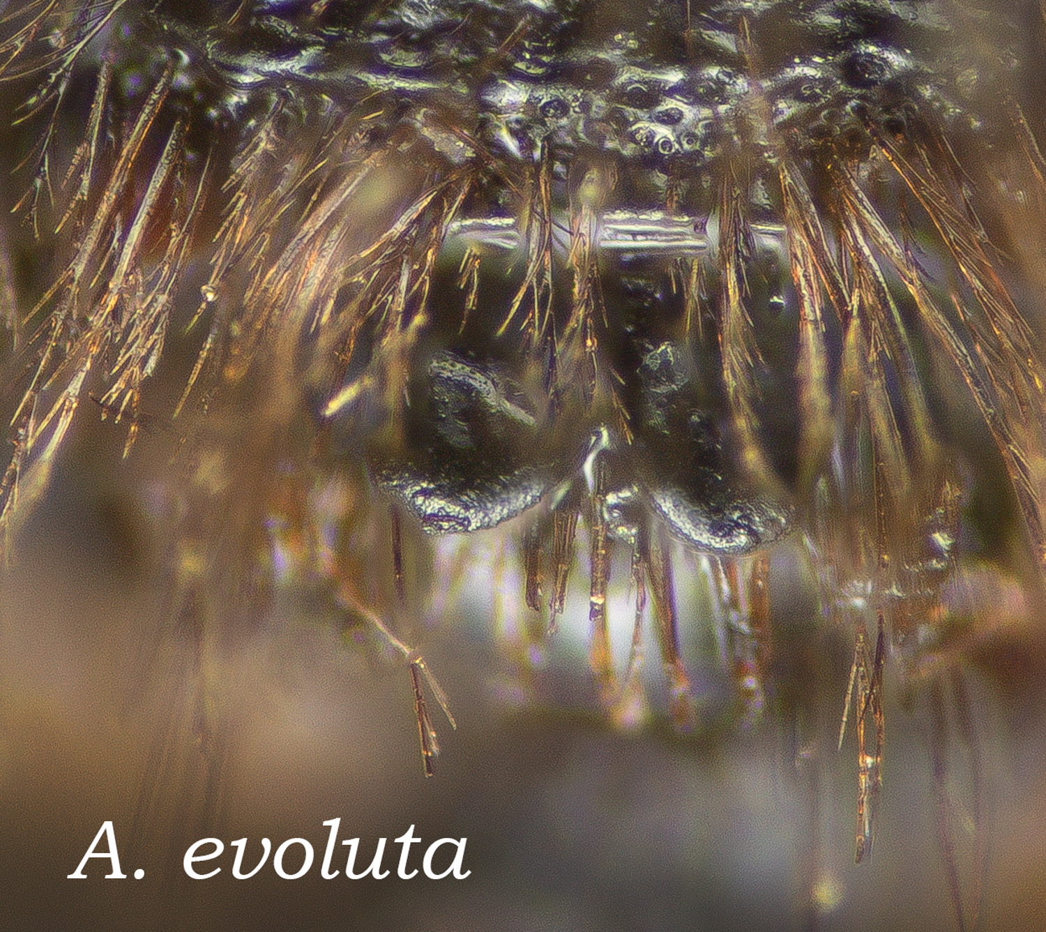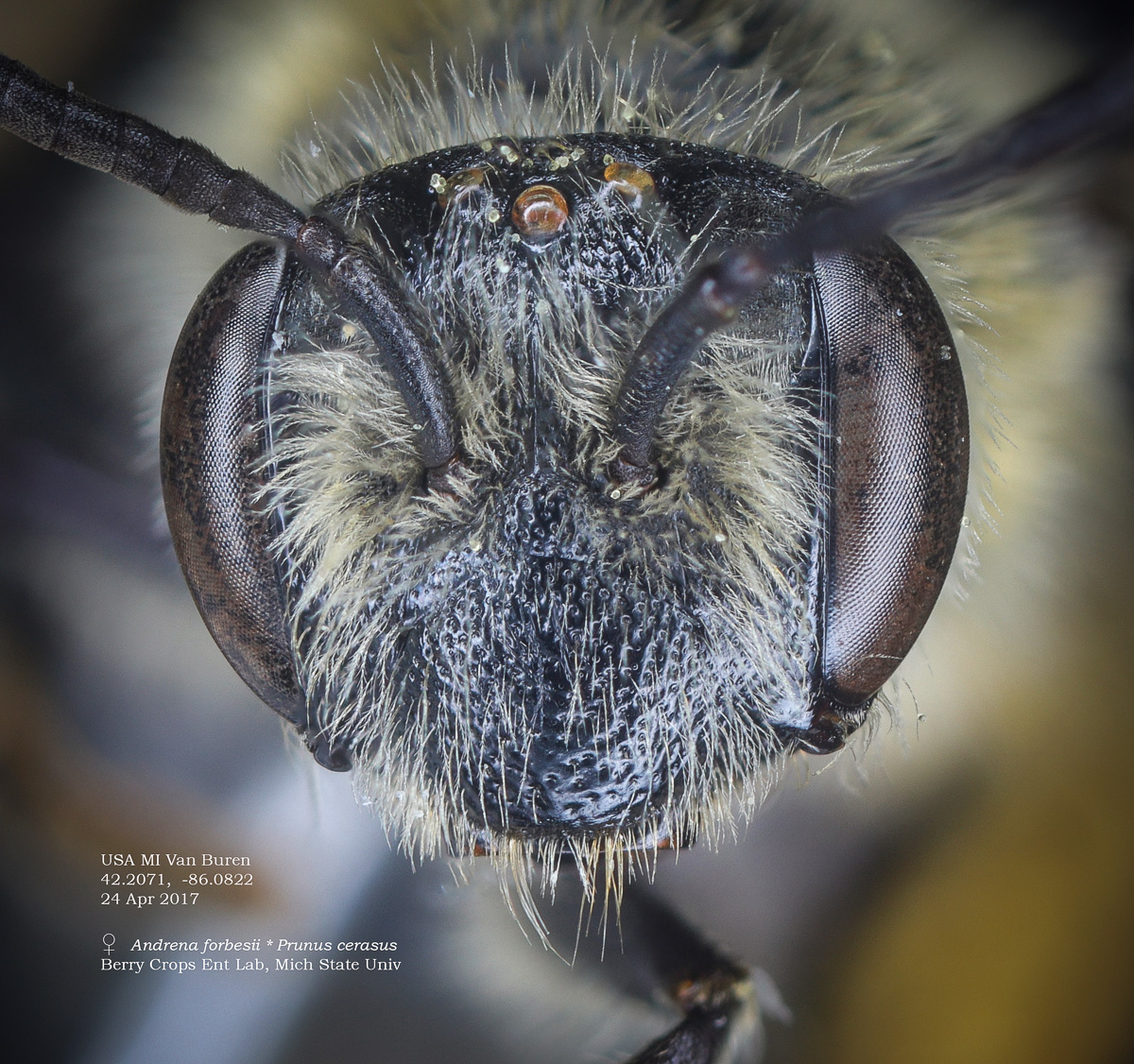 DL comments specific to A. forbesii: Face below ocelli duller than parocular area, with weak rugulae longitudinal or lacking, with punctures separated mostly by 0.5 puncture widths or less - Vertex above lateral ocelli equals 1.5 ocellar diameters or slightly less - Scutum hairs normal, long, erect, usually slender