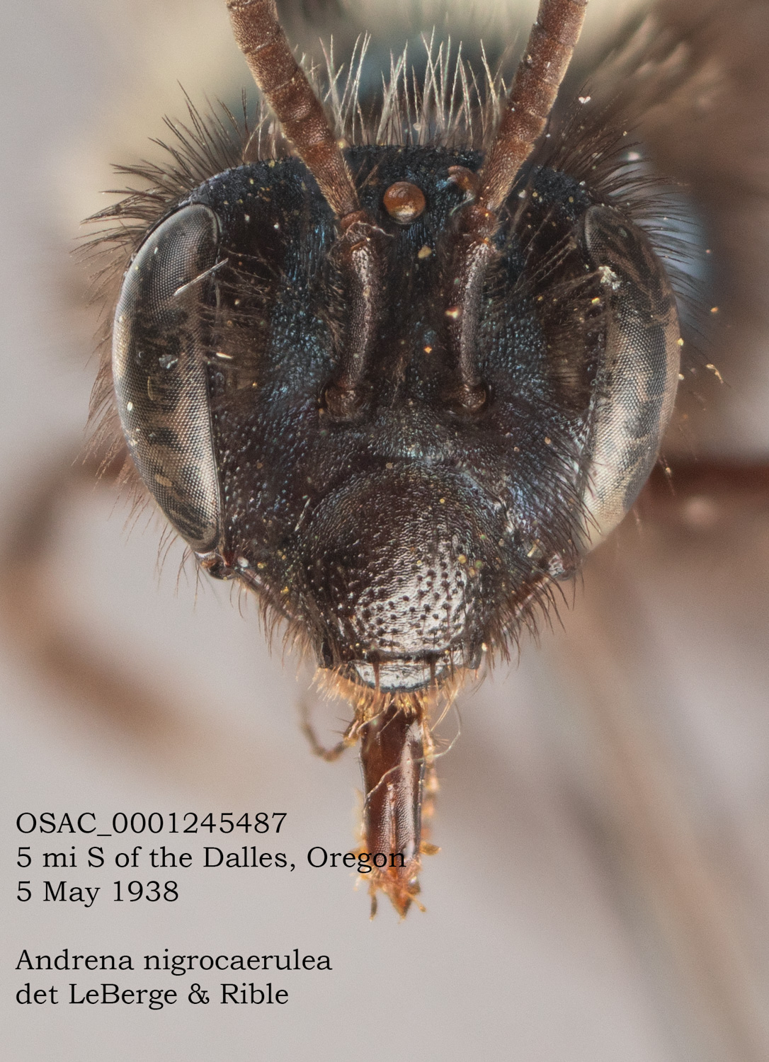 ... yields A. nigrocaerulea in DiscoverLife. LaBerge: "The female of A. nigrocaerulea is readily distinguished from related species by the extensive dark body hairs, the complete lack of apical metasomal fasciae, the usually punctate and often shiny clypeus, and the metallic blue-black color of the integument." I assume here that "often shiny clypeus" does not preclude my specimens with a dull clypeus (which otherwise matches the image of the OSAC specimen below). |