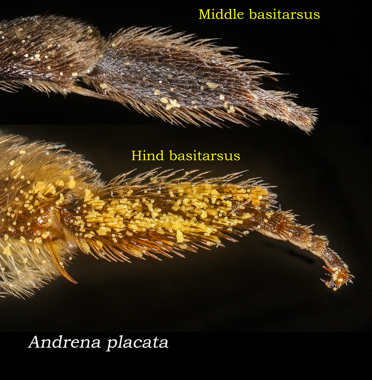 Below:Of the three options, only A. placata has the middle leg basitatsus "expanded medially, broader than hind basitarsus."" |