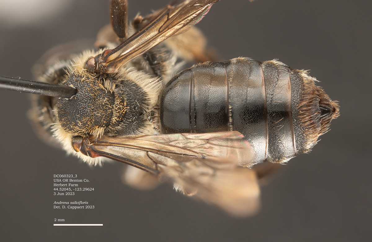 All matches are subgenus Trachandrena, characterized coarse sculpturing, an entirely rugose, enclosed propodeum, and fovea narrowed at the level of the antennal socket. DL does not unamnbiguously resolve species. So I consulted A Revision of the Bees of the Genus Andrena of the Western Hemisphere. Part VI. Subgenus Trachandrena (LaBerge). A. fuscicauda doesn't match this specimen in several respects. Differentiating miranda and salicifloris is harder. |