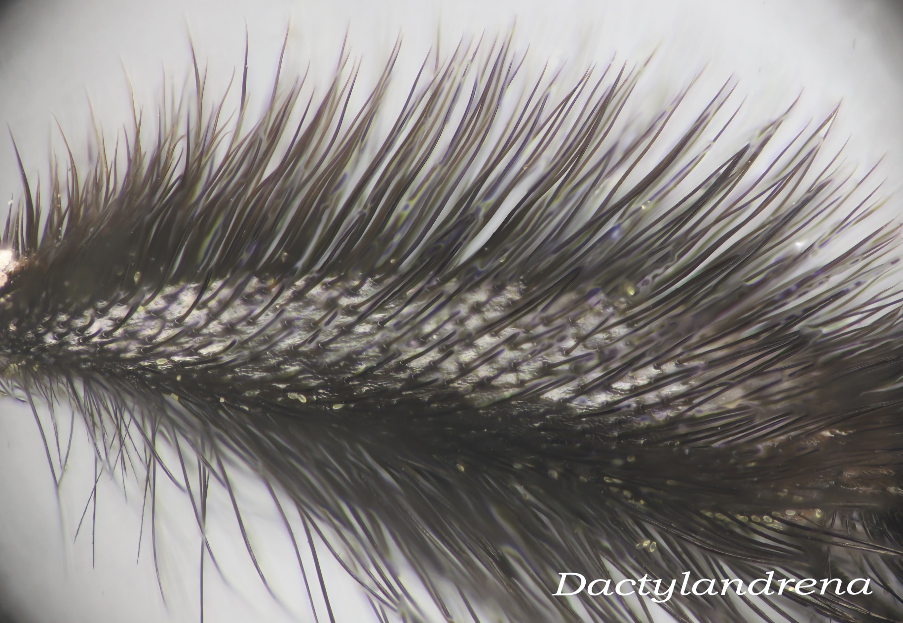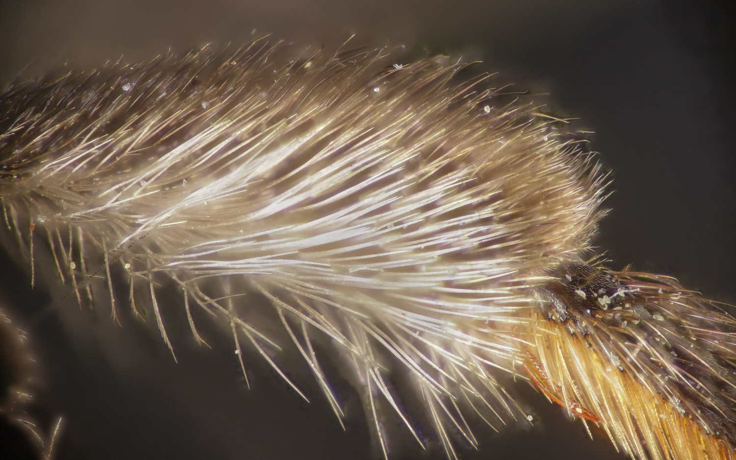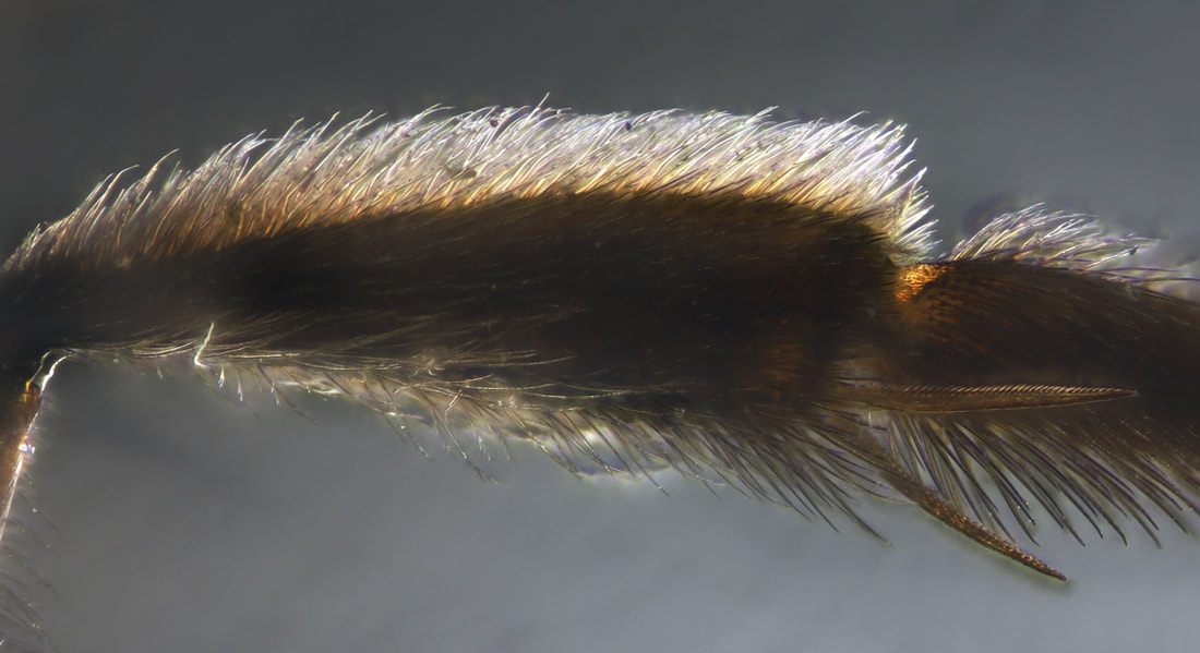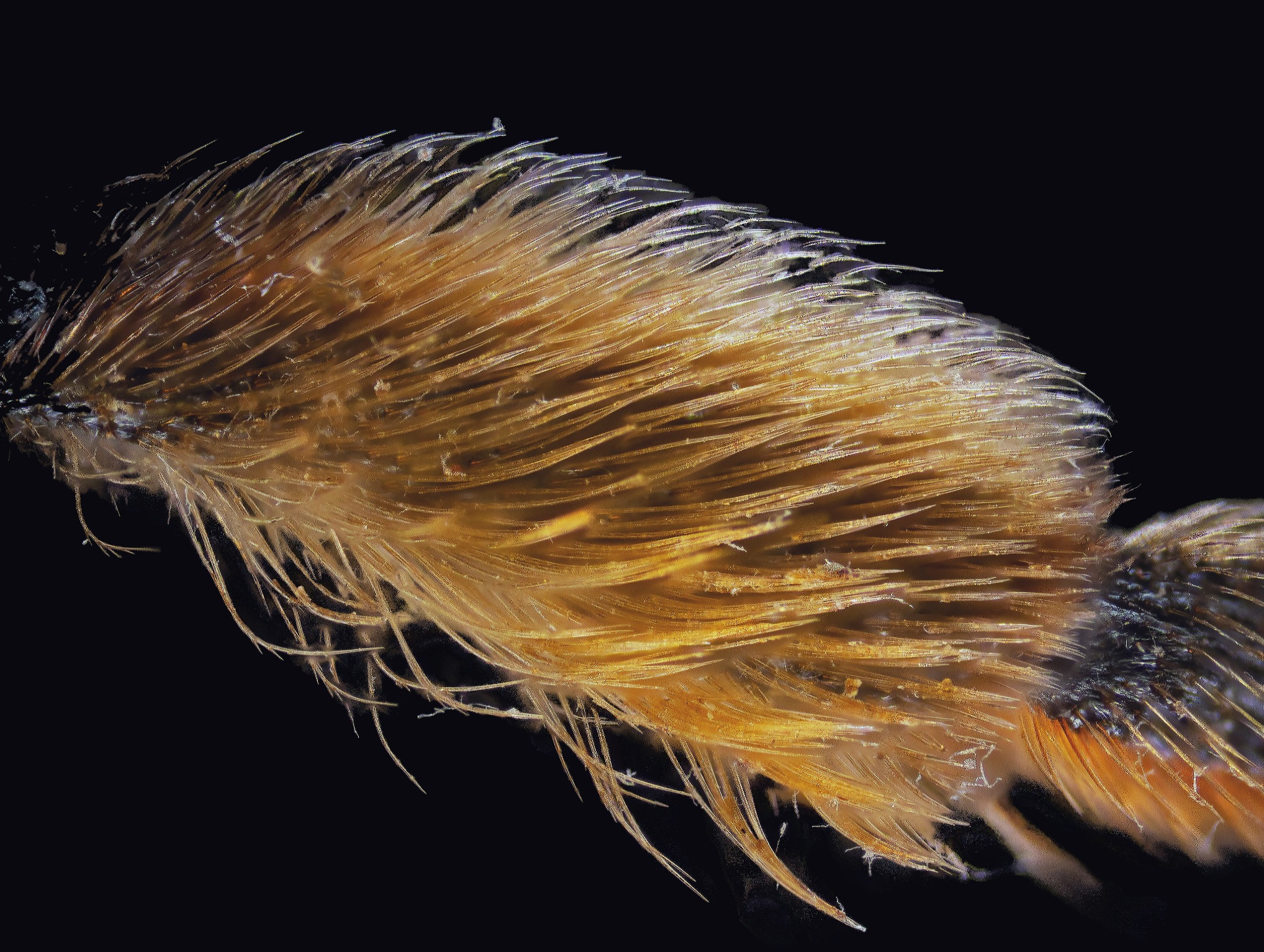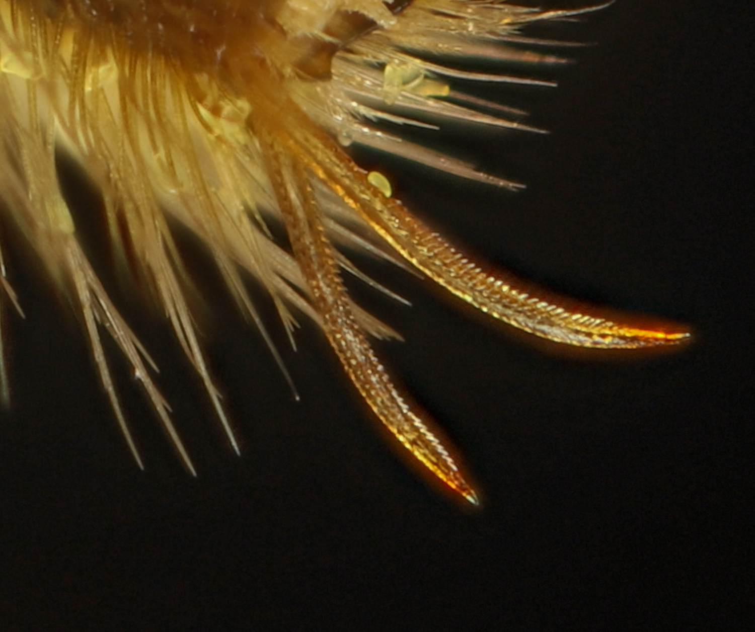 Trickier: incomplete flocculus of A. vicina. The proximal hairs (at right) are nearly straight.