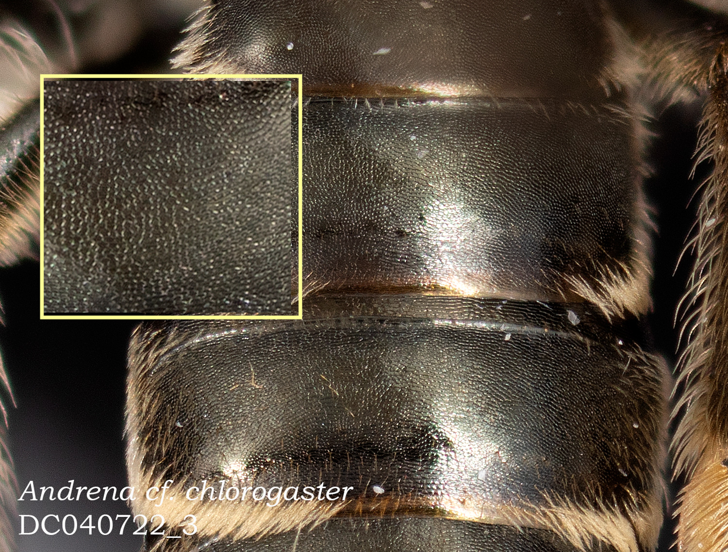 Shiny/dull; impunctate band. Also: clypeus flat. This was so evident that I wondered if it was unusual. In DL, I find that there are only 2 Andrena species with this trait. This one is erythronii.