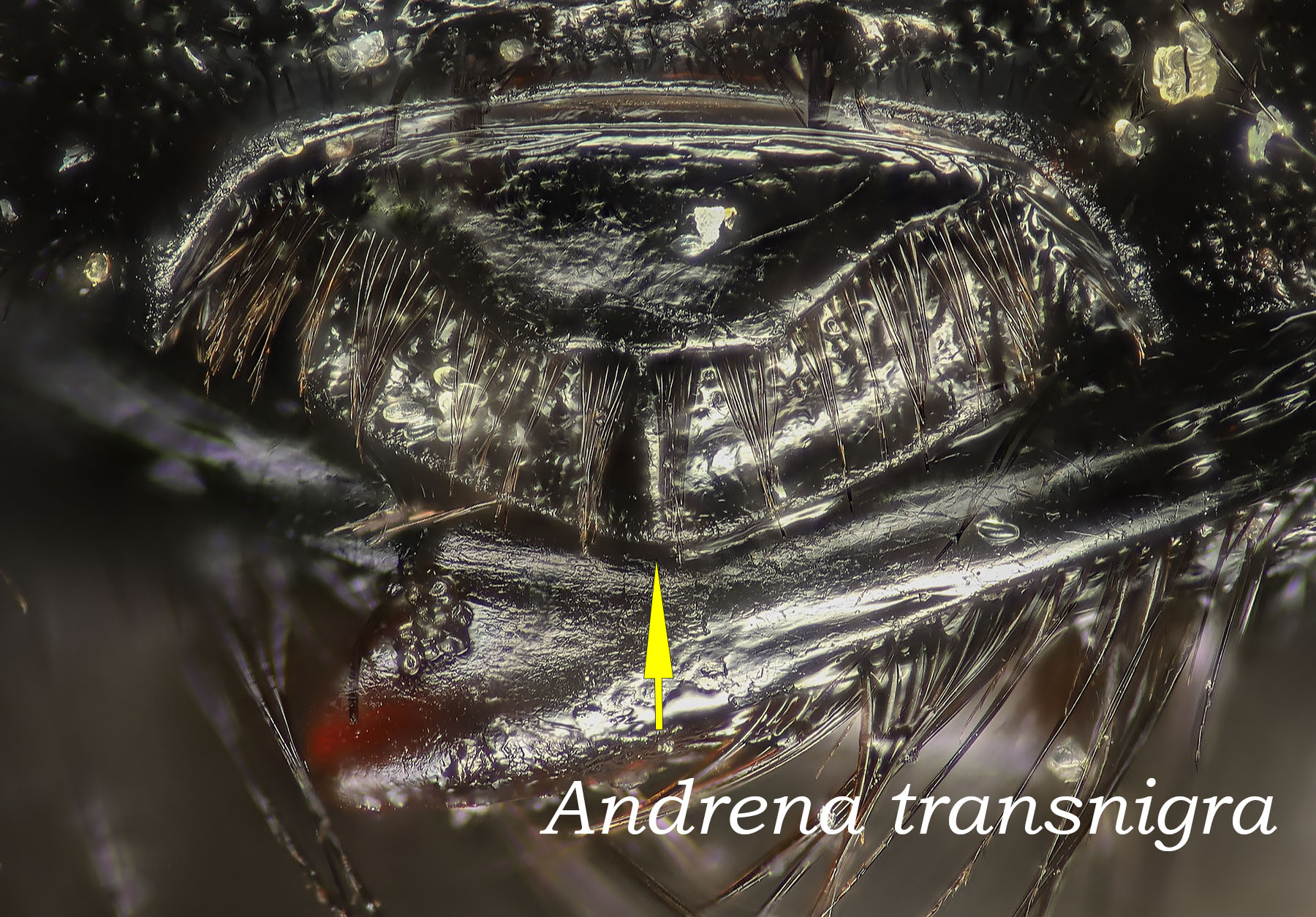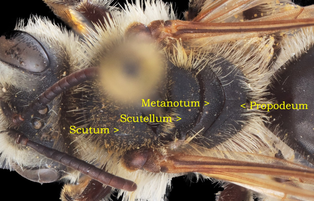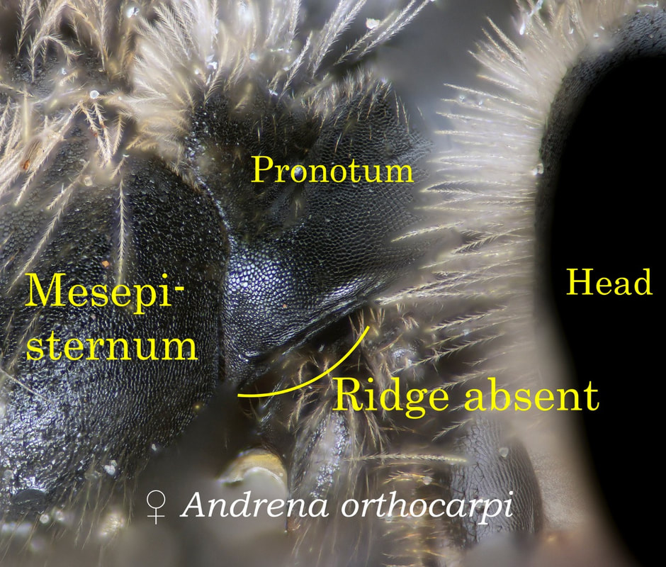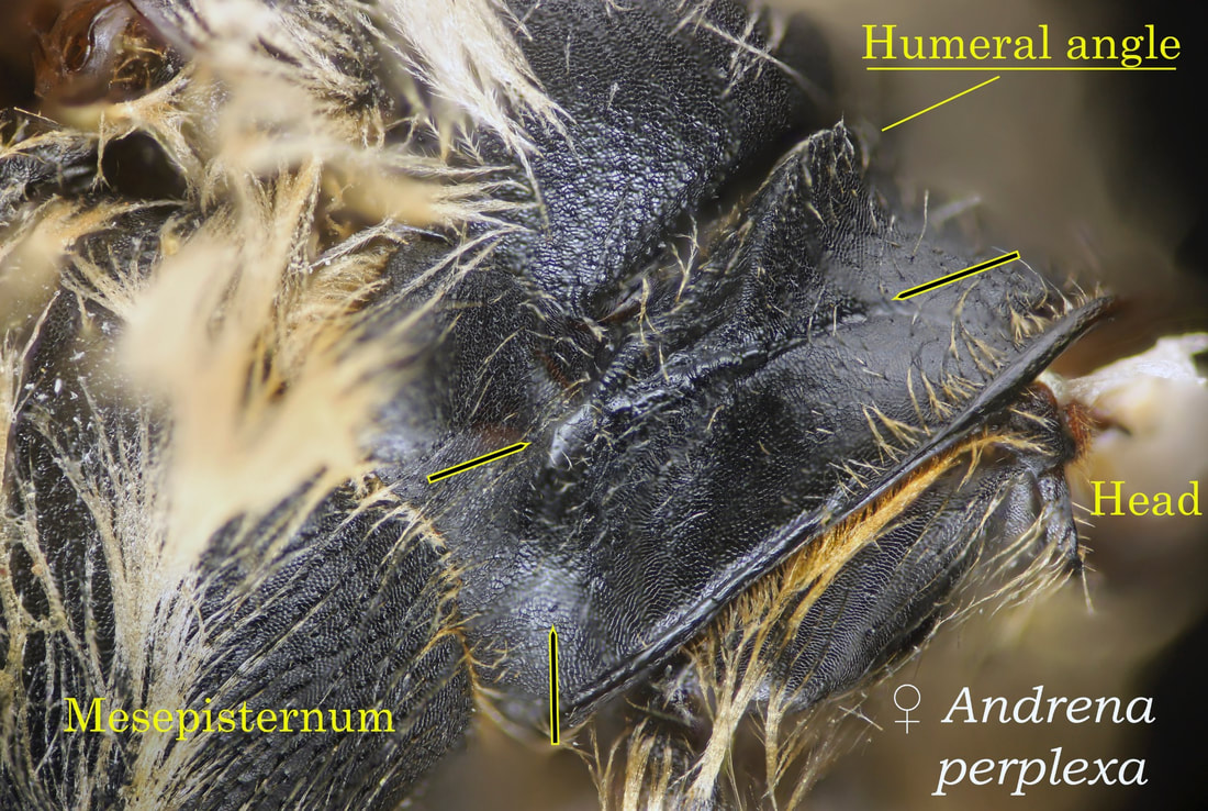 Photo at right: Andrena nivalis, specimen determined by LeBerge. The humeral angle is akin to shoulder when viewed from in front. From the side, as in this image, it is difficult to judge, but the angle is absent (or weak). There is a discernible crease on the pronotum in this image. It is NOT a pronotal ridge - it does not extend down from the humeral angle. Note from Joel Gardner, who explained this to me: [The lateral sulcus] is present on almost all species that lack a pronotal ridge, Scaphandrena being the main exception (the absence of the lateral sulcus is a good way to recognize certain Scaphandrena). Most species that have a pronotal ridge lack a lateral sulcus, "Tylandrena" (in the classical sense) being the main exception. |