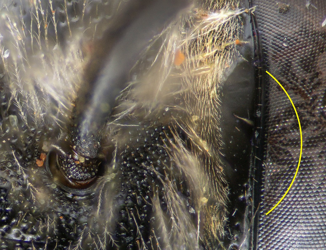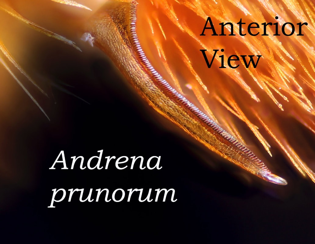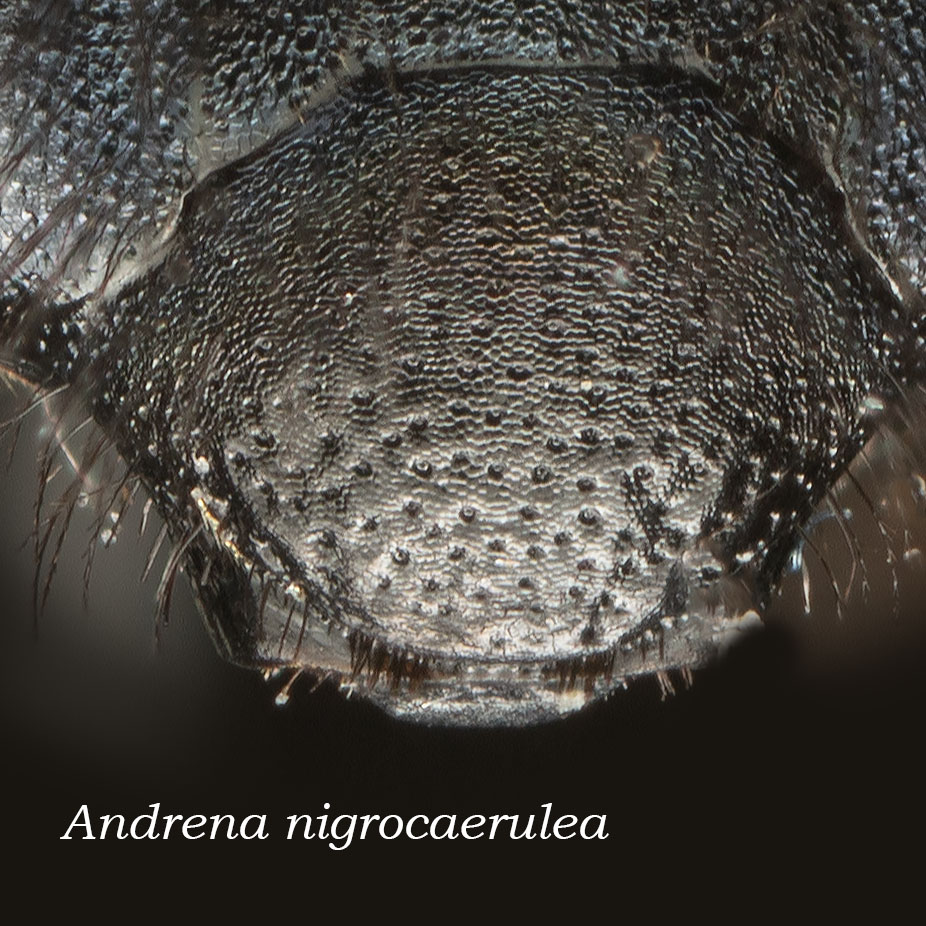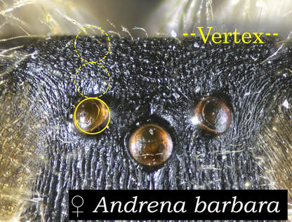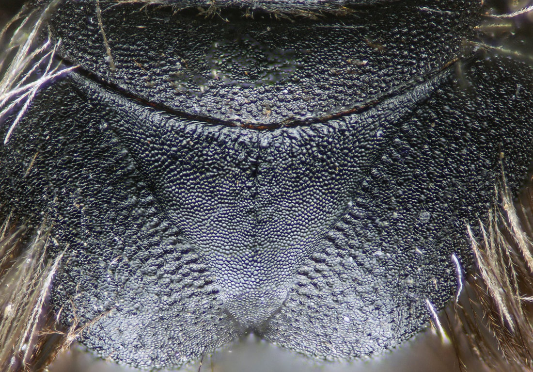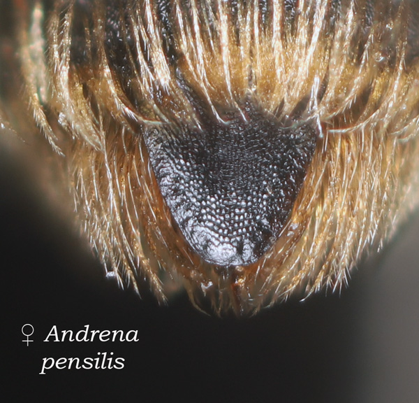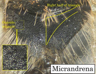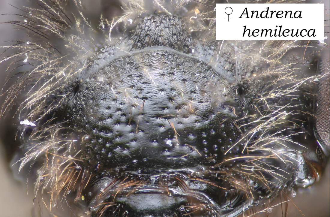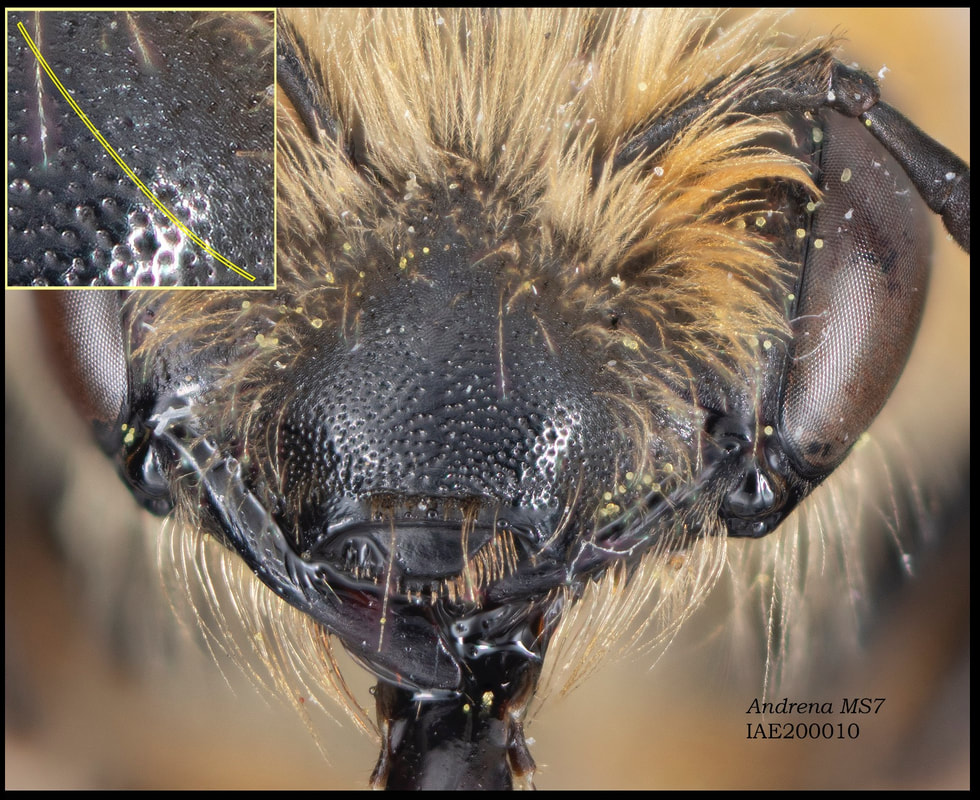 This set of pages is intended as a companion to the DiscoverLife key to Andrena females. The DL key is not for the faint of heart; it contains 100 trait descriptors, and 521 taxa, likely close to the US total. Though daunting, DL is intended for the non-specialist, people that don't have large collections or fluency in the technical language of taxonomists. The key is mainly in plain English. It offers figures and images to explain characters. It is interactive - a user can winnow down the list of possible matches using only characters they can interpret with some confidence. However: A new user will struggle, until they have spent a hundred hours thinking hard about the characters, looking up the occasional difficult term, and getting it wrong too many times. At least, that has been my experience. What the key - any key - needs is really clear photos that show what a trait condition looks like under a scope. I've been adding these to the DL key, and I repurpose them here, so that I can show them at hi-res [click images to enlarge], and with explanatory comment. |