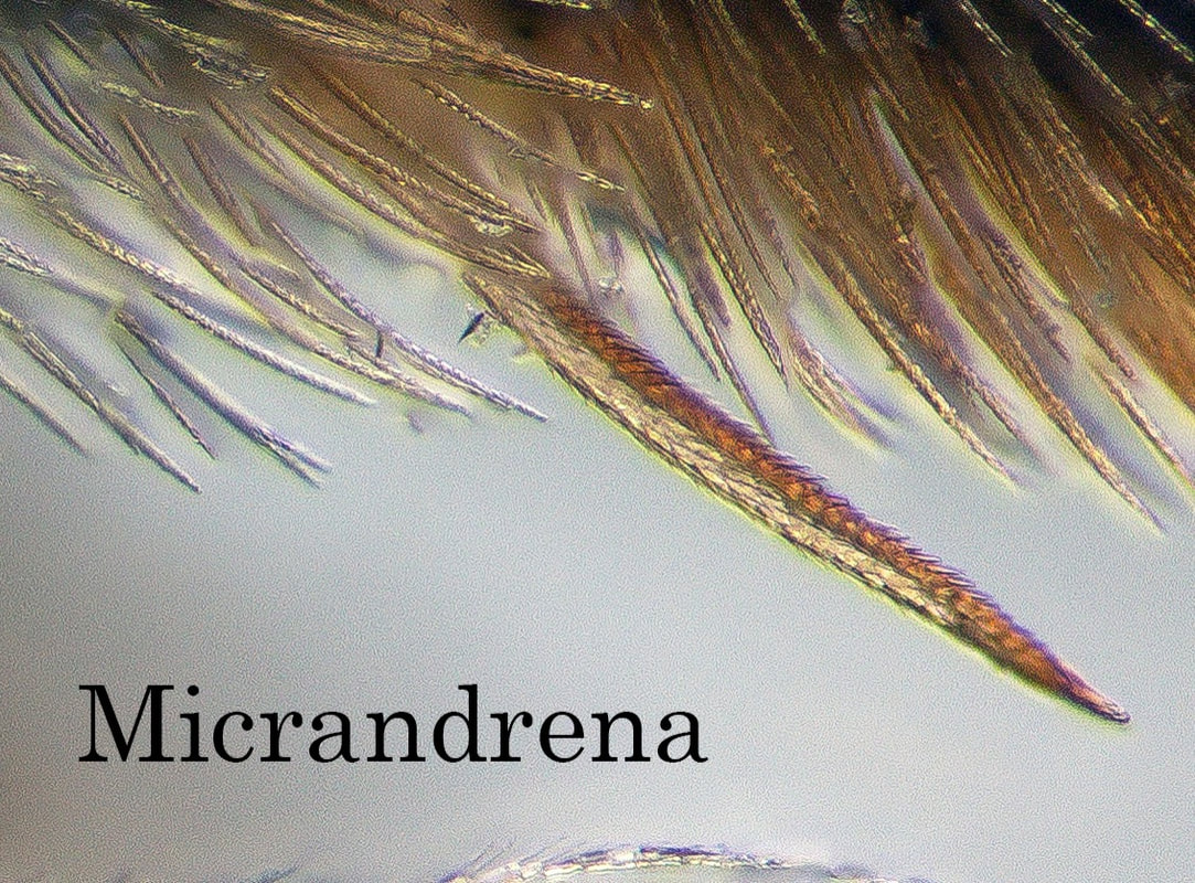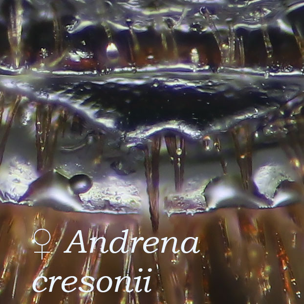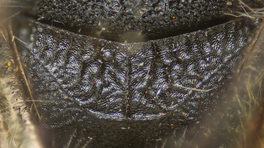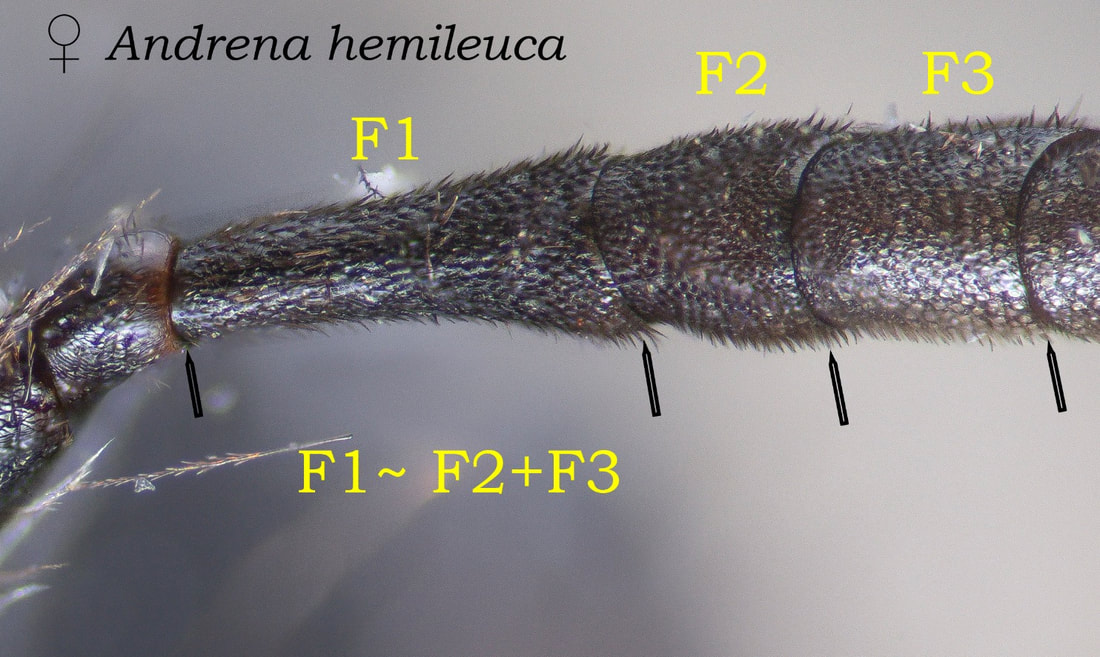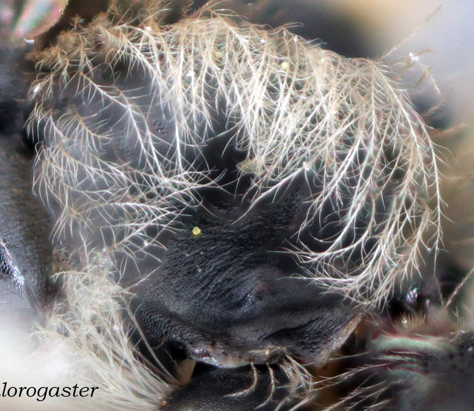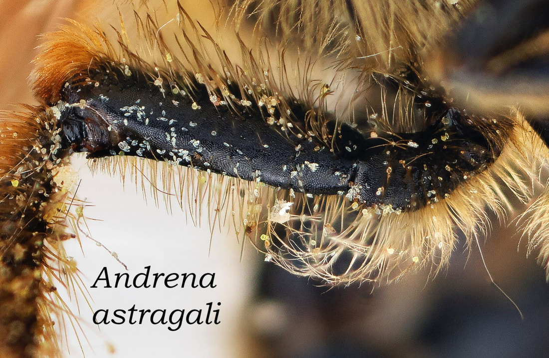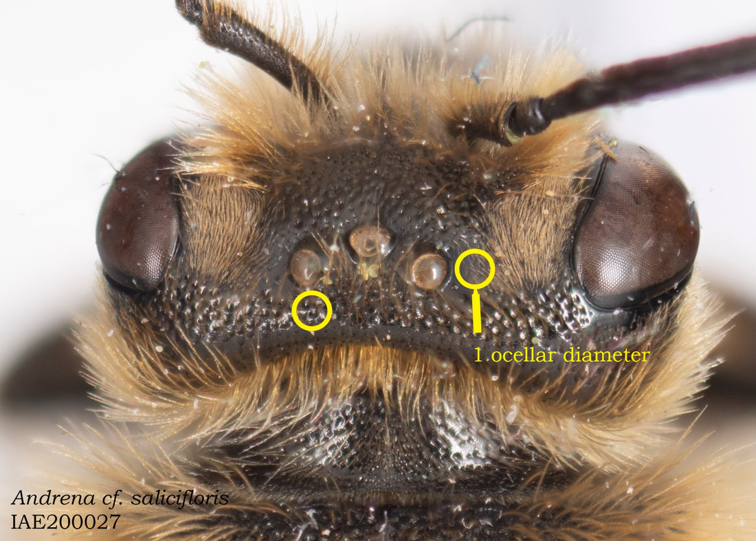 This set of pages is intended as a companion to the DiscoverLife key to Andrena females. The DL key is not for the faint of heart; it contains 100 trait descriptors, and 521 taxa, likely close to the US total. Though daunting, DL is intended for the non-specialist, people that don't have large collections or fluency in the technical language of taxonomists. The key is mainly in plain English. It offers figures and images to explain characters. It is interactive - a user can winnow down the list of possible matches using only characters they can interpret with some confidence. However: A new user will struggle, until they have spent a hundred hours thinking hard about the characters, looking up the occasional difficult term, and getting it wrong too many times. At least, that has been my experience. What the key - any key - needs is really clear photos that show what a trait condition looks like under a scope. I've been adding these to the DL key, and I repurpose them here, so that I can show them at hi-res [click images to enlarge], and with explanatory comment. |
