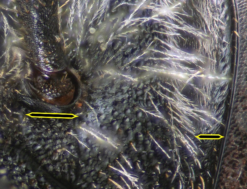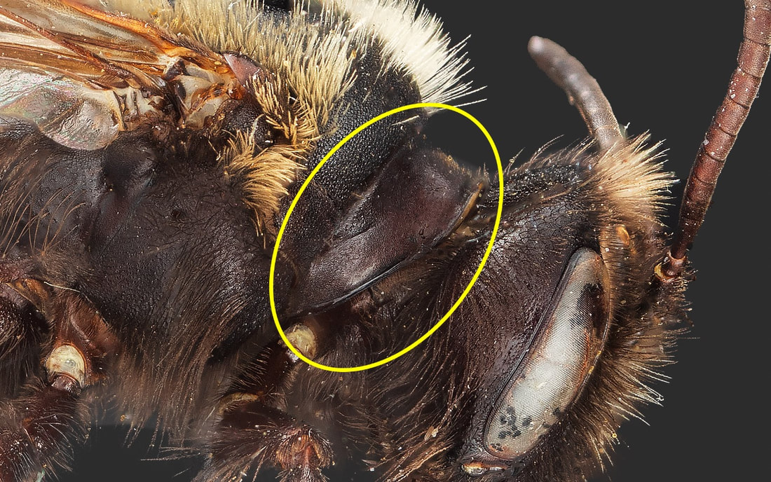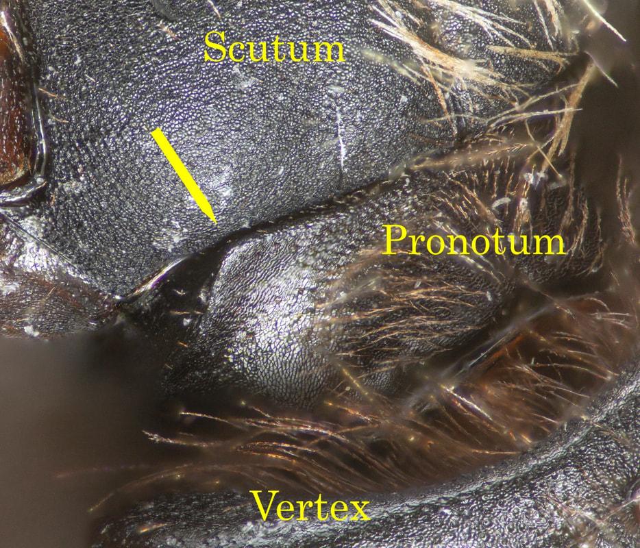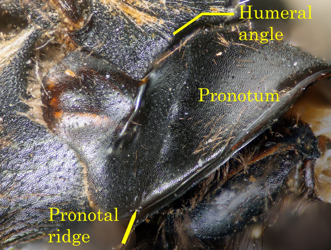 There are two important characters, particularly useful in discriminating subgenera. The humeral angle is akin to the shoulder when viewed from in front. The pronotal ridge is a "ridge extending down from humeral angle." These pronotal characters are difficult to evaluate, often obscured from clear view by the head and hairs. Removing heads of low quality specimens is a good approach to understanding this character.