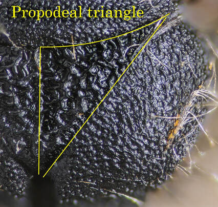 9) Propodeum: Posterior thorax, facing the abdomen, with a roughly triangular enclosure posterior to the scutellum |