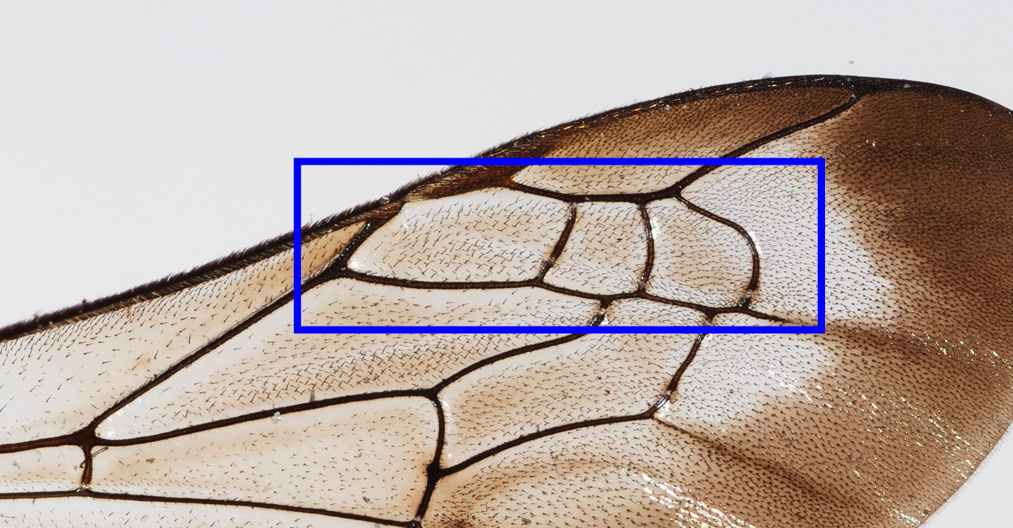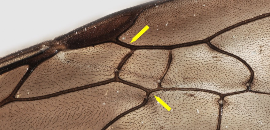 Upper arrow is the r vein, which is long - length = 4 vein widths. Lower arrow is the position at which vein m-cu meets the second submarginal cell. In this case, ~3/4 of the way distal to the base of the cell.
